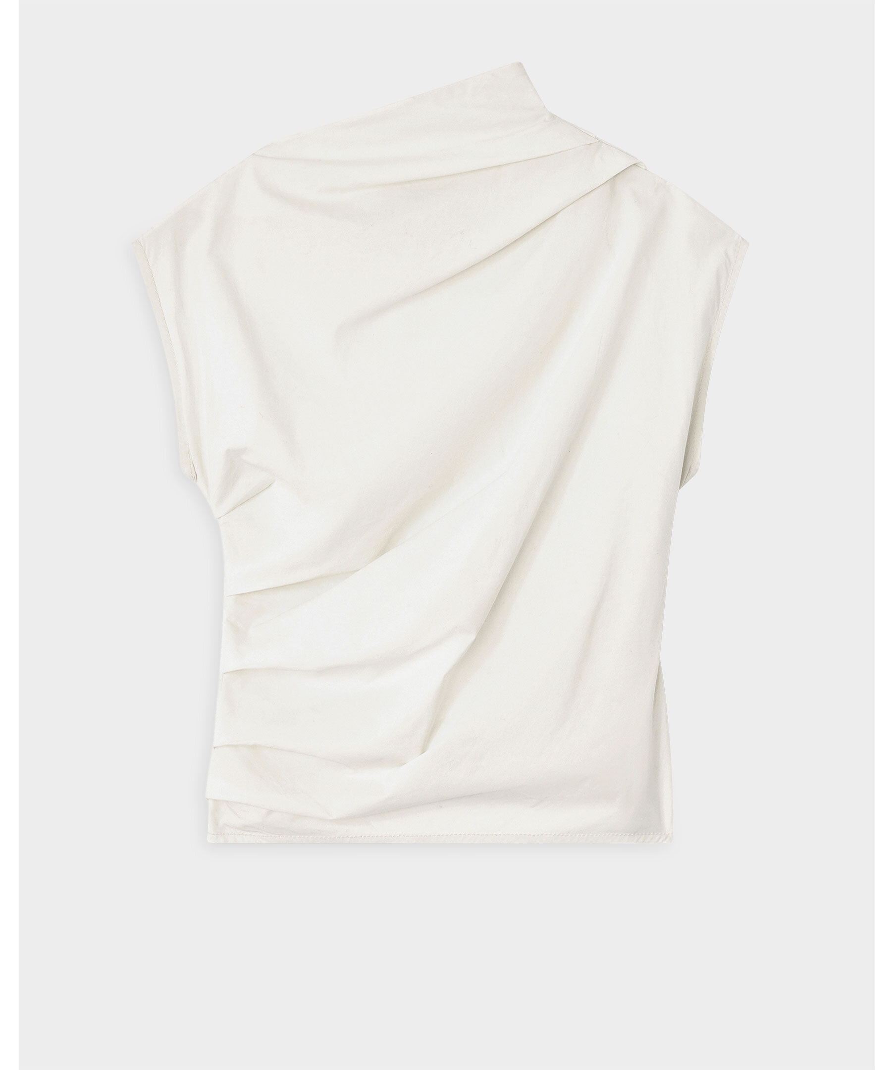 Elfenbensfärgad rynkad topp från GANNI. Tillverkad i 97 % ekologisk bomull och 3 % elastan. Toppens design inkluderar en asymmetrisk halsringning, ärmlös stil och en rynkad effekt i sidan. Den smala passformen ger en elegant siluett. Perfekt för både vardag och fest.