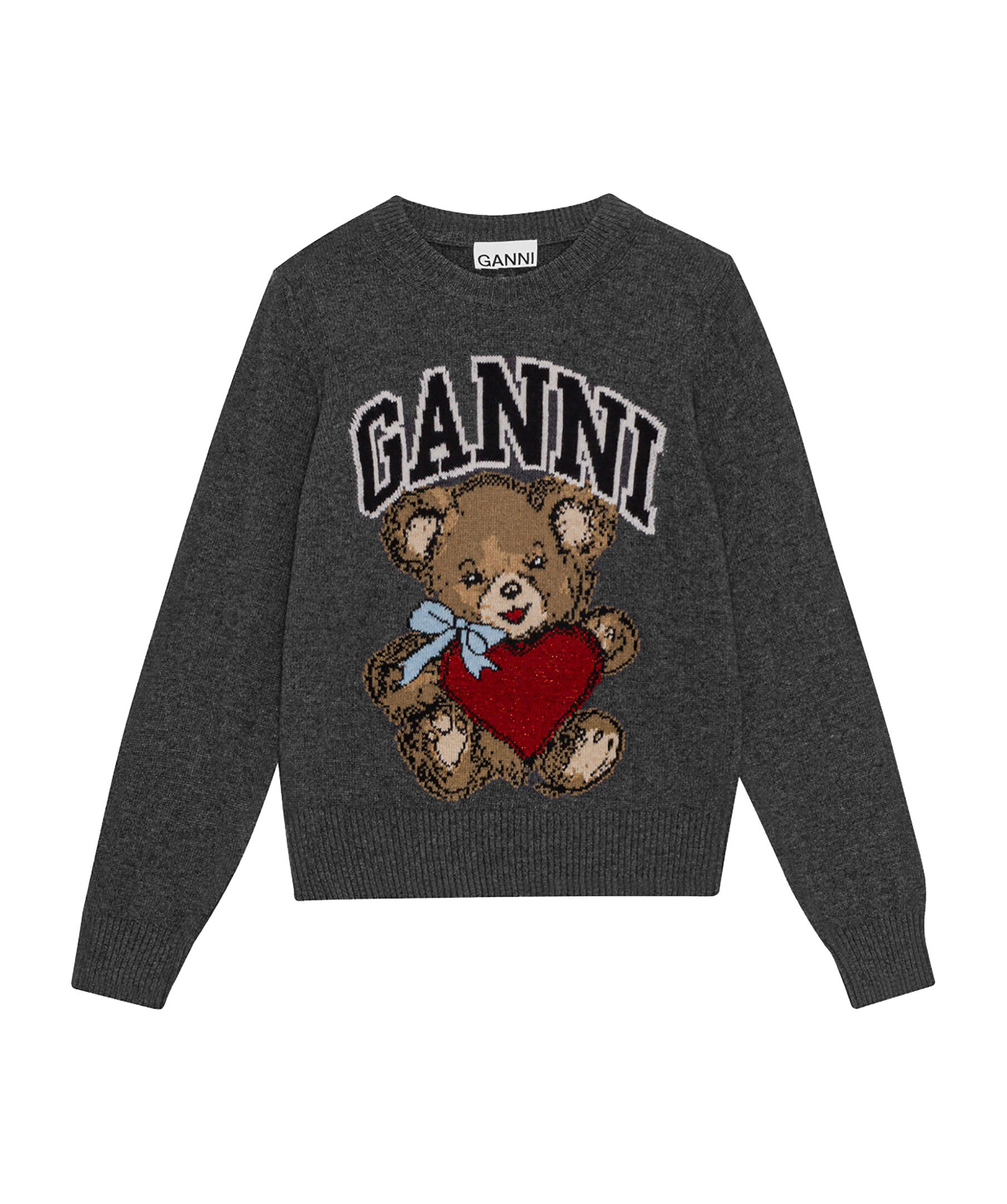 Mörkgrå stickad tröja från Ganni. Tröjan har en rund ribbstickad halsringning samt ribbstickade muddar vid ärm- och plaggslut och ett stickad björnmotiv med logotyp på framsidan. Tillverkad i en ullblandning.