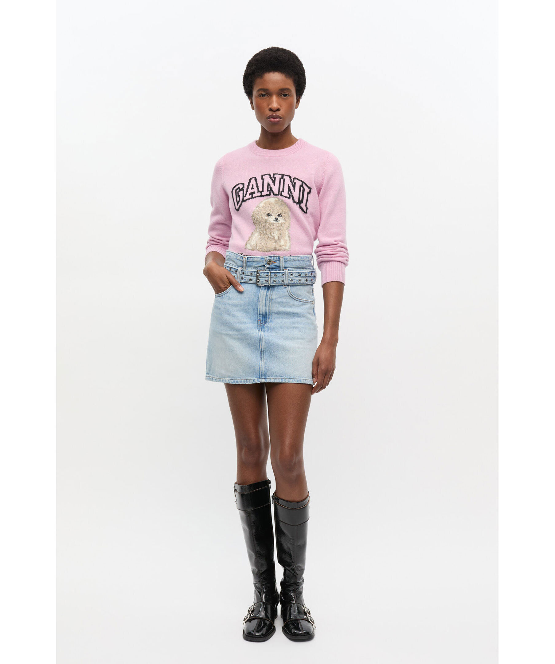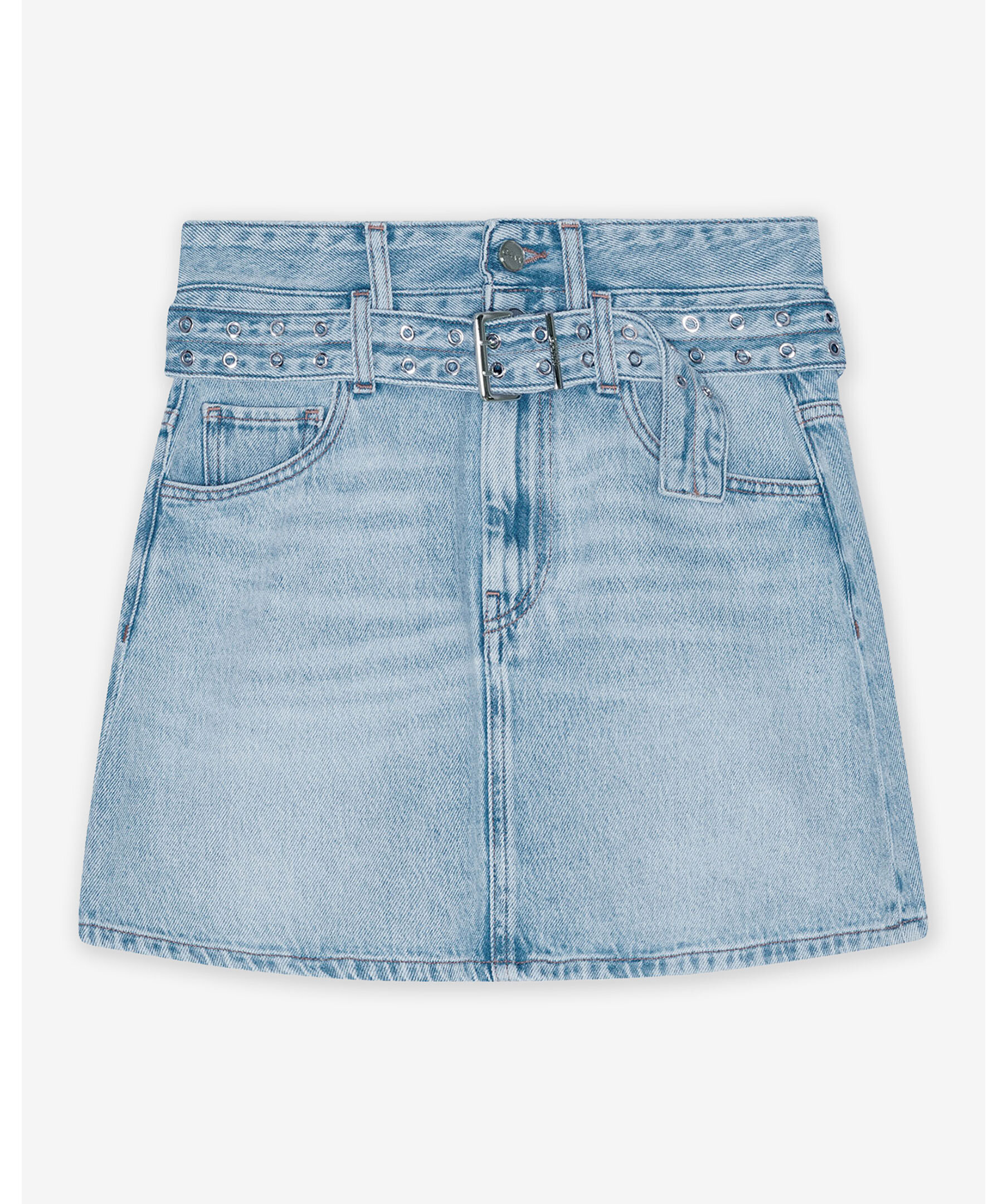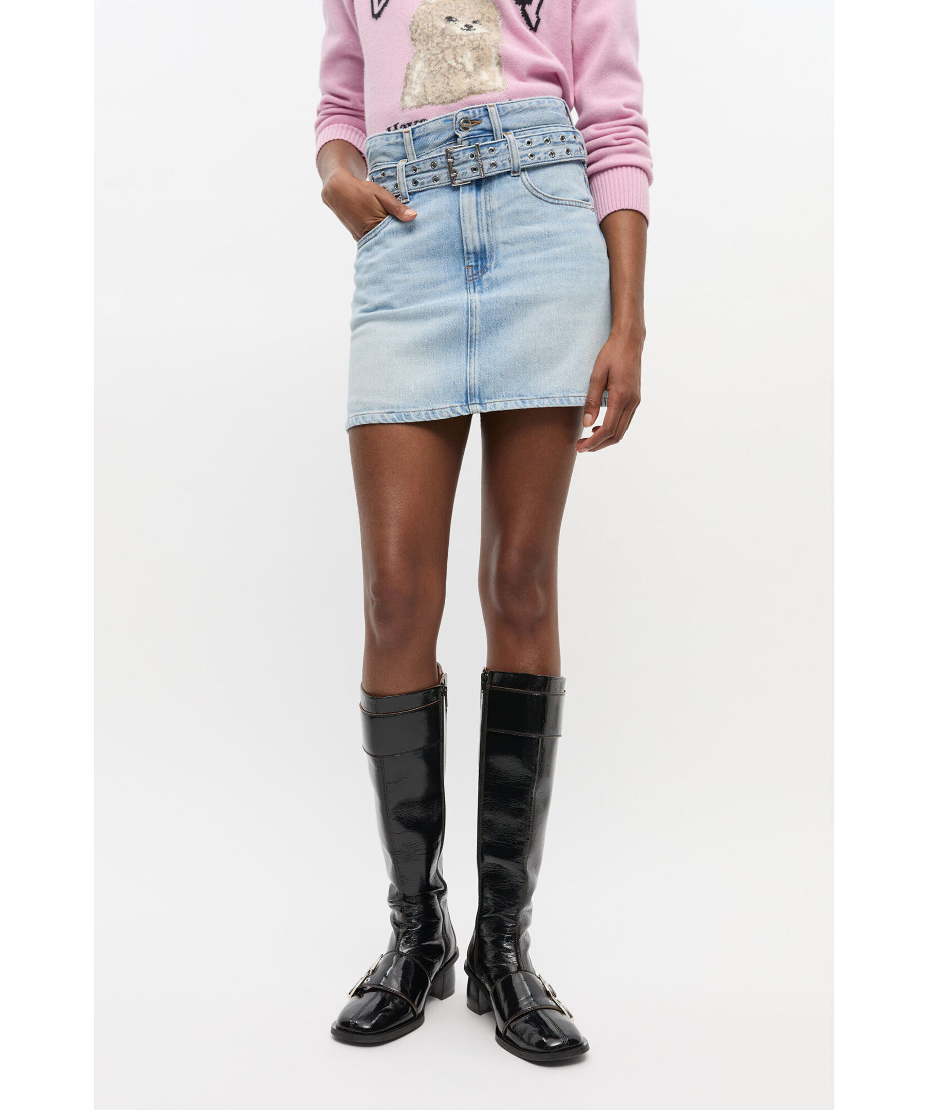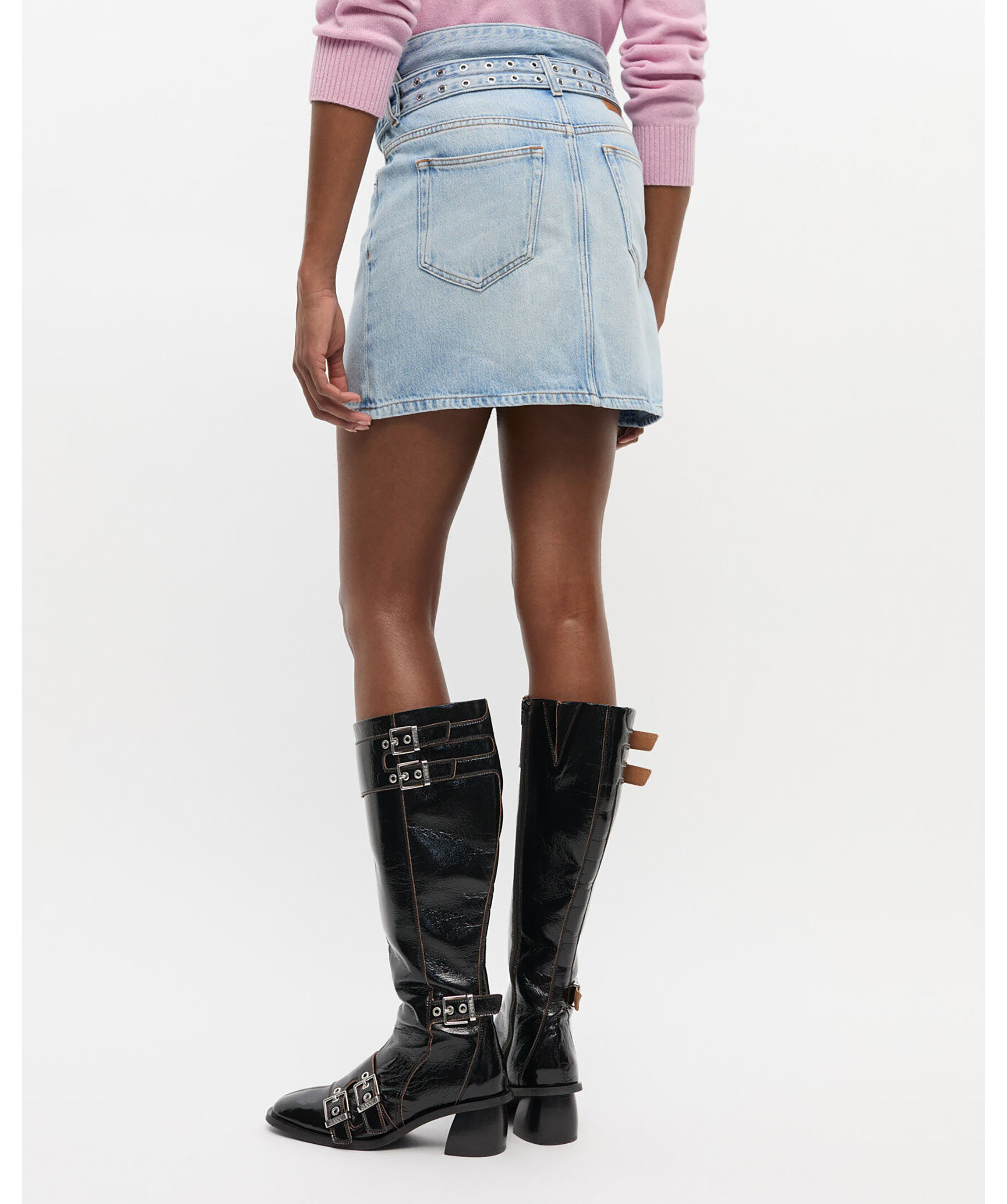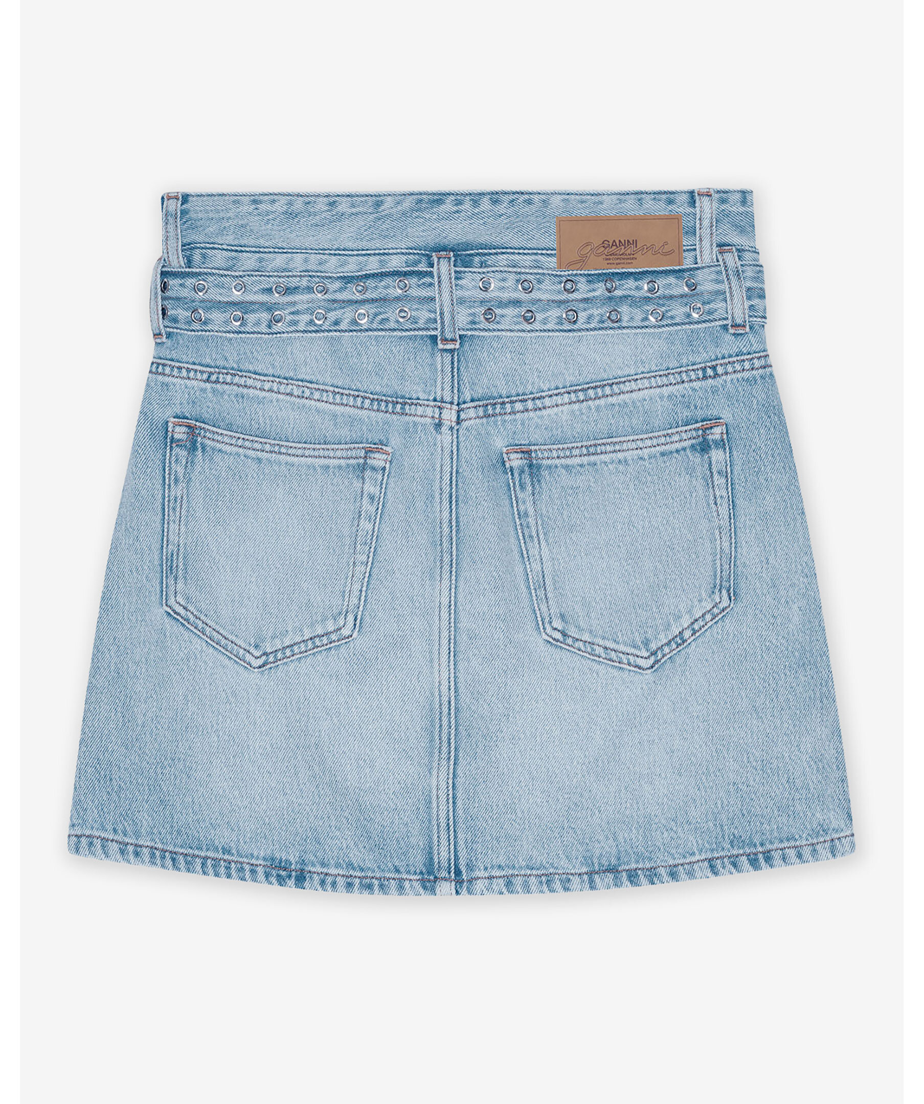 Ljusblå, kort jeanskjol från GANNI. Gjord i en stentvättad finish, dubbelt bälte med metallöljetter och har en klassisk femficksdesign med dragkedja och knäppning framtill. Modellen är 180 cm lång och bär storlek 36