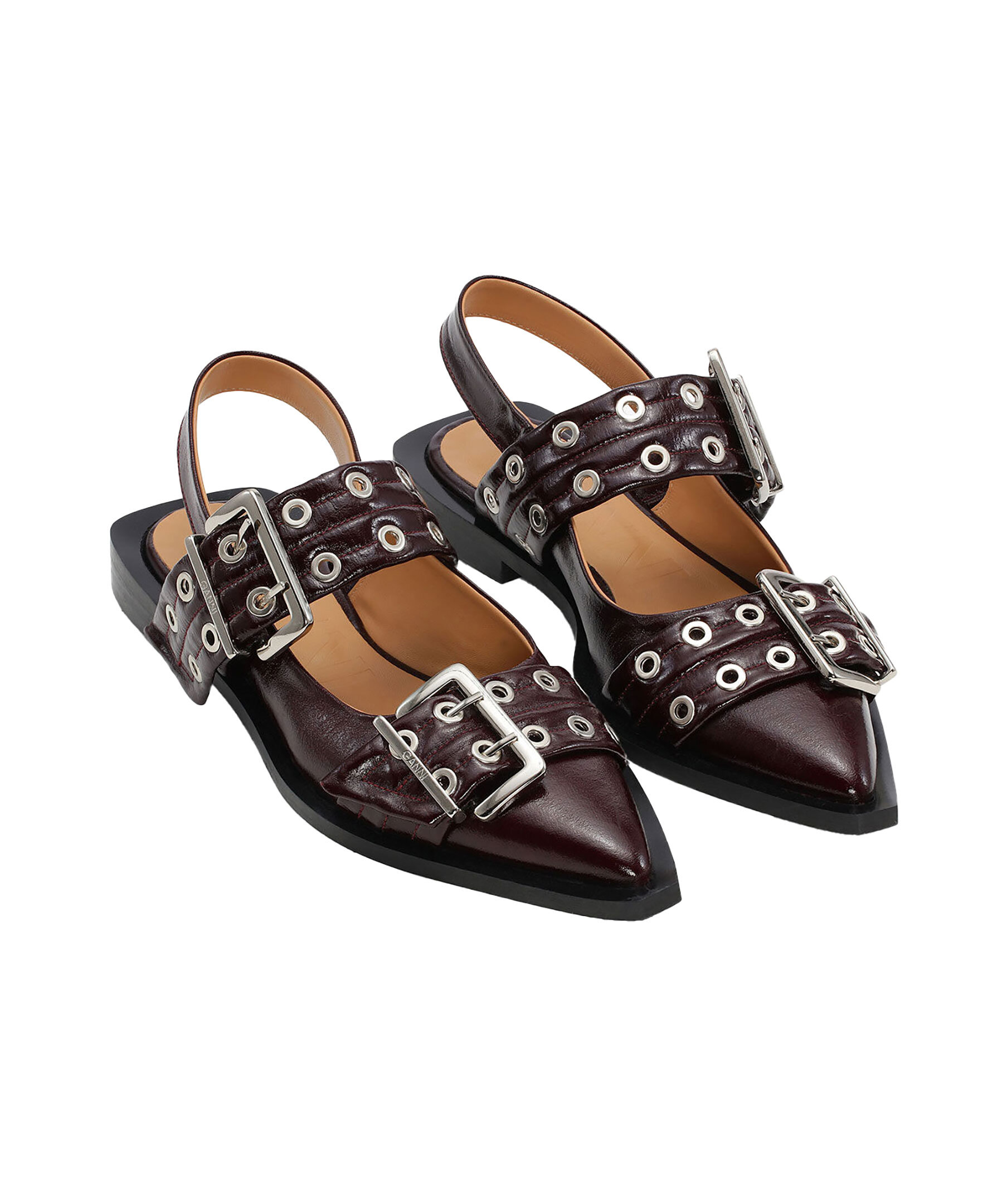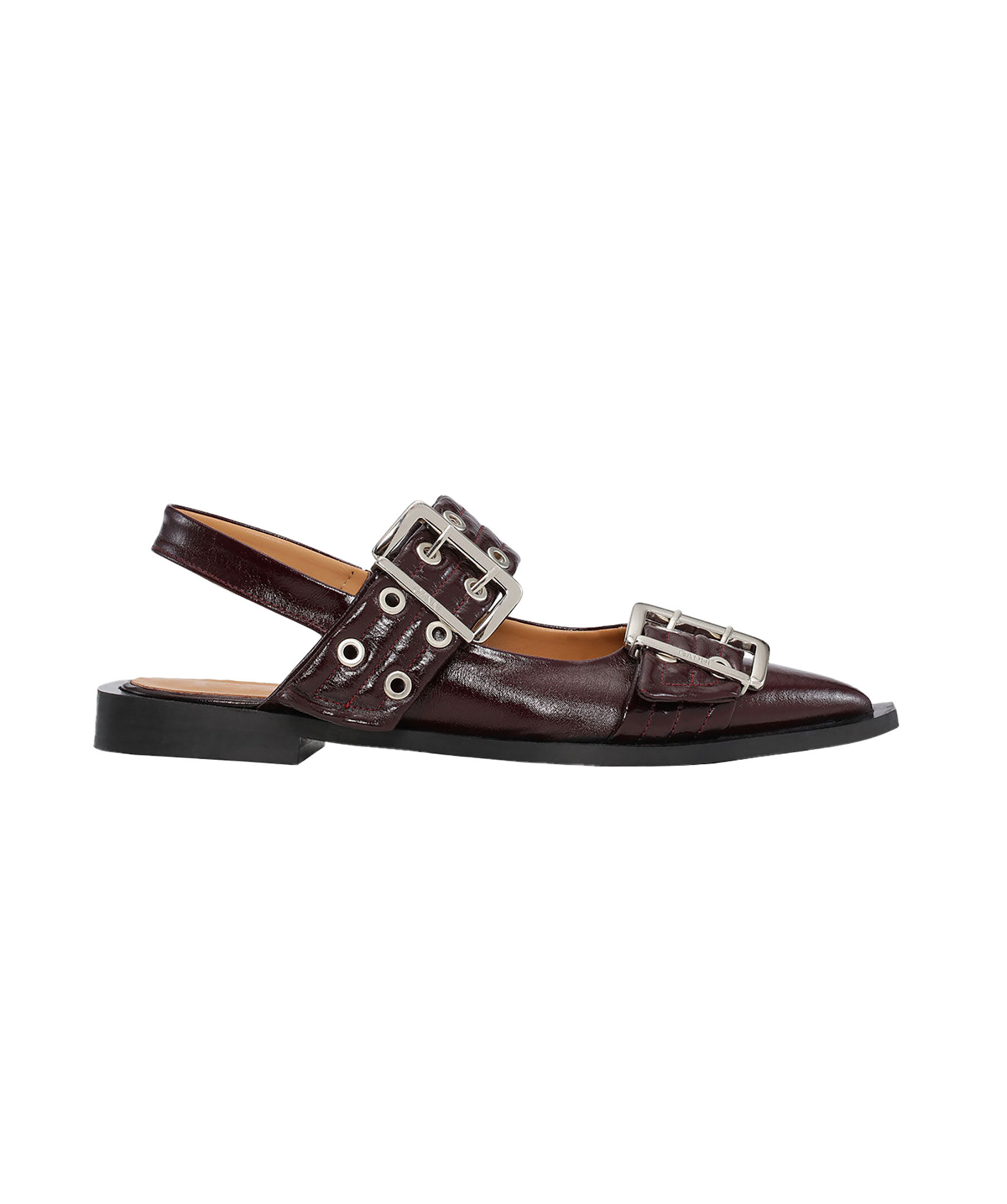 Vinröda ballerinaskor från Ganni. Skorna har slingback stropper och en spetsig tå, två silverfärgade spännen med matchande håldetaljer och en svart fyrkantig blockklack. Tillverkade i polyester.