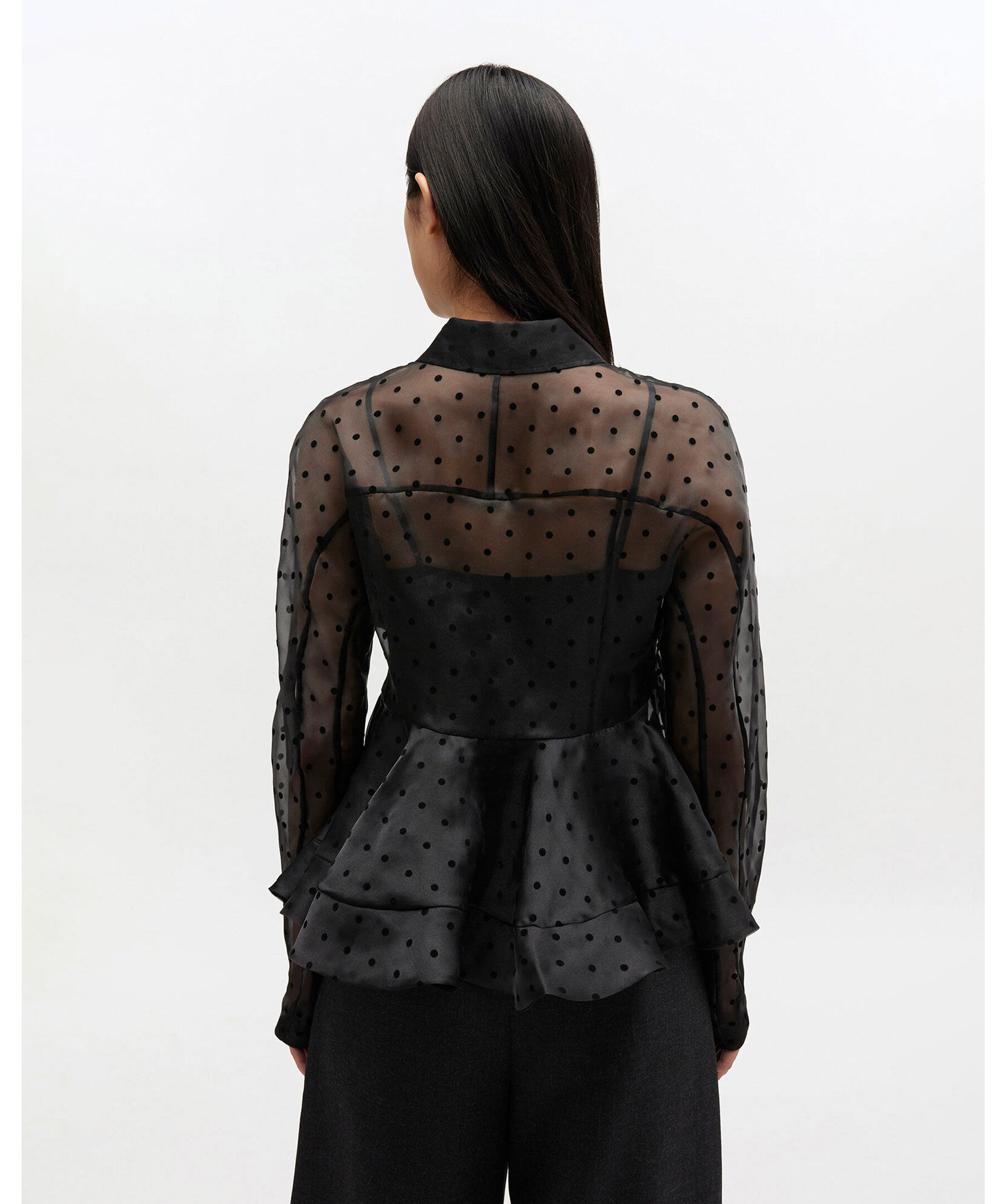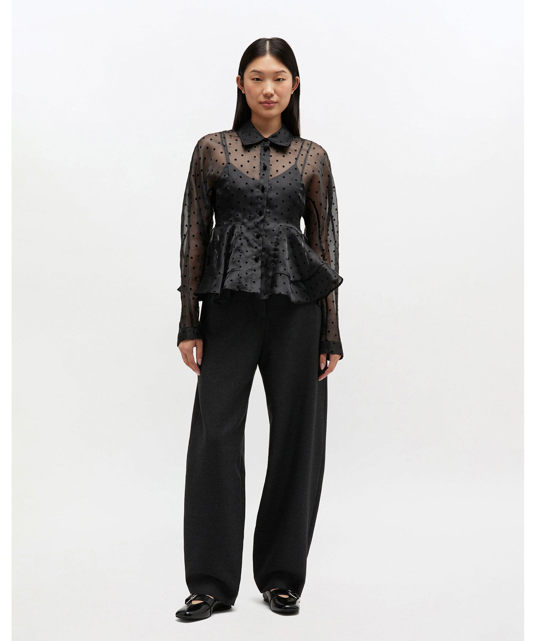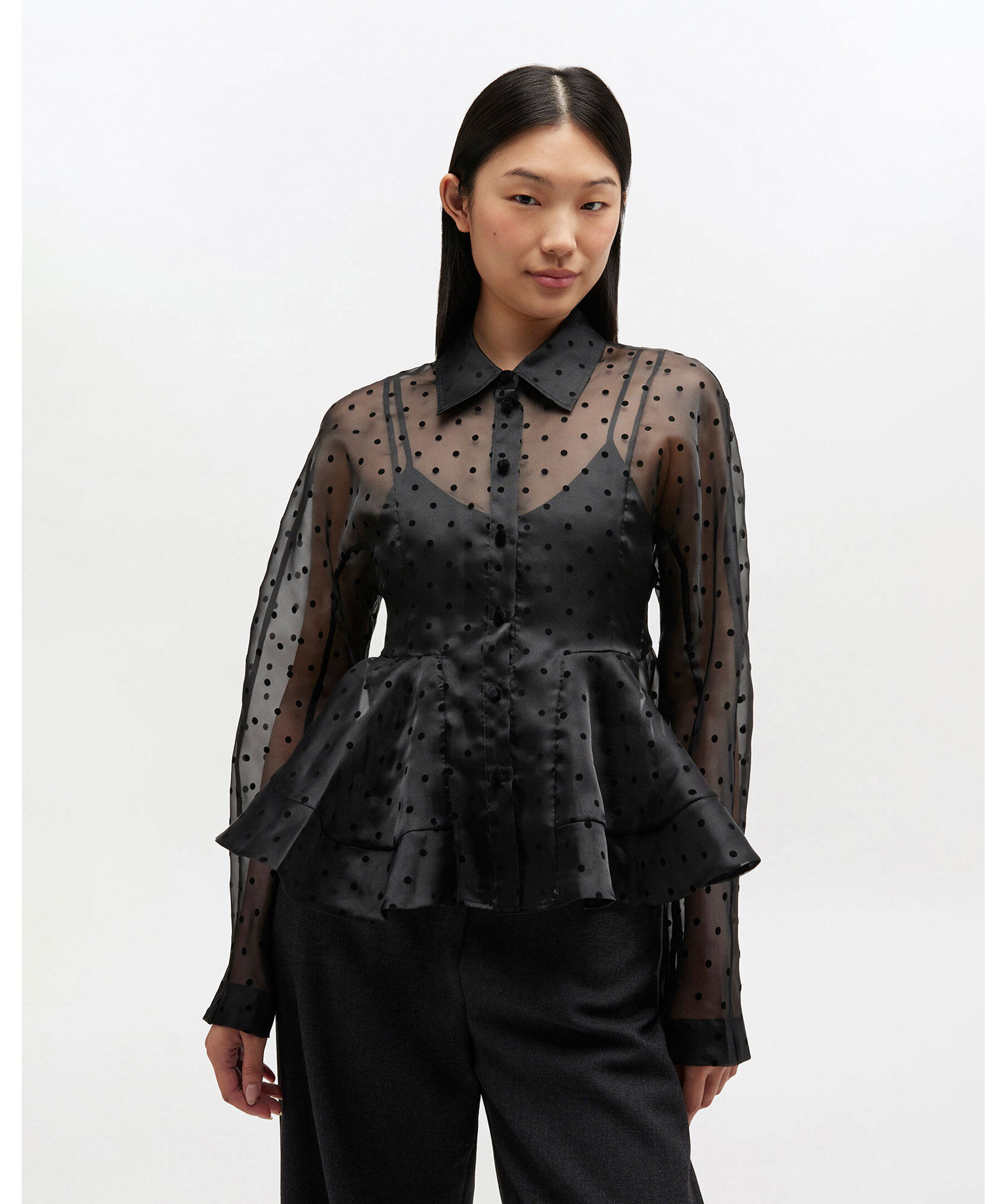 Svart peplum-skjorta i organza från GANNI med klassisk skjortkrage, knäppning framtill och böjda ärmar som skapar en feminin silhuett med subtil volym. Perfekt som elegant bas i både vardagsspel och festliga outfits.
