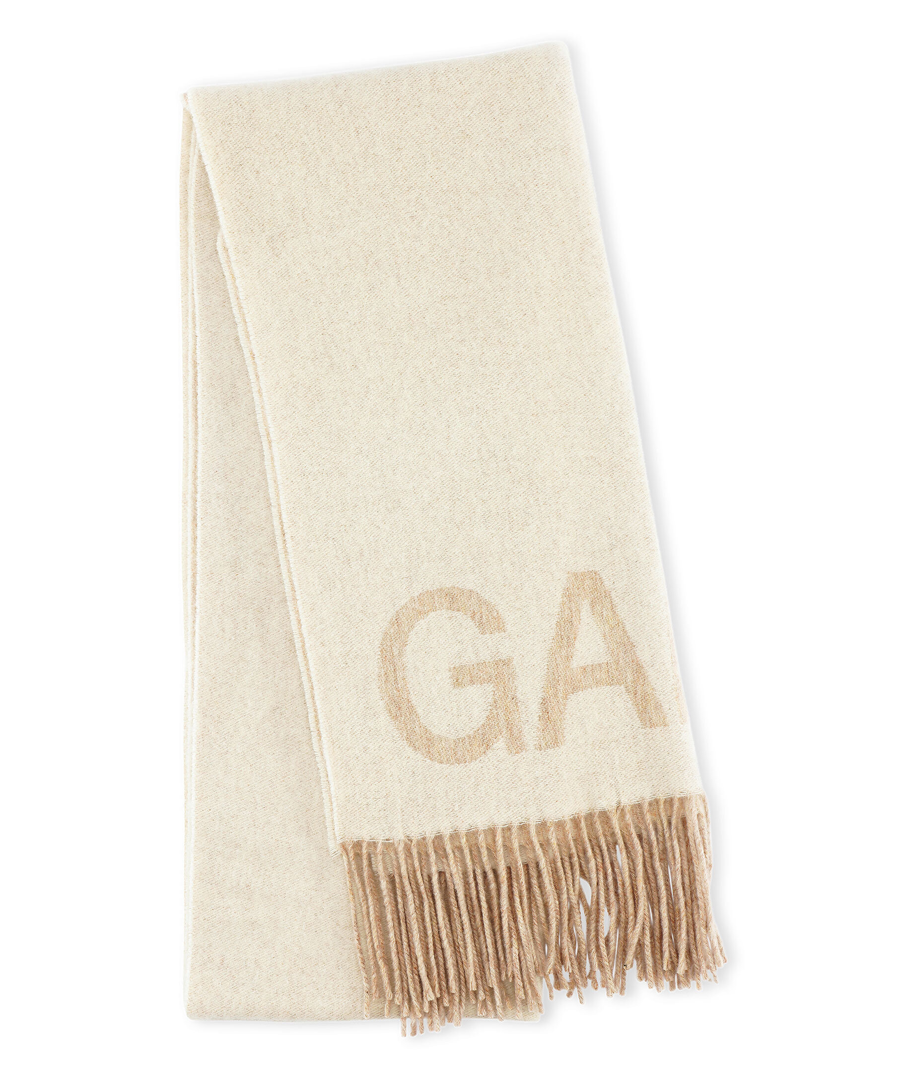Beige vävd halsduk från Ganni. Tillverkad i 100% återvunnen Ull. Stor logotyp och fransar i kanterna.