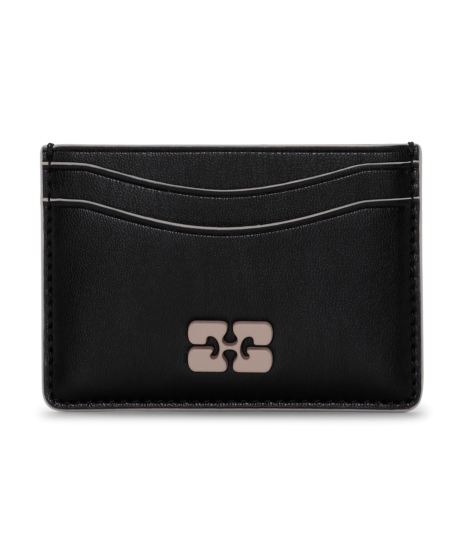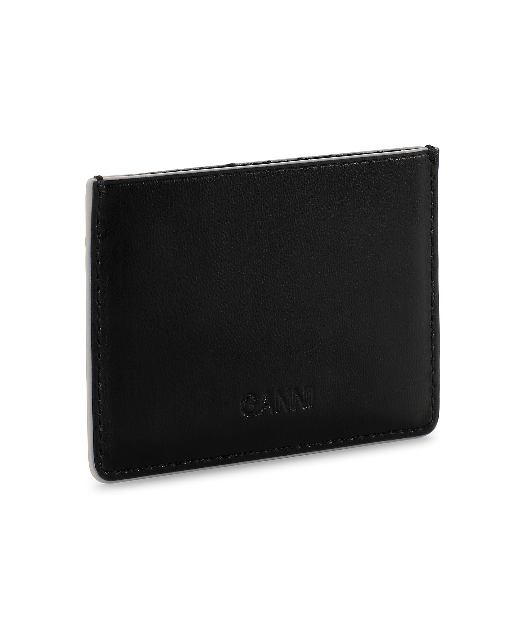 Svart korthållare i läder från Ganni. Tre fack för kort. Logotyp i metall framtill. Embossad logotyp på baksidan. Korthållarens mått: H 6,5 cm B 10 cm.
