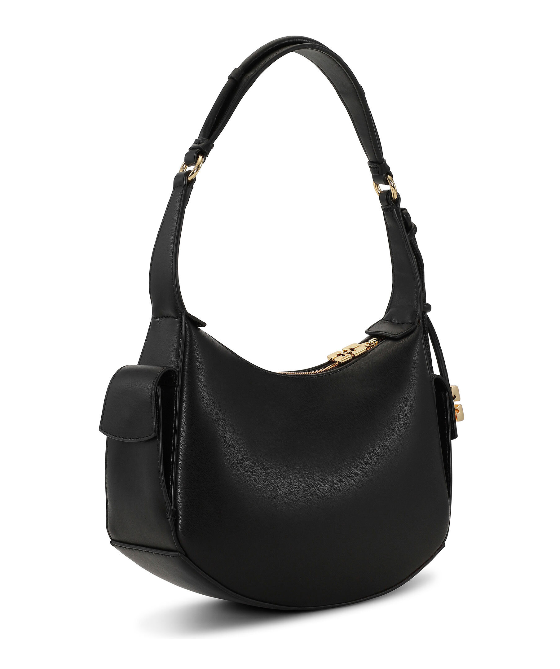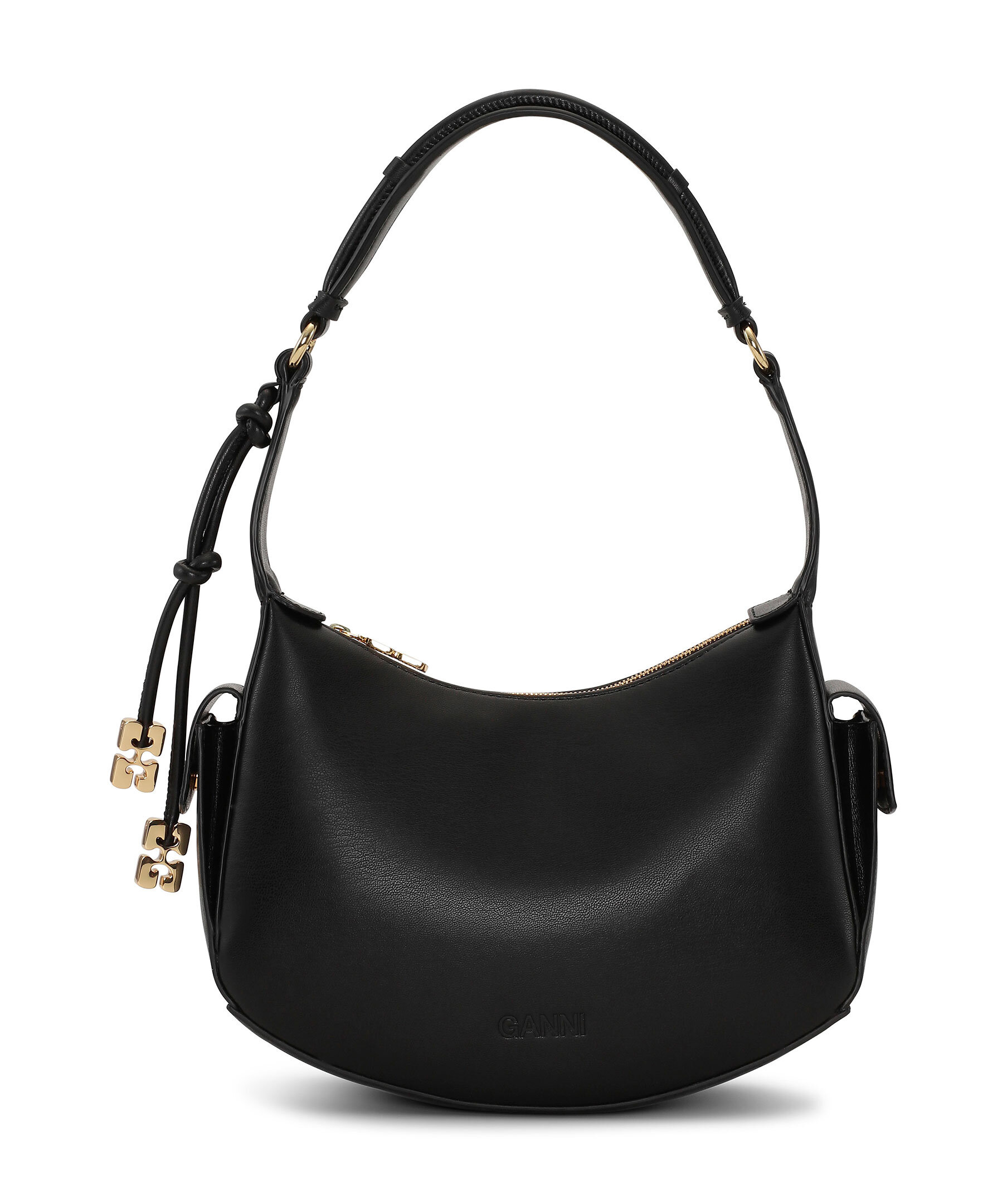 Svart väska från Ganni. Huvudfacket stängs med guldfärgaddragkedja. Två sidfickor med lock. Präglad logotyp på väskans framsida. band med guldfärgade berlocker i metall. Väskans mått: H 17 cm, B 7,8 cm, D 23 cm. Axelremmens längd: 25,5 cm.