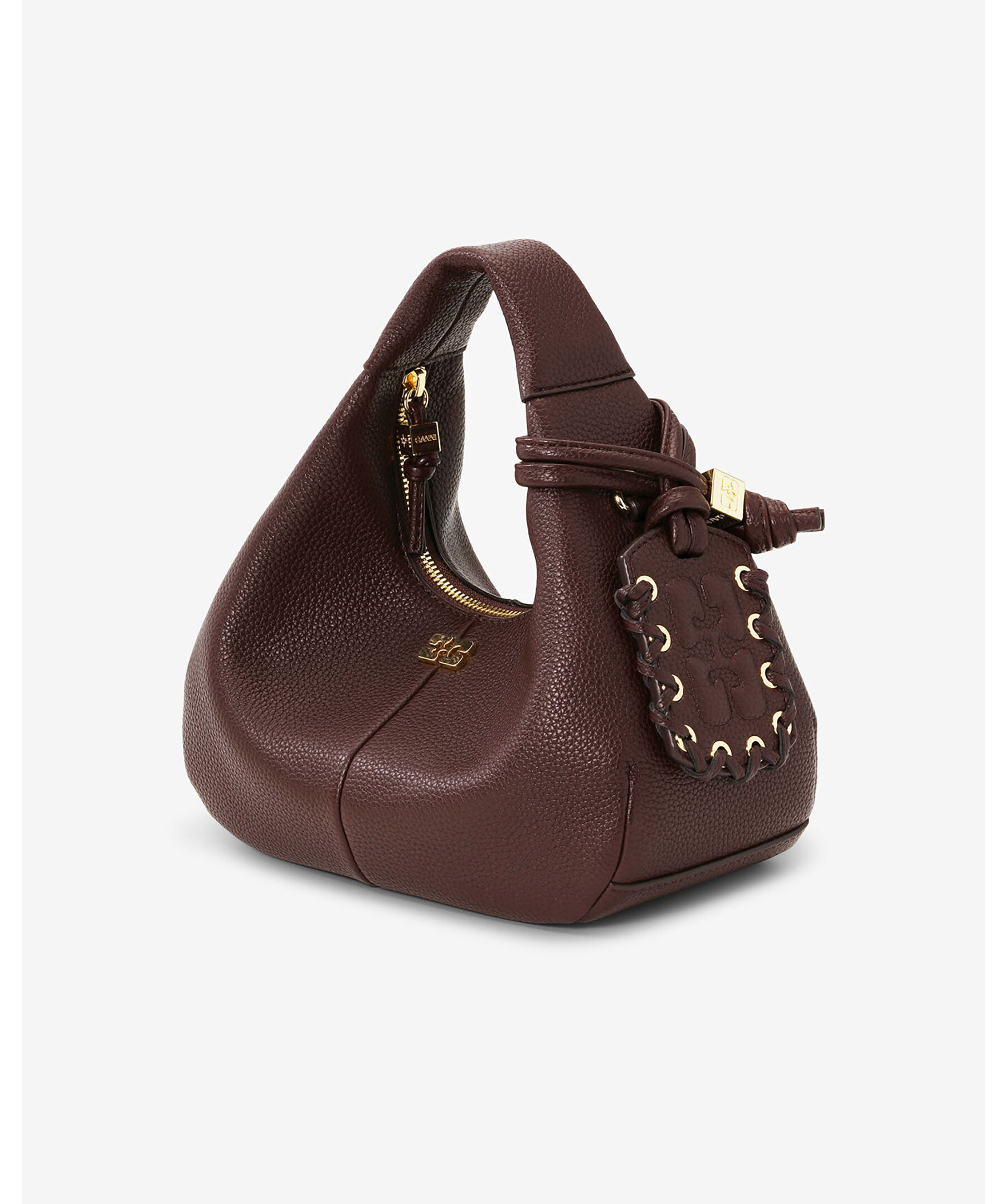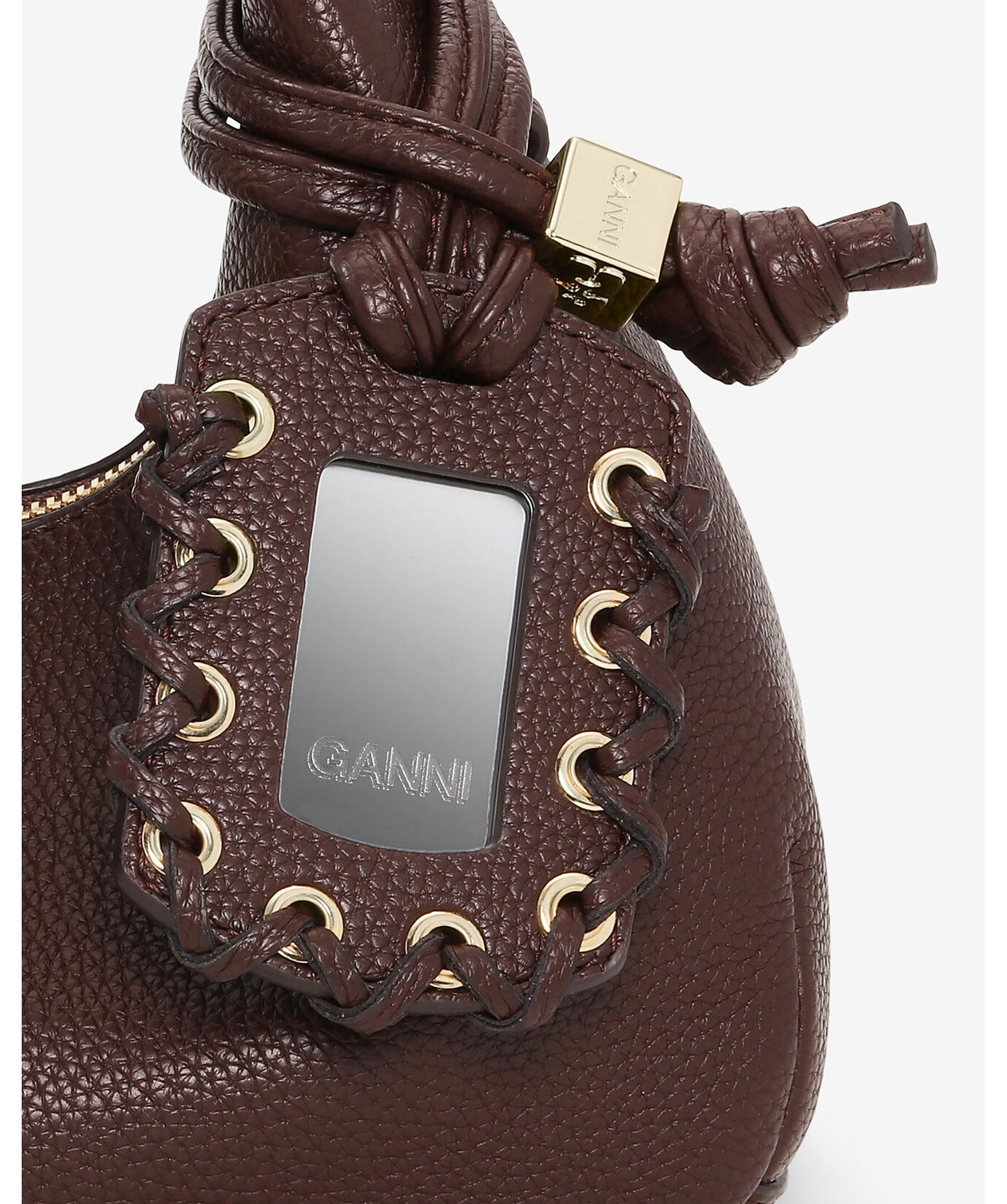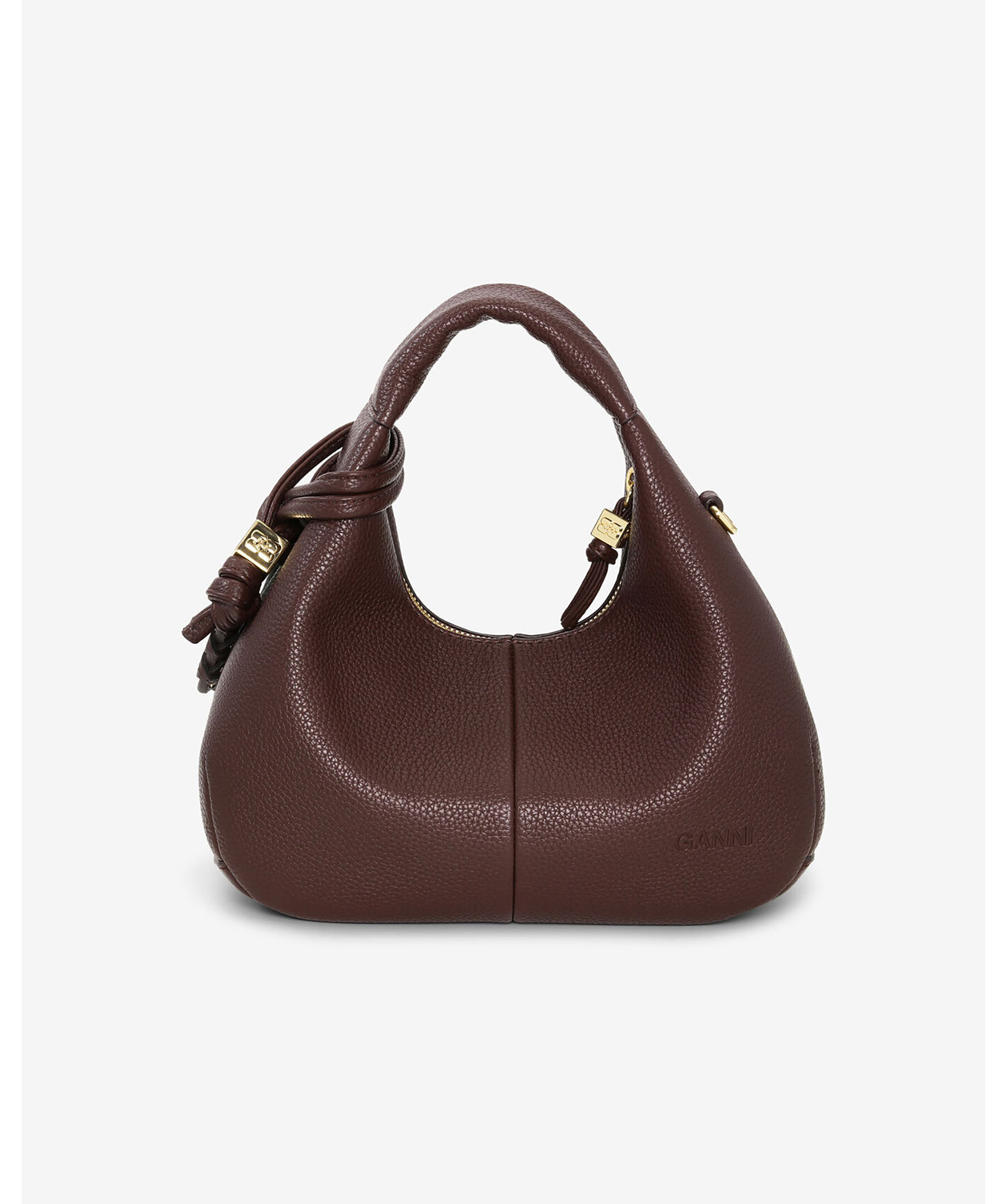 Brun mini hobo-väska från GANNI med struktur och grained finish. Väskan har topphandtag, justerbar/rembar axelrem, dragkedja, intern ficka och guldfärgad logotyp samt dekorativ spegel-hängtag. Väskan är designad för att rymma en iPhone 16 Pro Max, en plånbok, solglasögon, nycklar och ett läppstift.