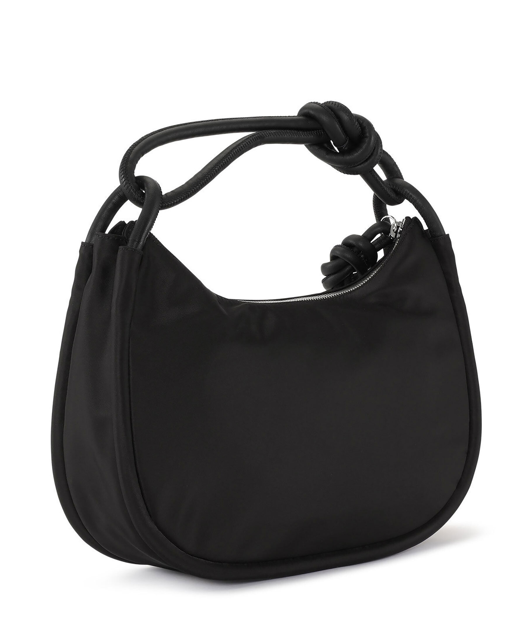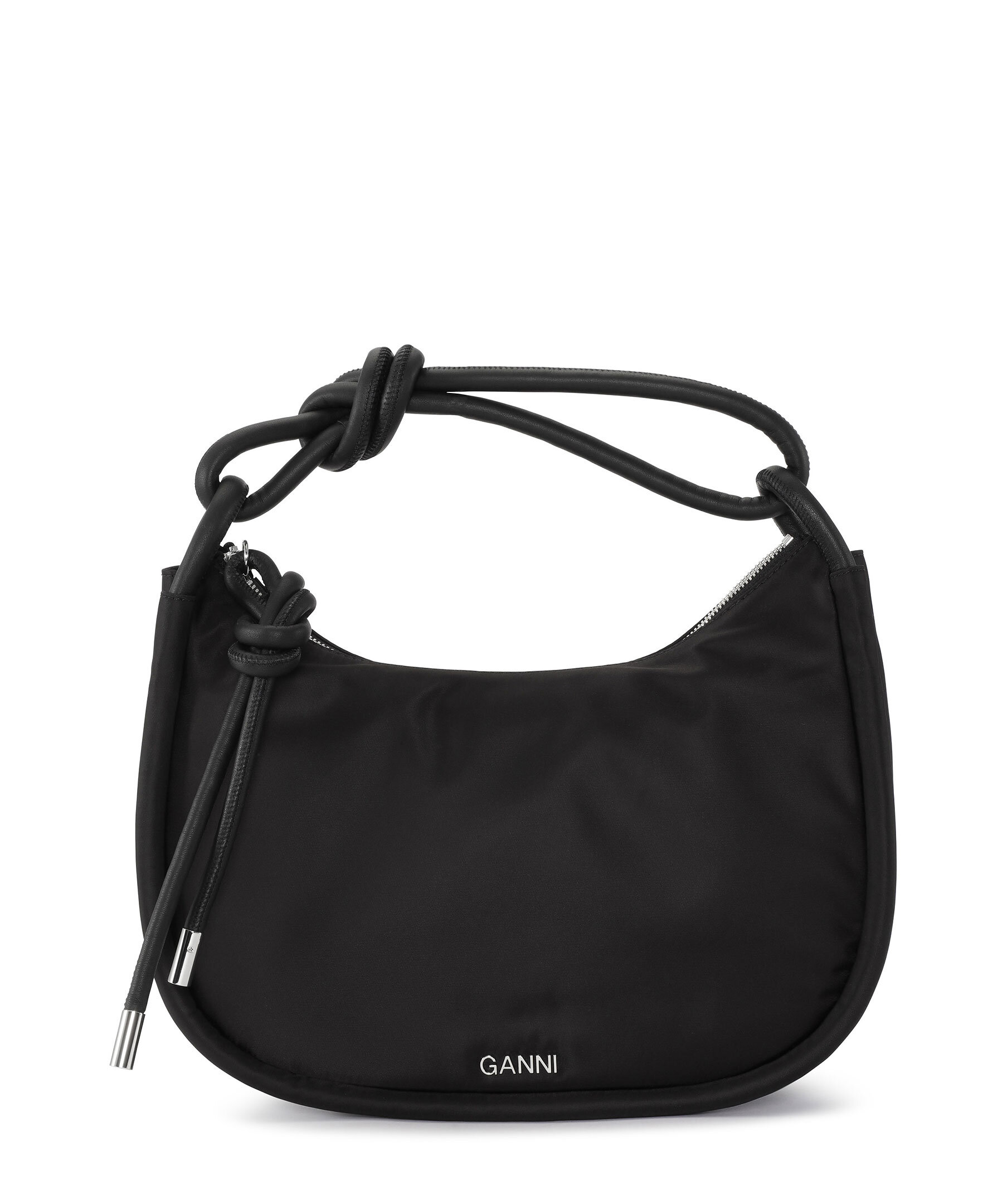 Svart väska med Knot från Ganni. Avtagbar rem, knutna topphandtag, en dragkedja samt en logotyp i silver framtill.