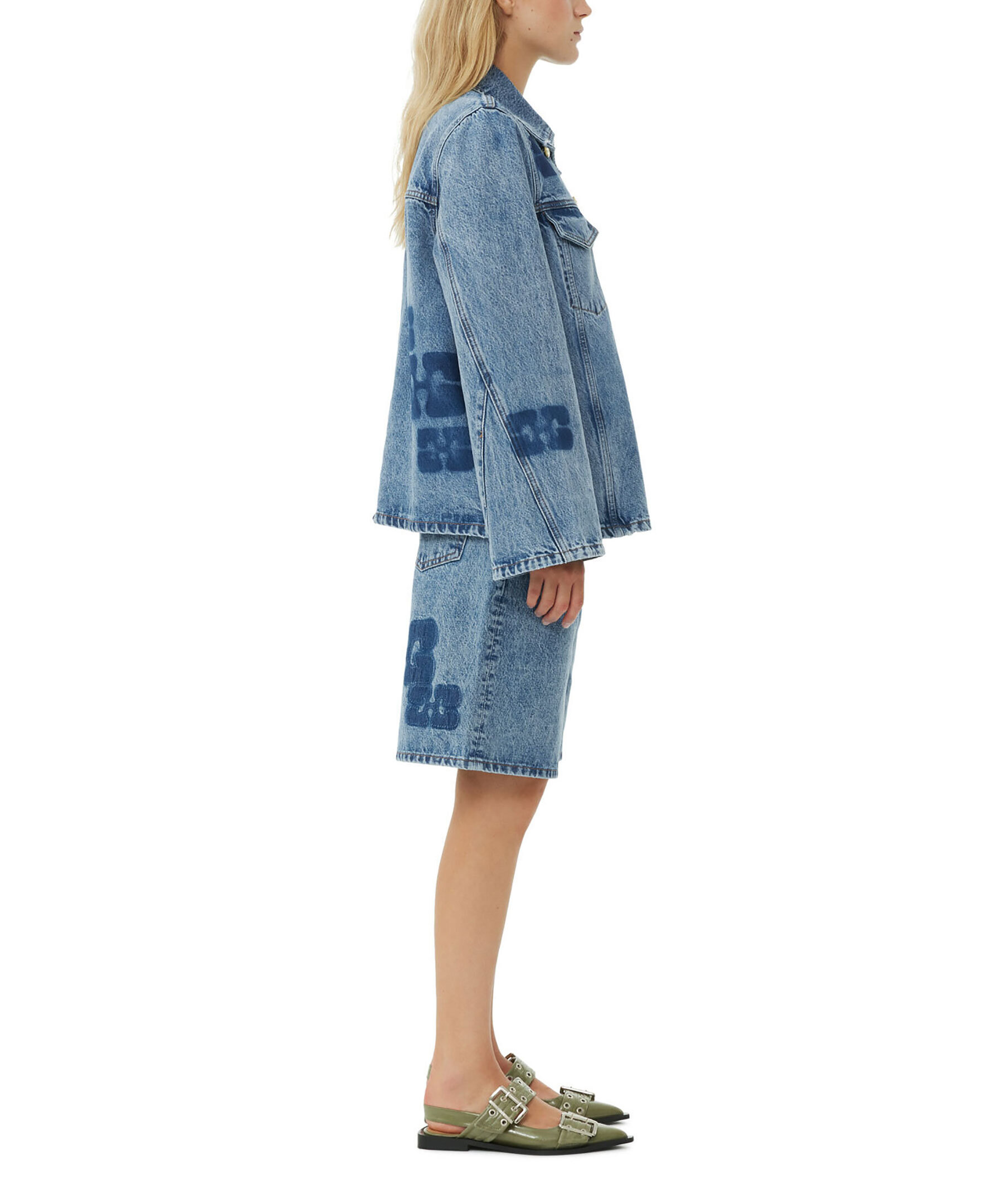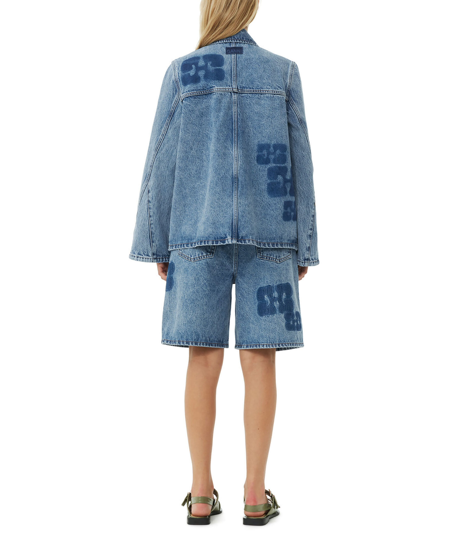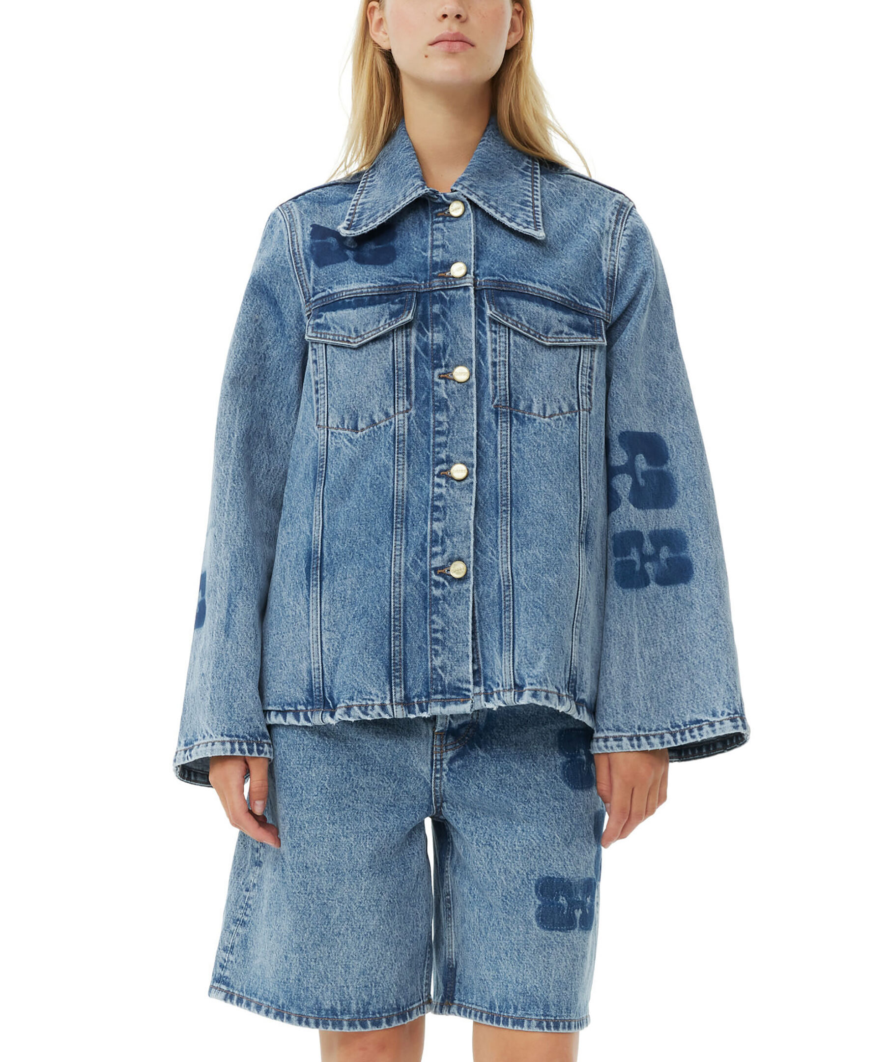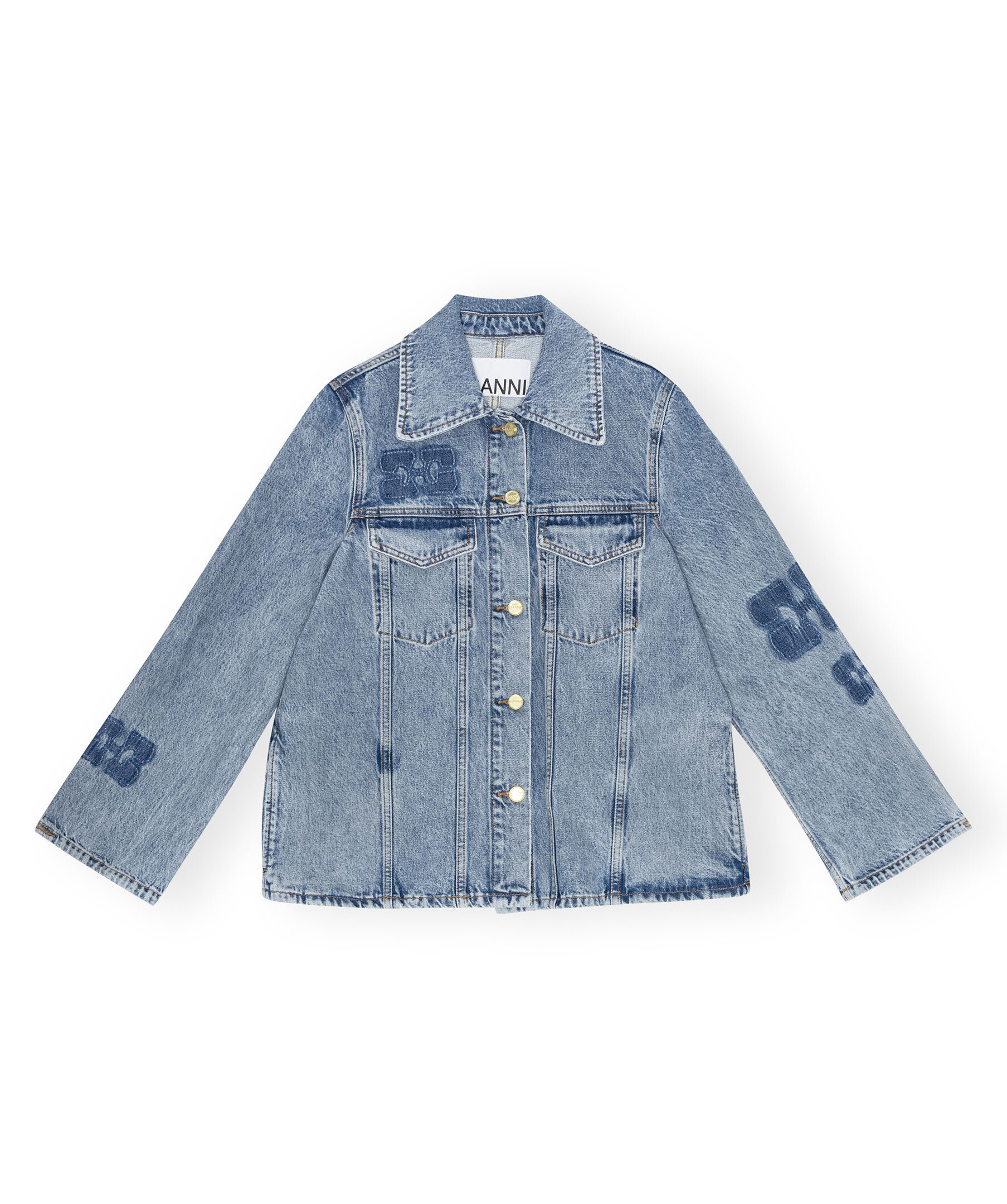 Blå jeansjacka från Ganni med vida ärmar och patch-logotyper utspridda över hela. Jackan stängs med knäppning framtill och har två bröstfickor. Designad för en avslappnad passform. Medelvikt, icke-stretch styv denim. Tillverkad i 100% bomull.