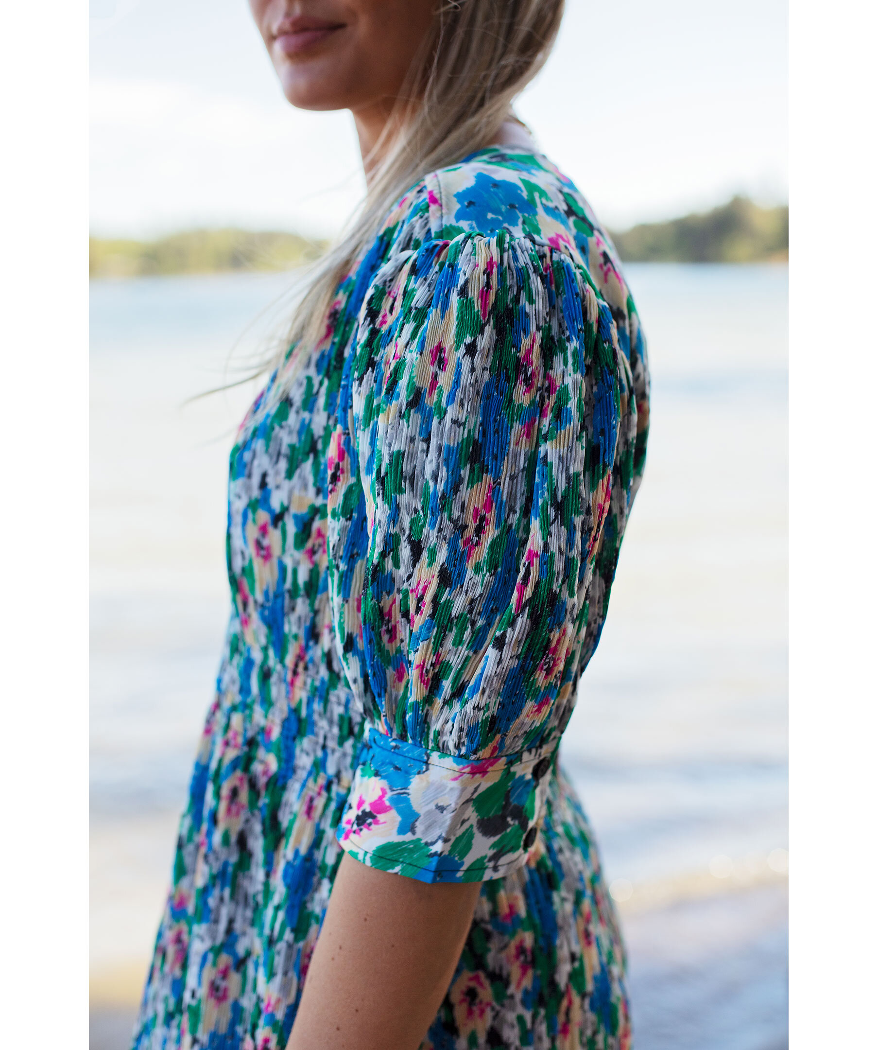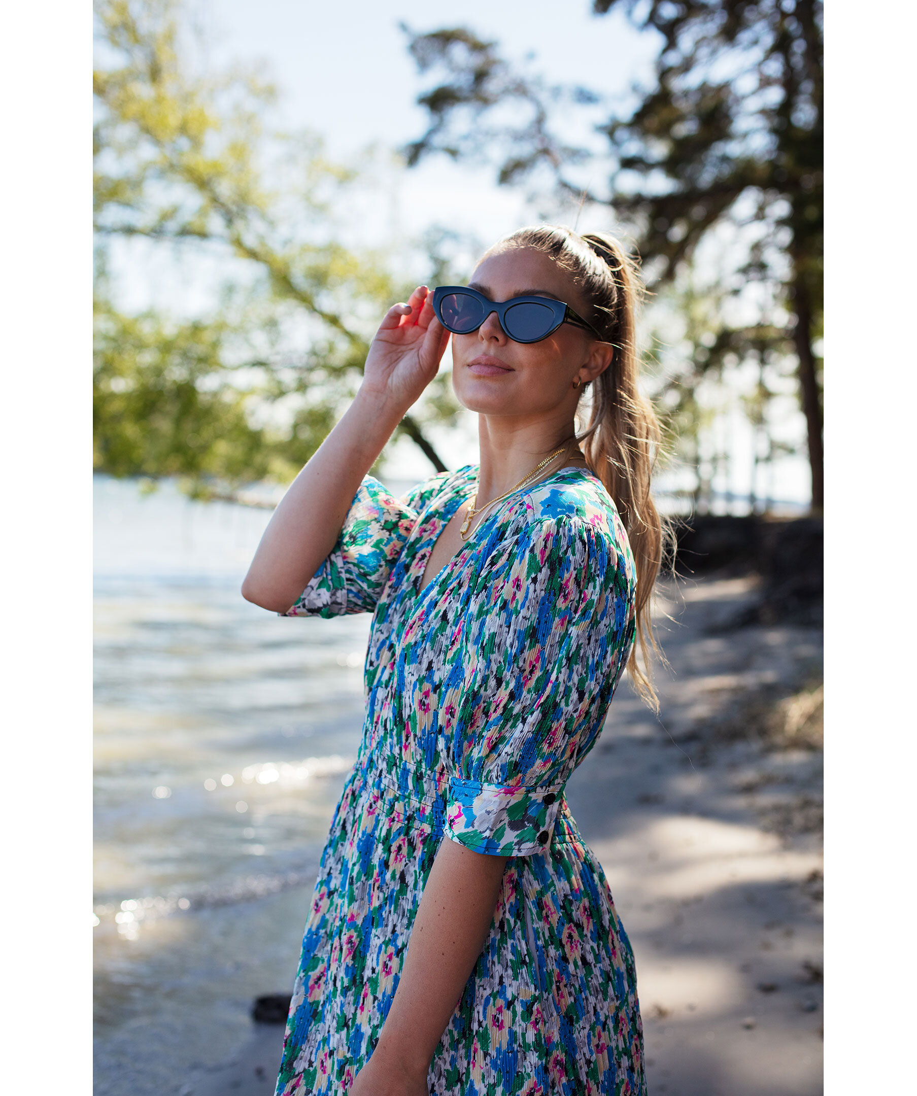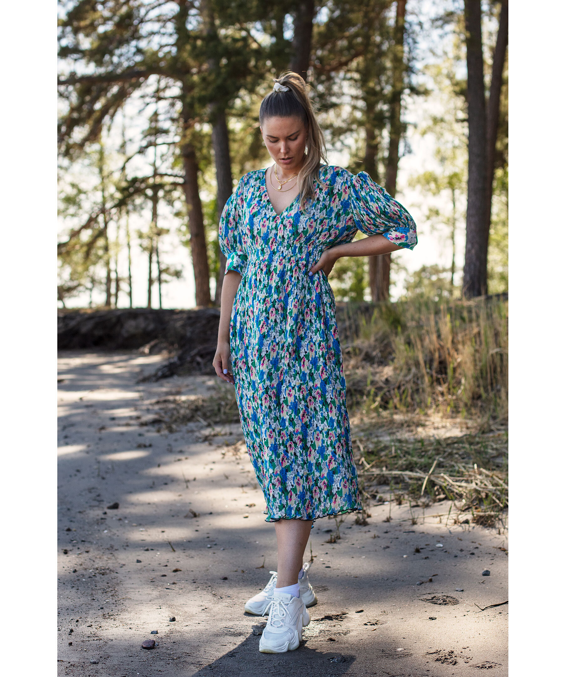 Blå och multifärgad mönstrad klänning med plisserat tyg från Ganni. Avslappnad passform, v-ringad fram och har en puffärm. Smock under bröstet och slutar i början på vaden. Klänningen är stor i storlek, vi rekommenderar att man går ner en storlek. Modellen är 175cm lång och har på sig storlek C36.
