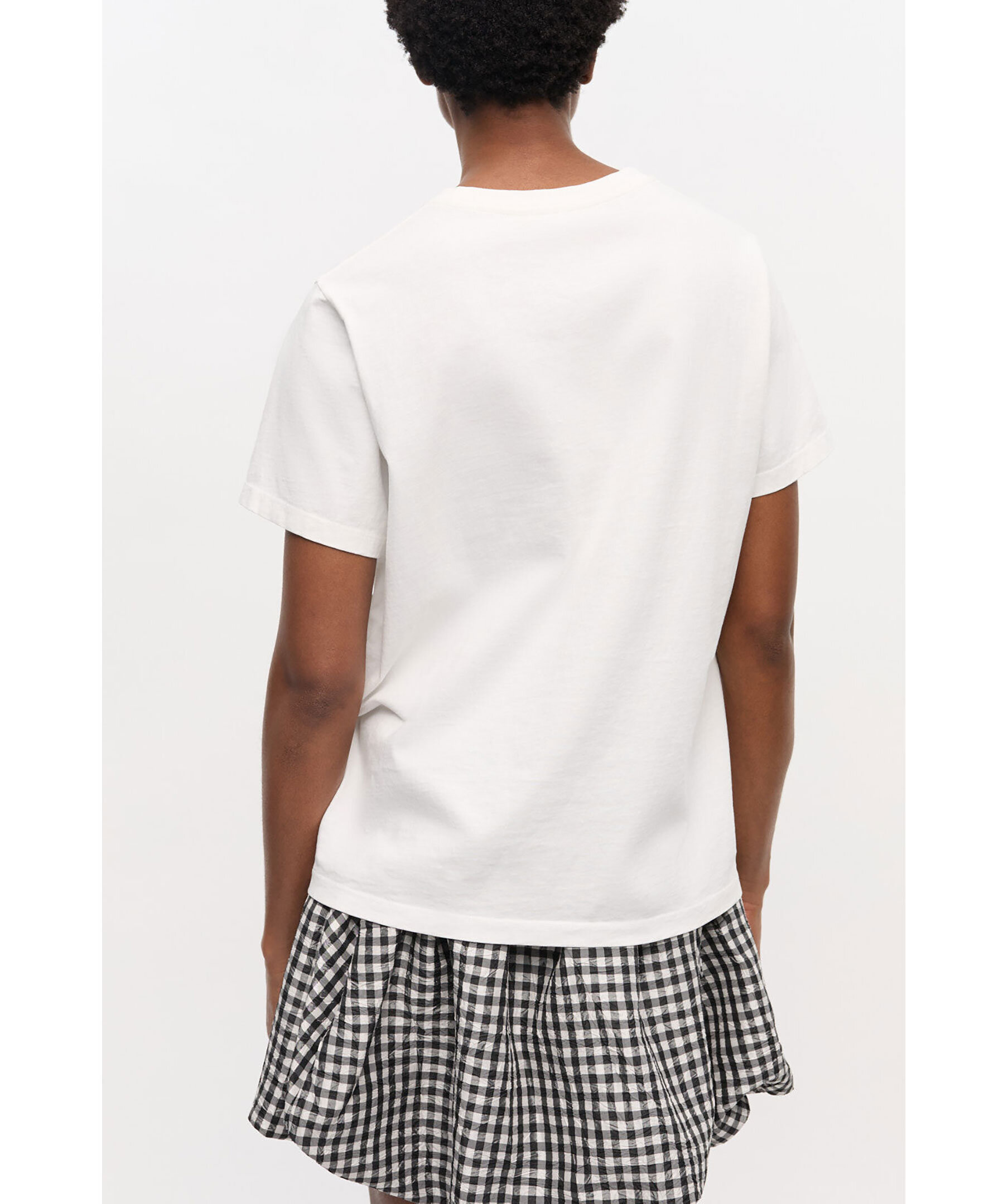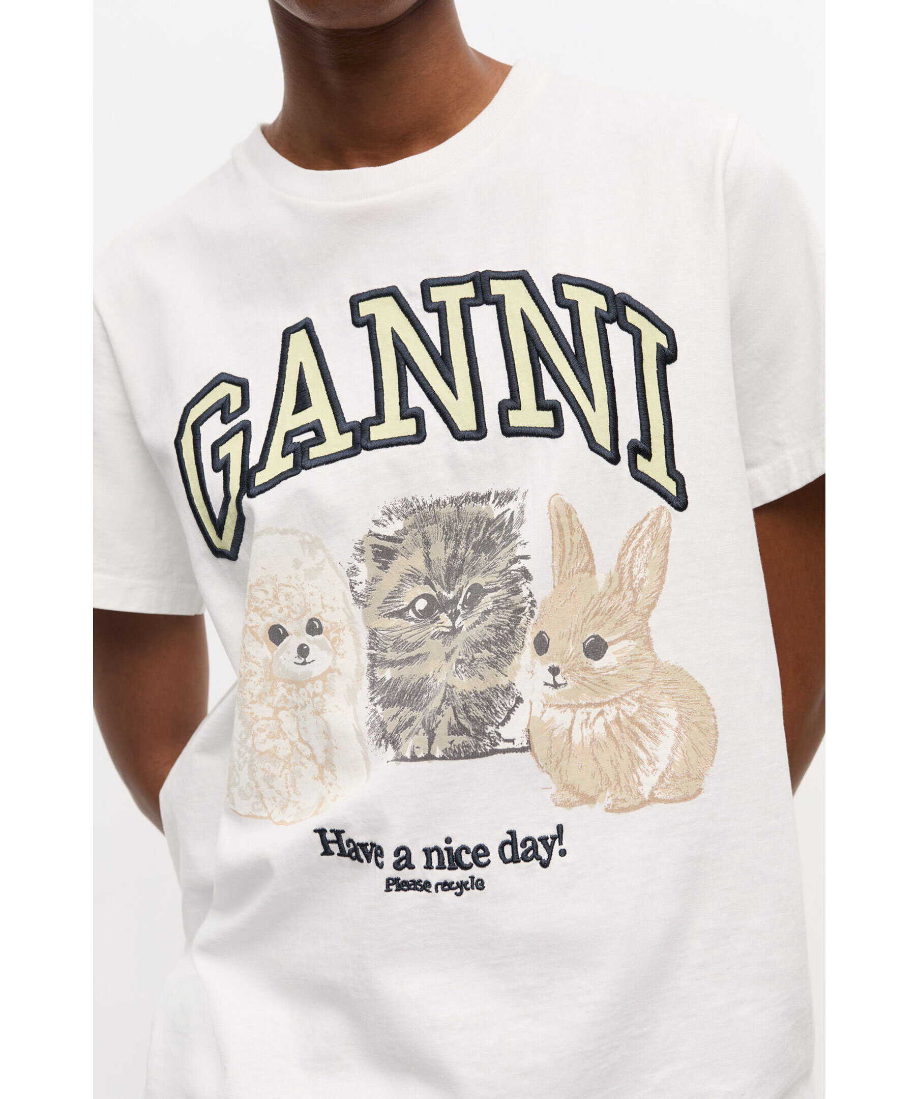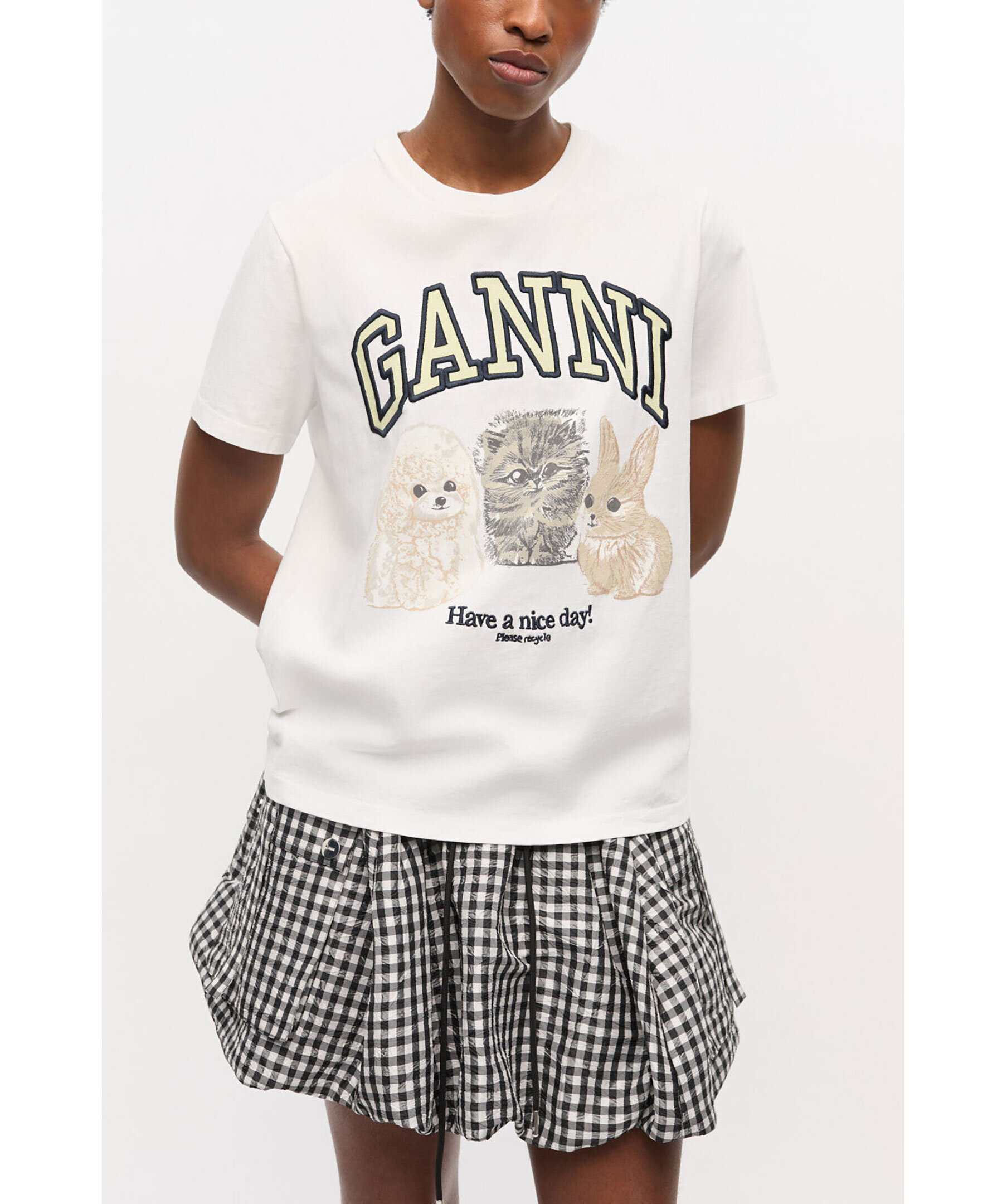 Vit t-shirt från Ganni med tryck. T-shirten har rundad halsringning, korta ärmar, Ganni logotyp samt ett djurmotiv med en hund, katt och kanin på framsidan, och en ”Have a nice day! Please recycle!". Tillverkad i ekologisk bomull.
