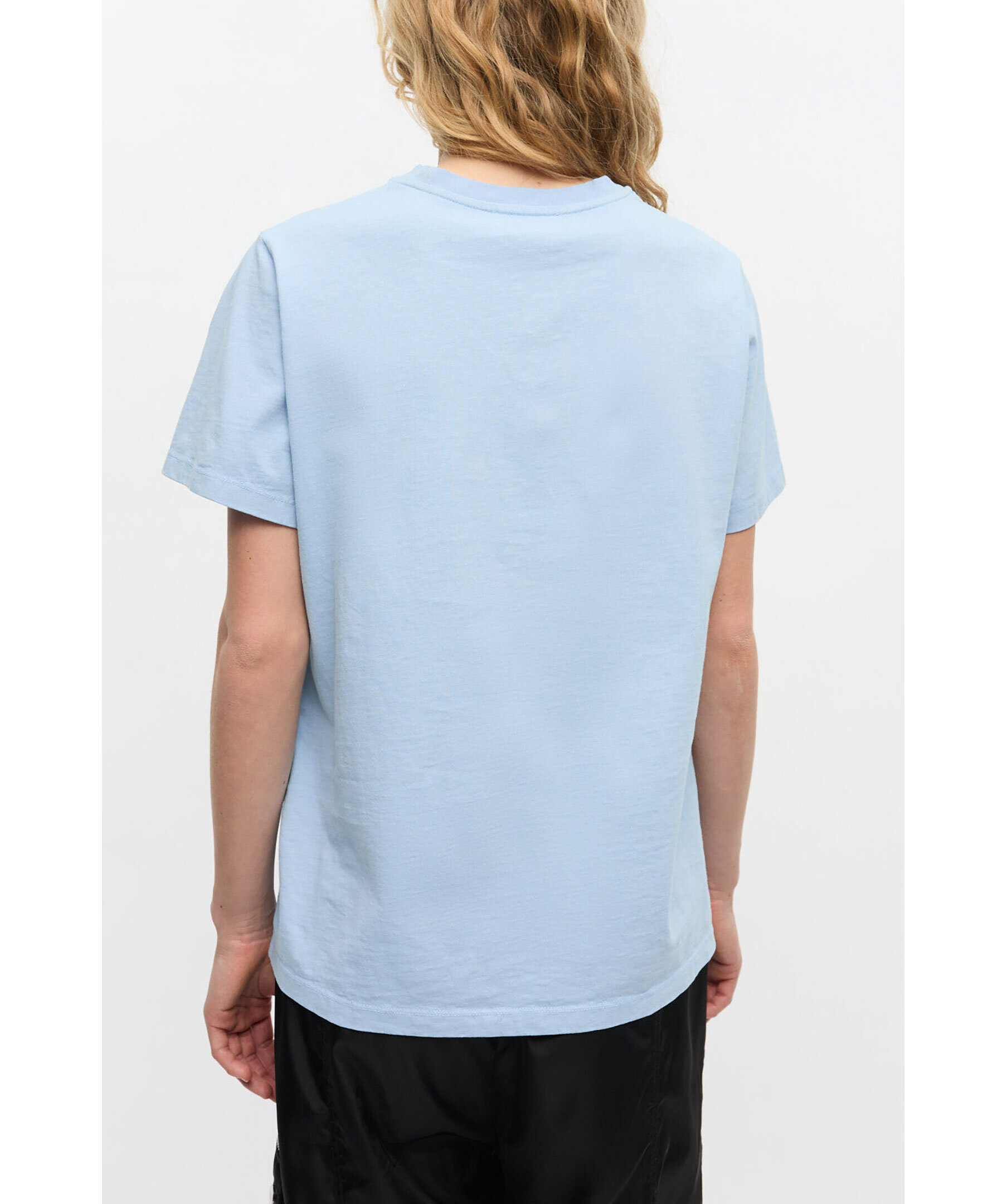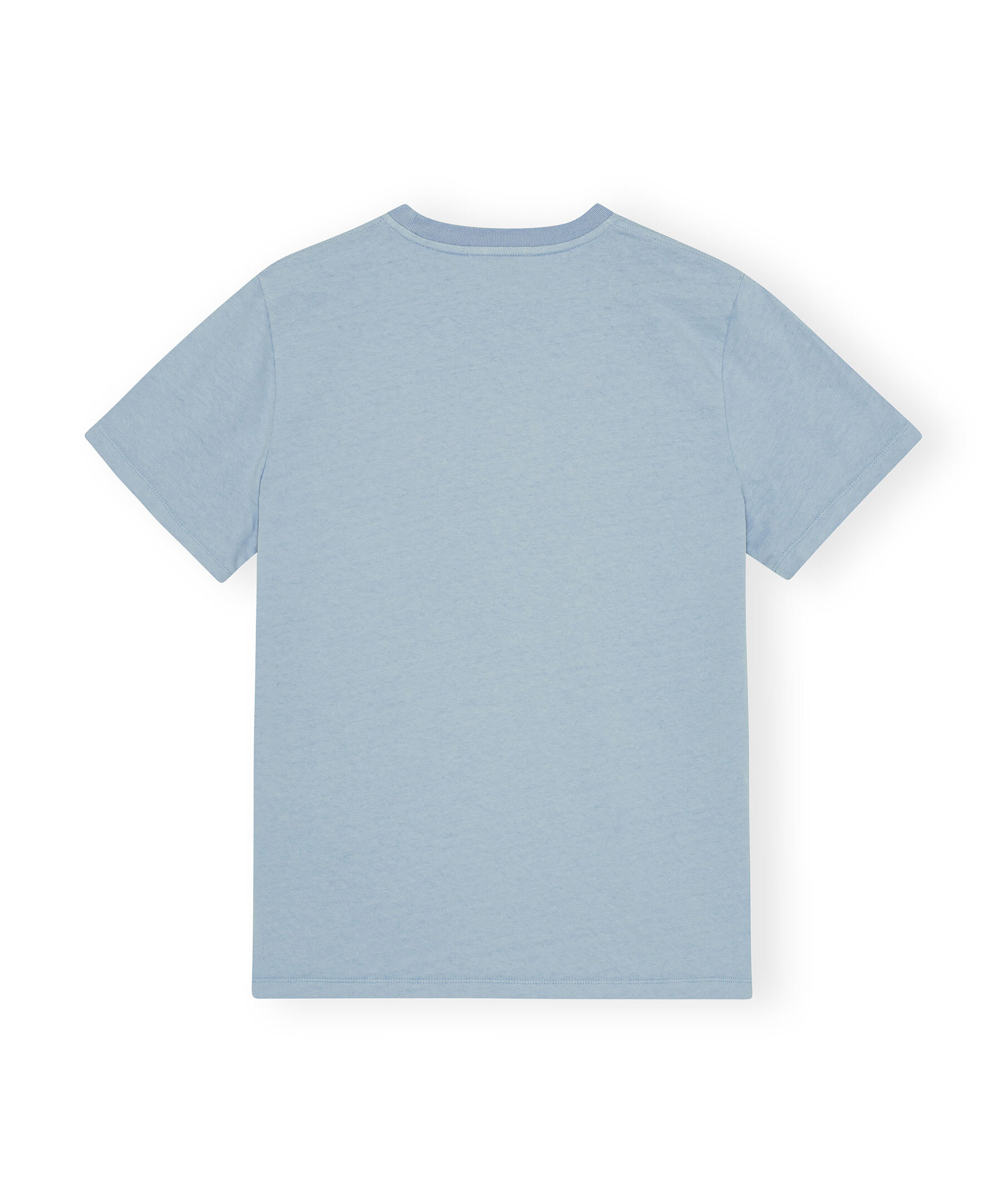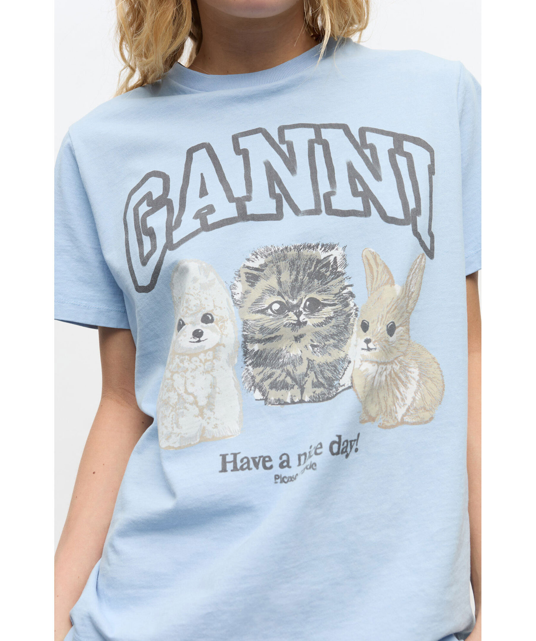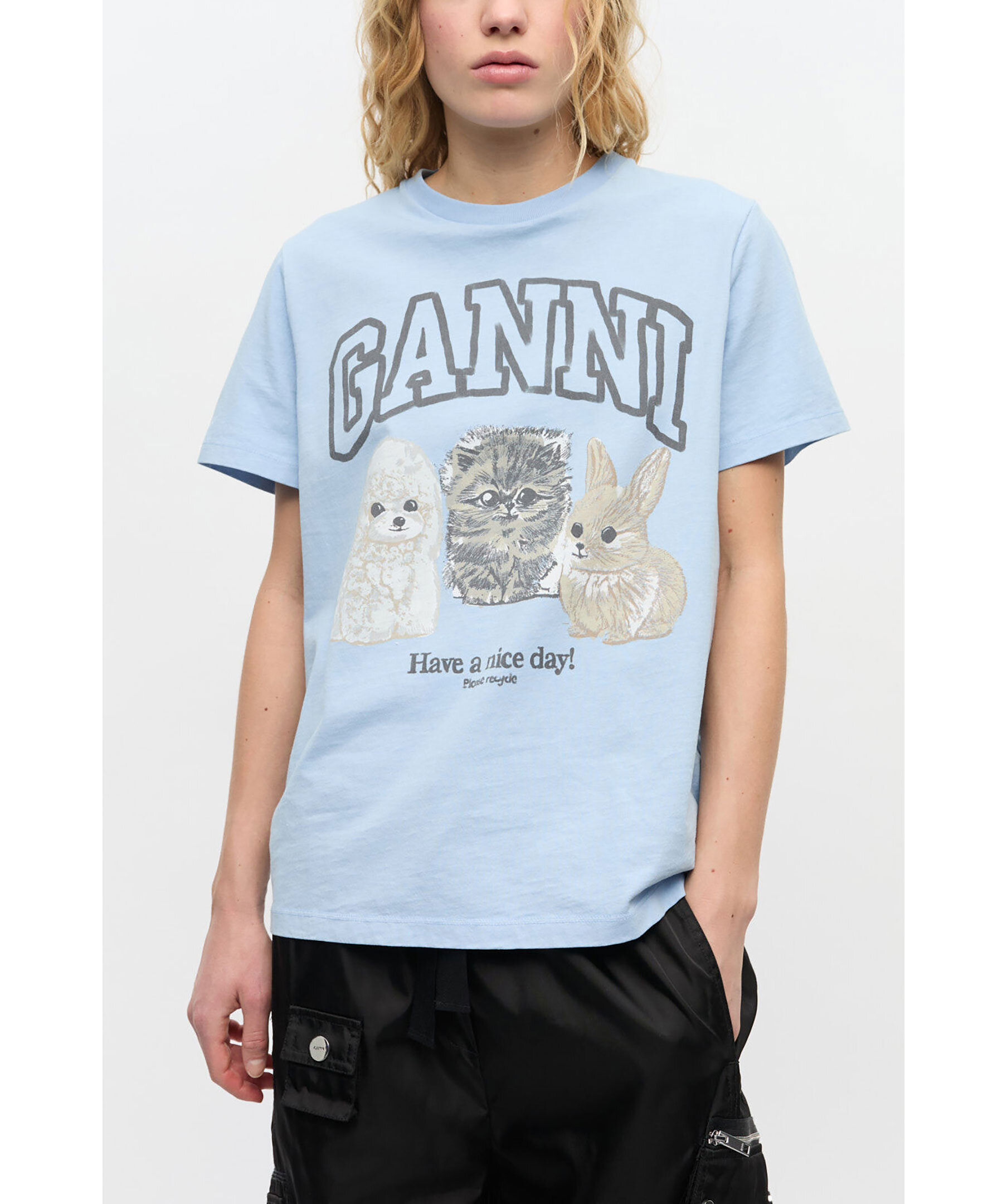 Ljusblå t-shirt från Ganni med tryck. T-shirten har rundad halsringning, korta ärmar, Ganni logotyp samt ett djurmotiv med en hund, katt och kanin på framsidan, och en ”Have a nice day! Please recycle!". Tillverkad i ekologisk bomull.