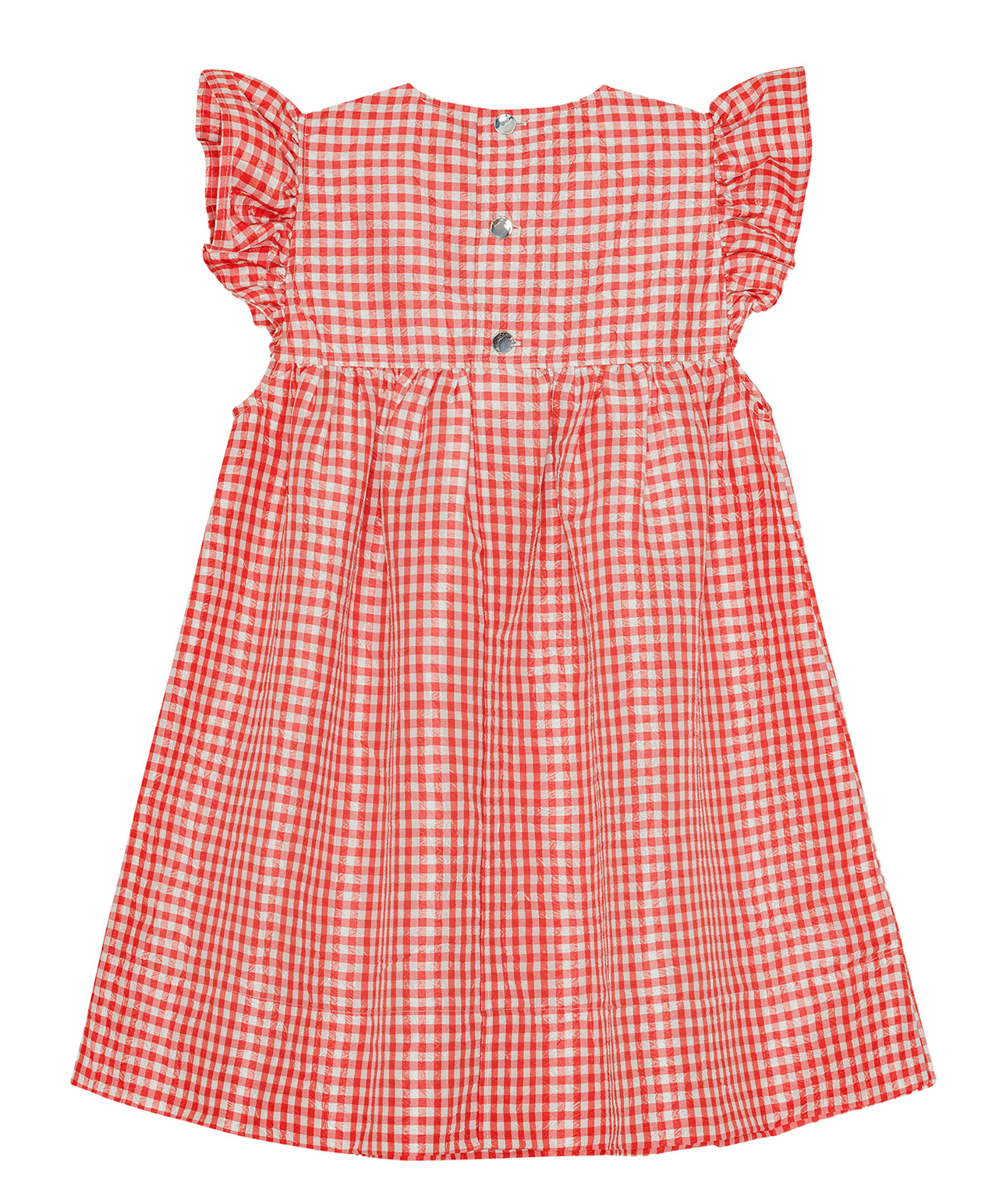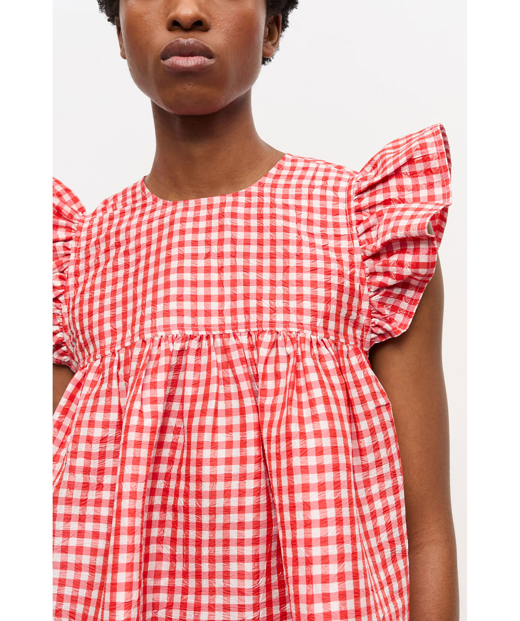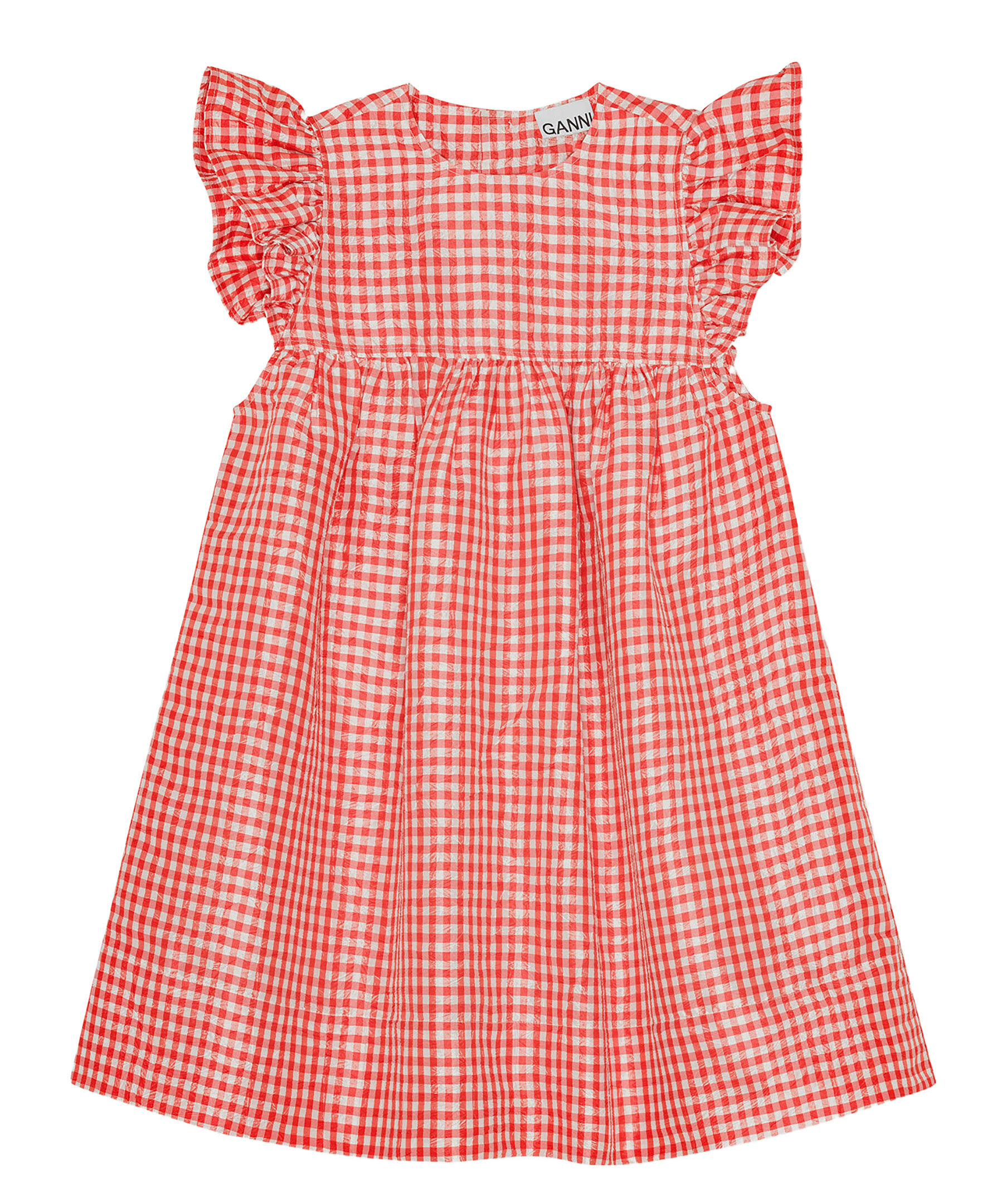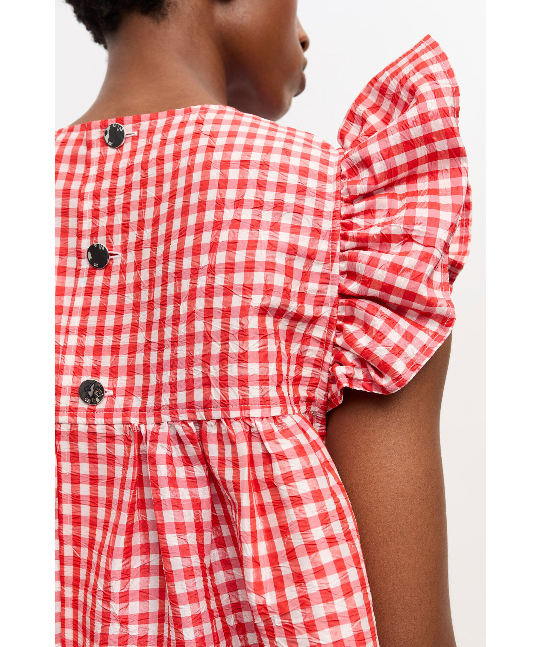 Miniklänning i ett röd- och vitrutigt taftmaterial med skrynkeleffekt från Ganni. Klänningen har volangdetaljer på axlarna och en avslappnad silhuett samt knappar baktill. Tillverkad i polyester med bomullsfoder.