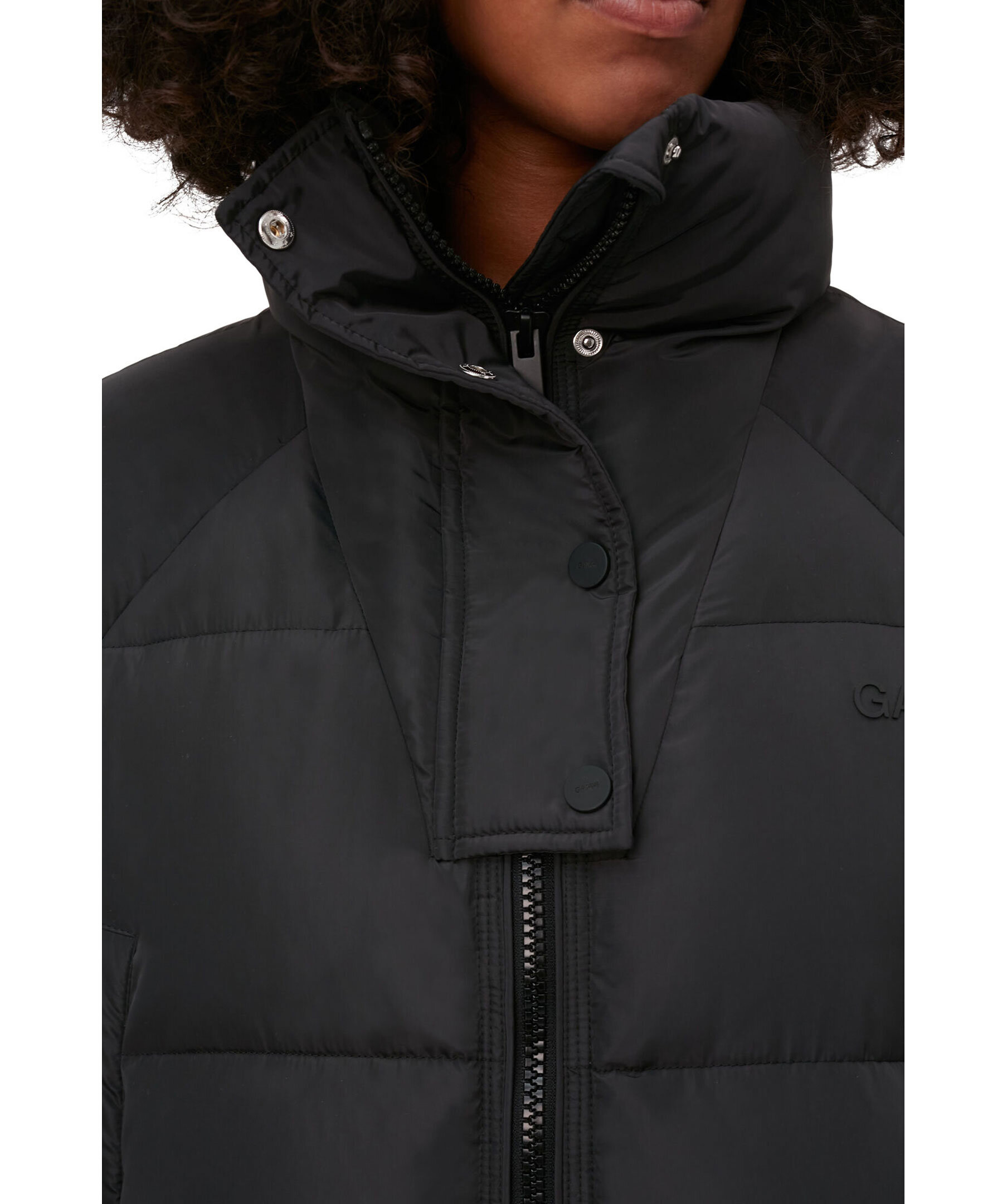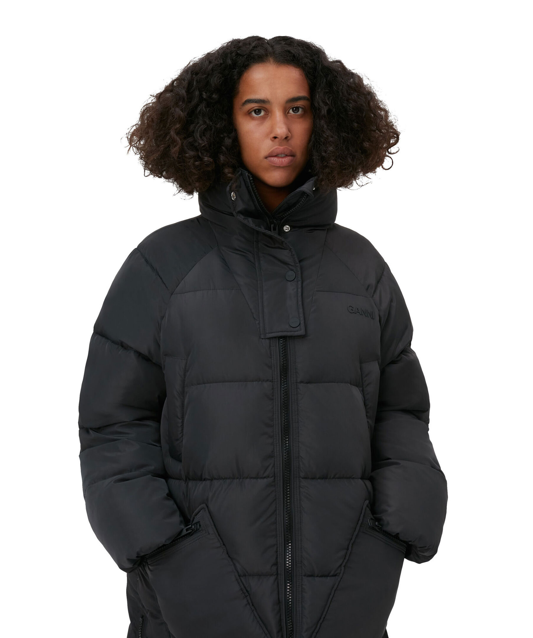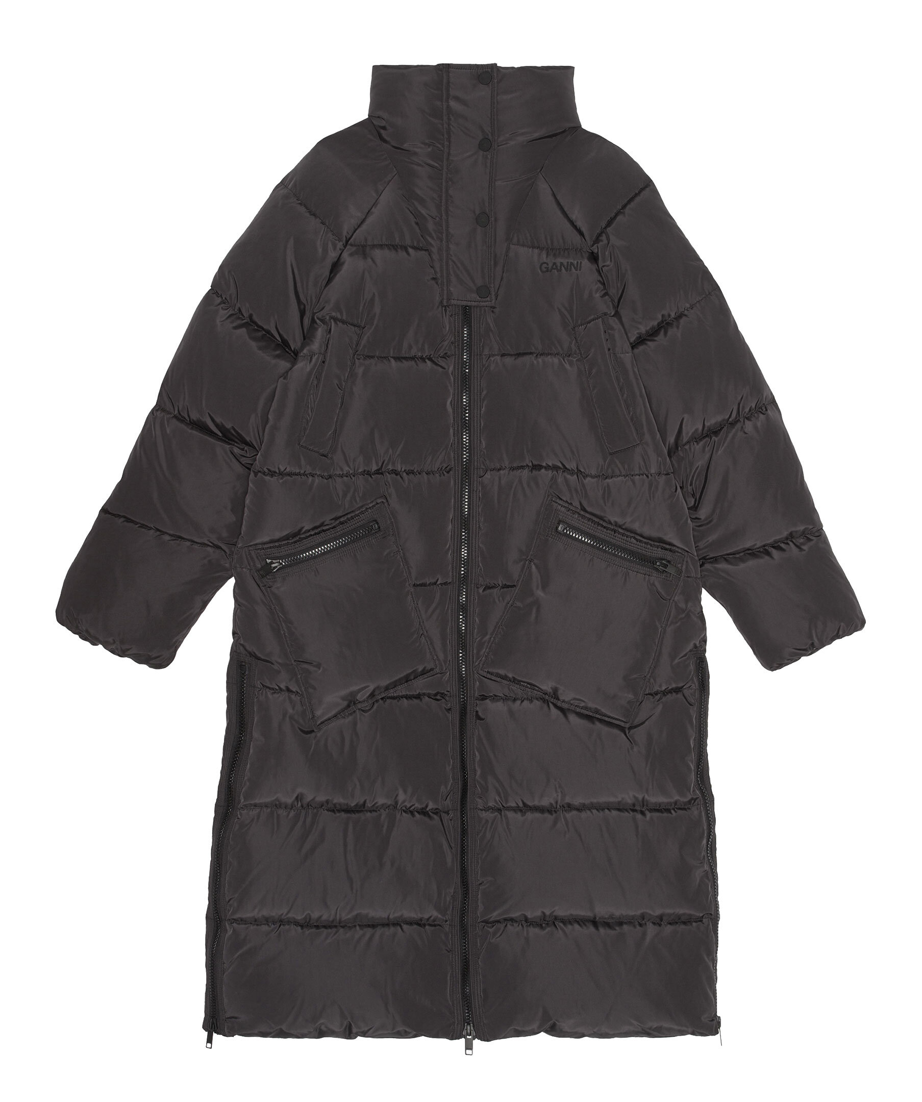 Svart quiltad pufferkappa från Ganni. Stängs framtill med Tvåvägsdragkedja och tryckknappar vid kragen. Två snedställda fickor under bröstet, två fickor som stängs med dragkedjor. Tryckt logotyp på vänster bröst. Slitsar i sidorna som stängs med dragkedja. Designad med en oversized modell.