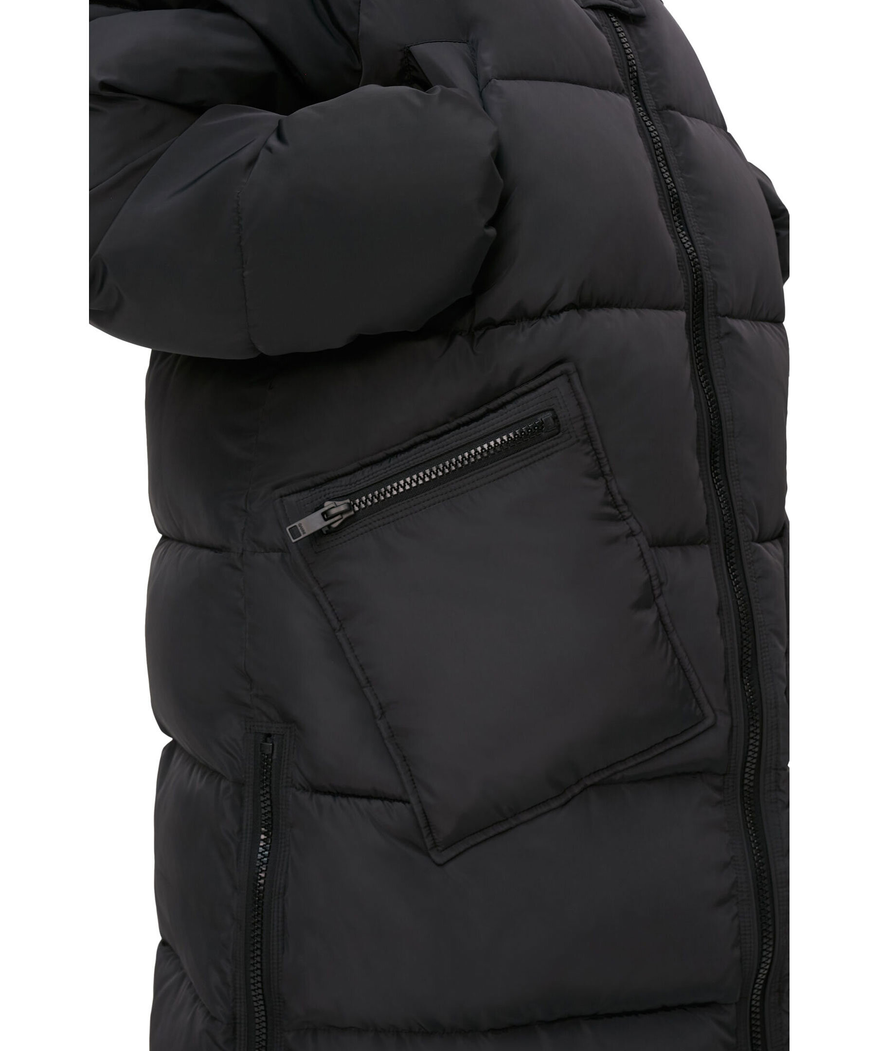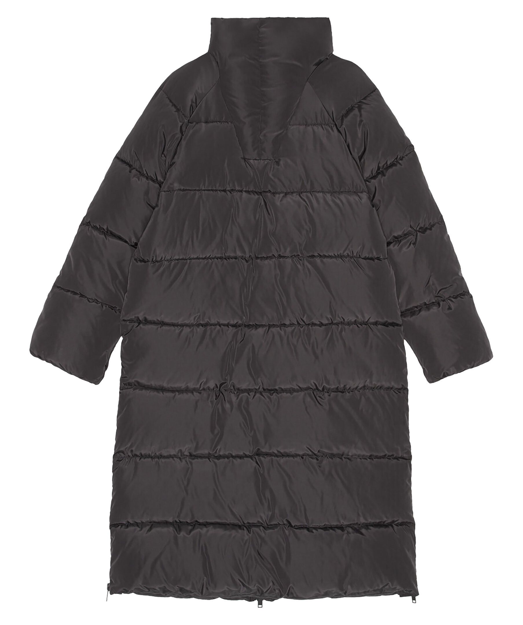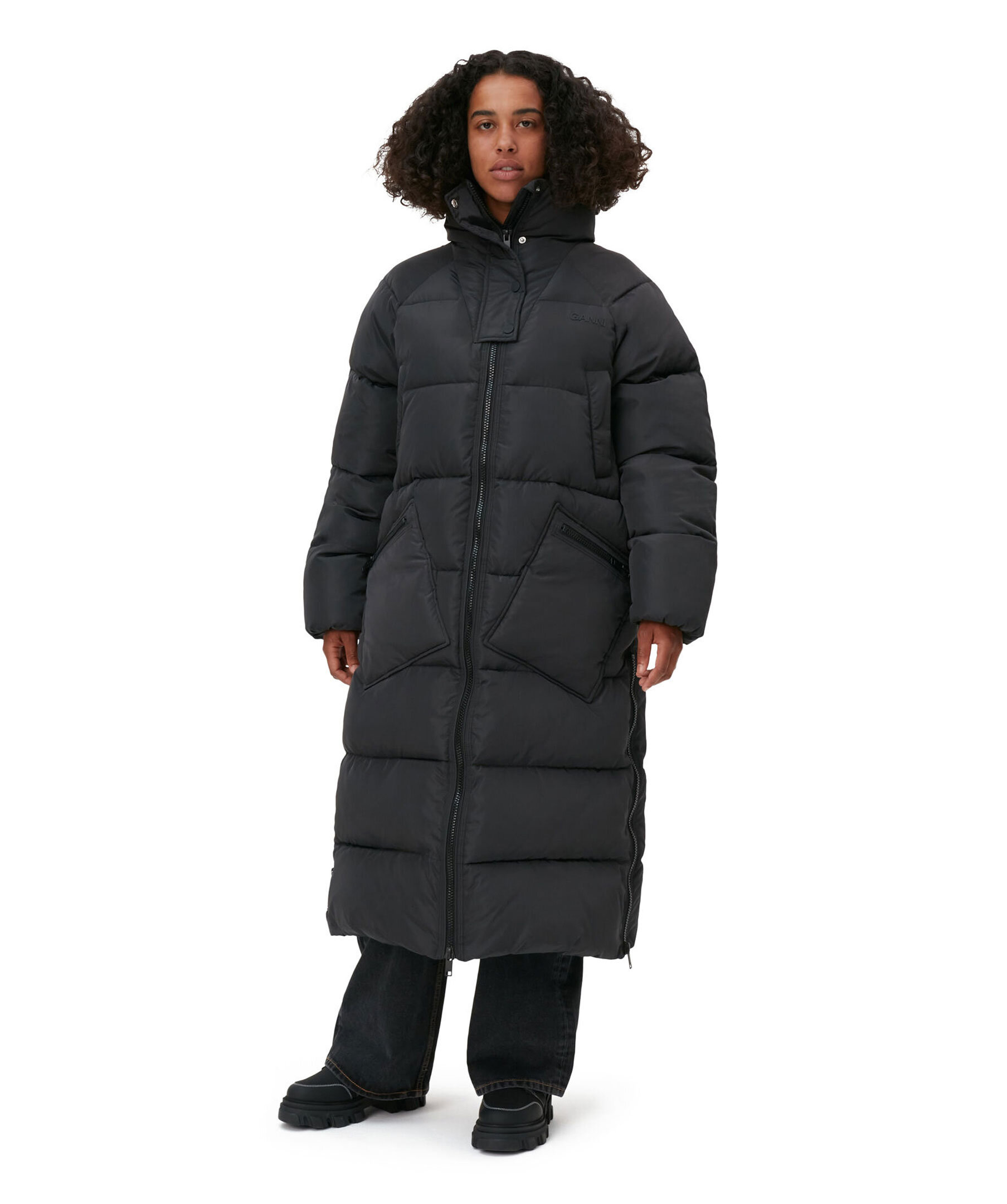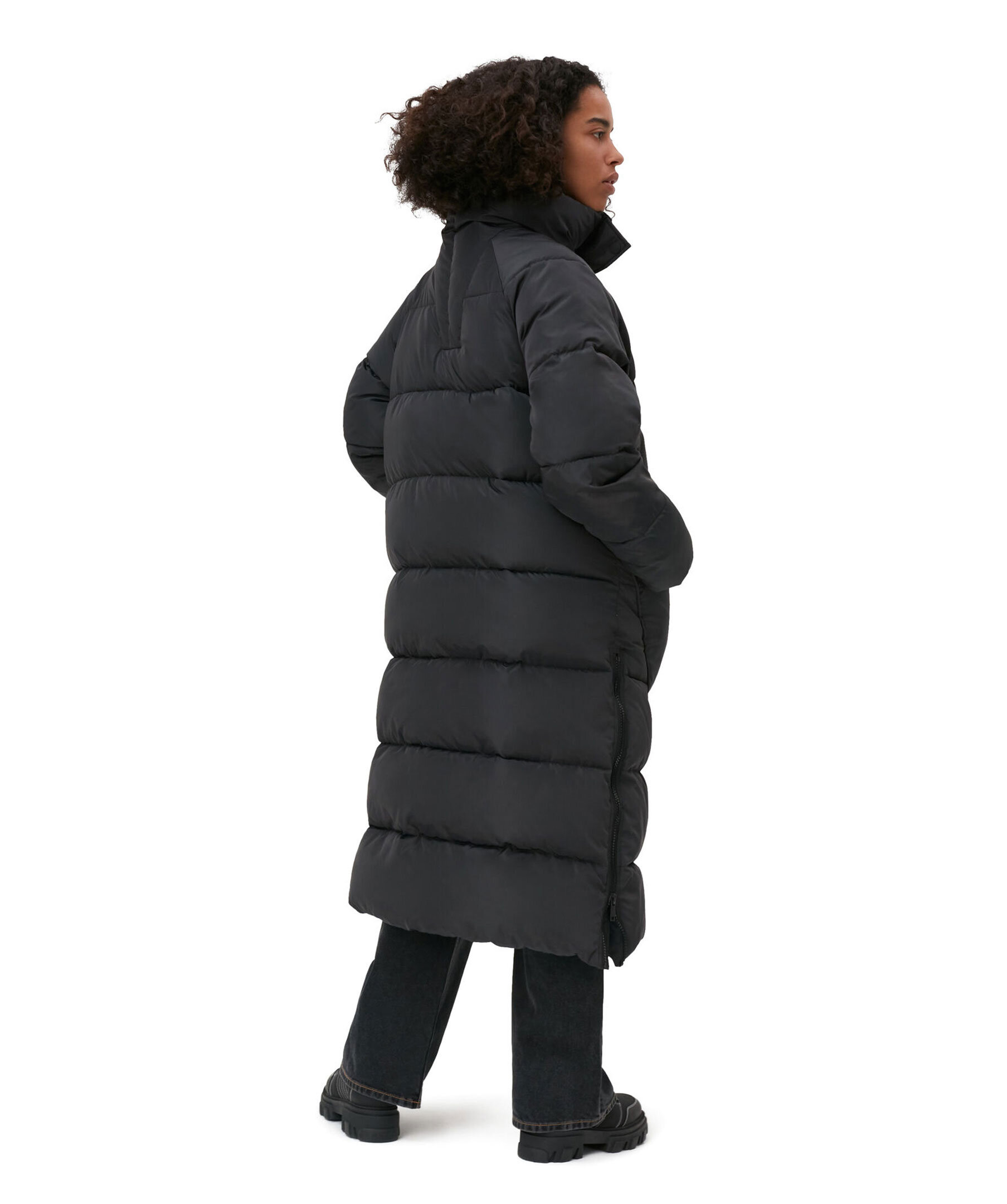 Svart quiltad pufferkappa från Ganni. Stängs framtill med Tvåvägsdragkedja och tryckknappar vid kragen. Två snedställda fickor under bröstet, två fickor som stängs med dragkedjor. Tryckt logotyp på vänster bröst. Slitsar i sidorna som stängs med dragkedja. Designad med en oversized modell.