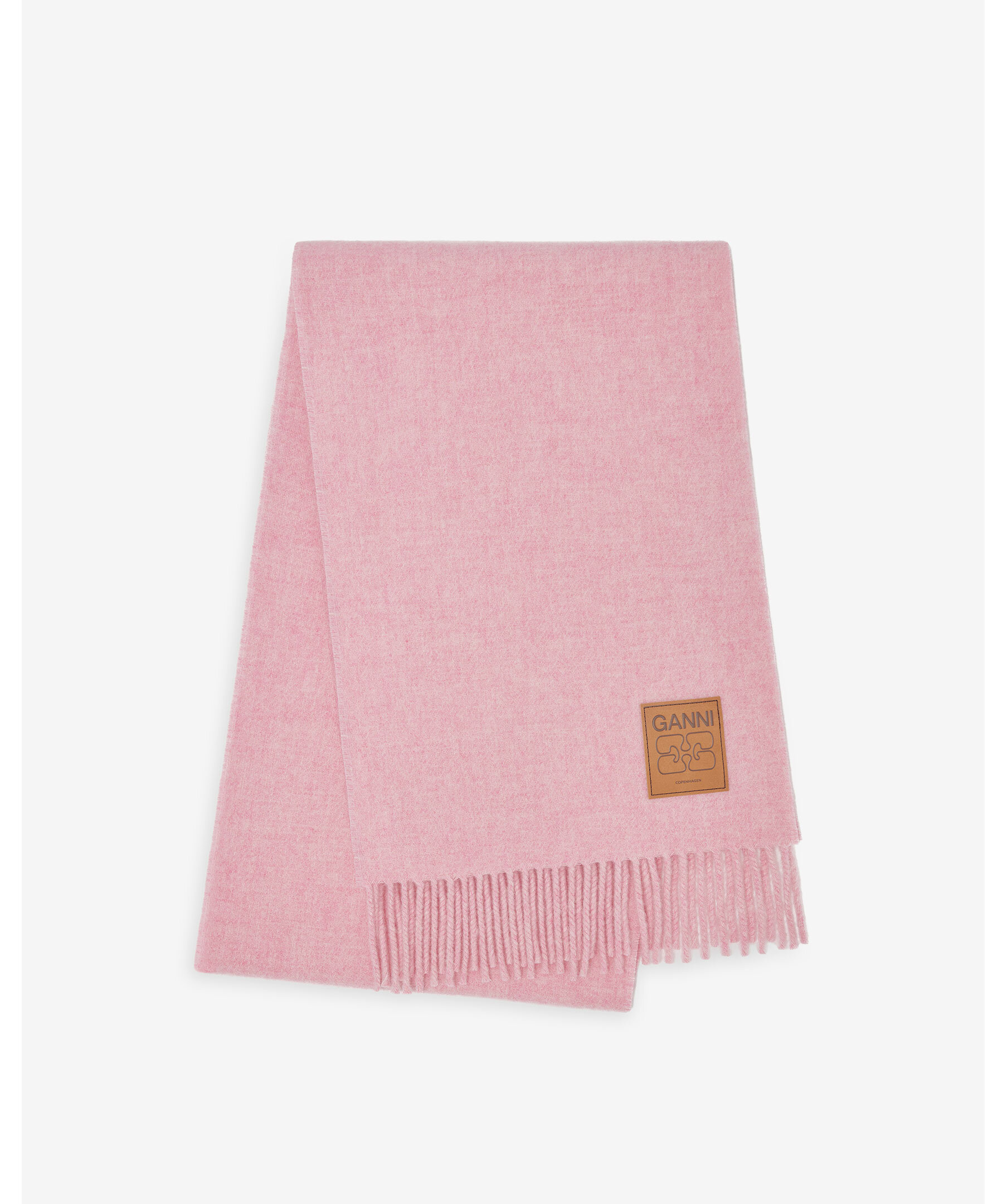 GANNI rosa ullhalsduk i färgen Mauve Morn. Tillverkad i 100 % ull med fransade kanter och en GANNI-logotyp i läder. Producerad i Italien.
