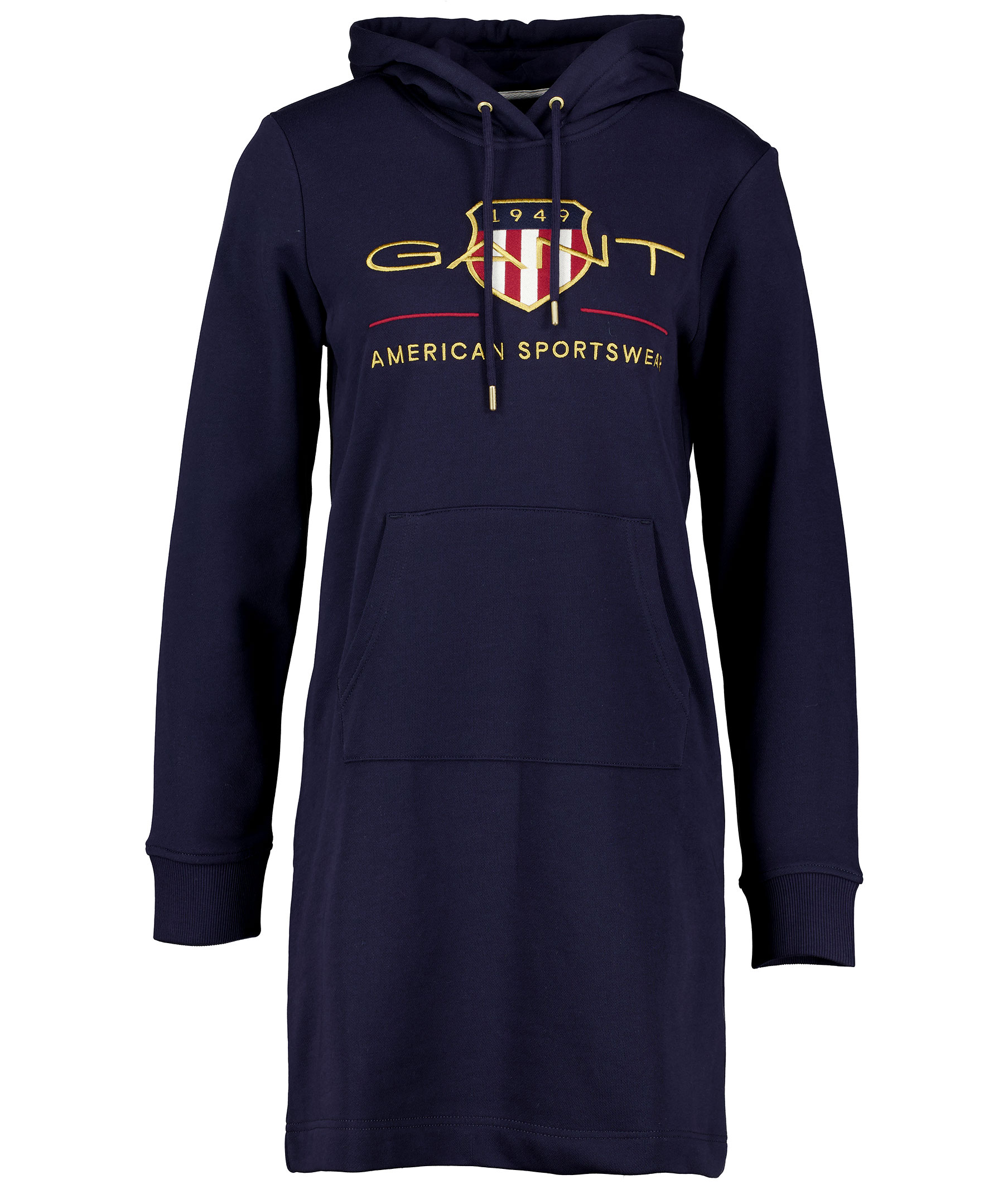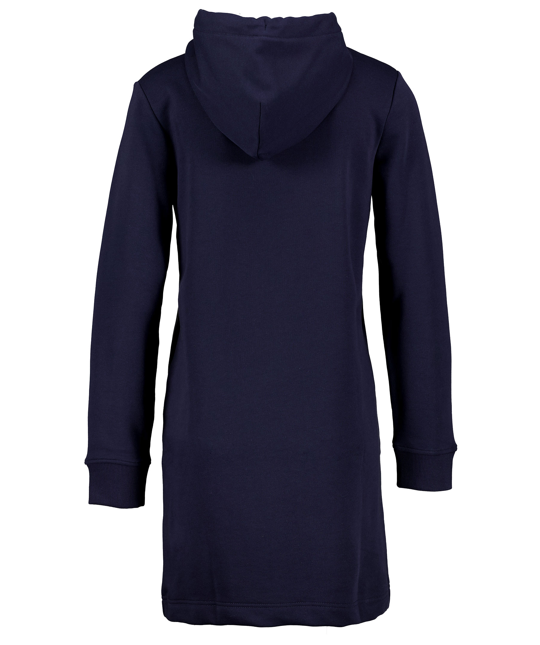 Marinblå hoodieklänning från Gant i skön bomullsblandning. Luva med marinblå dragsko samt stor ficka på magen. Ribbstickade muddar och broderad logotyp på bröstet. Tillverkad i bomull och polyesterblandning.
