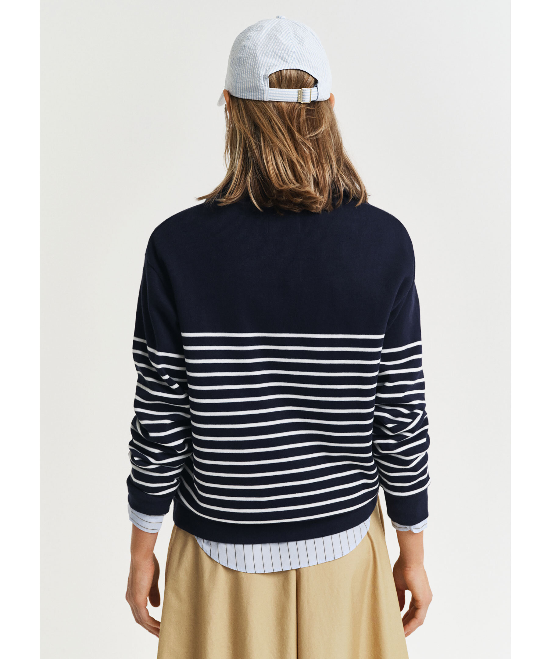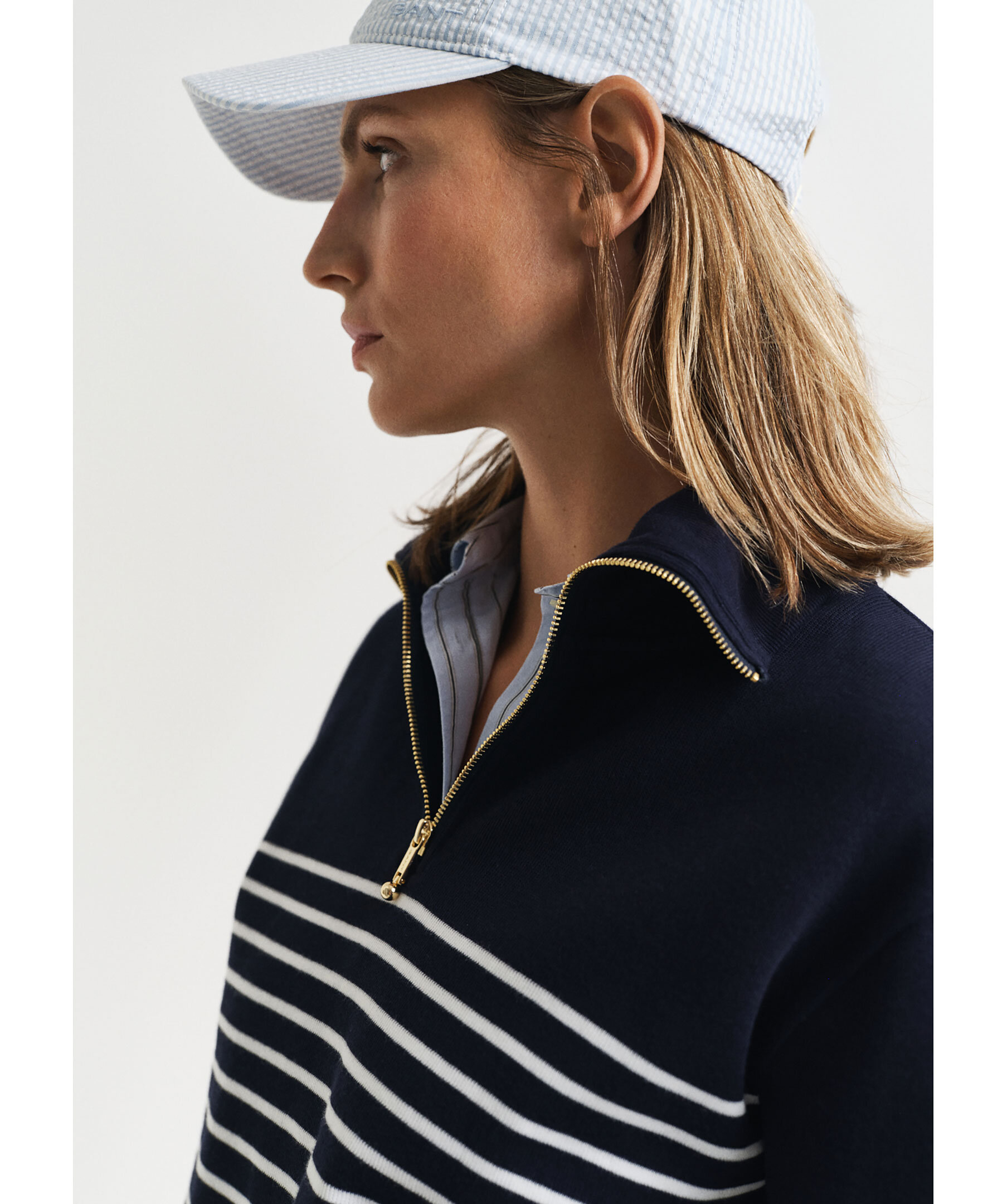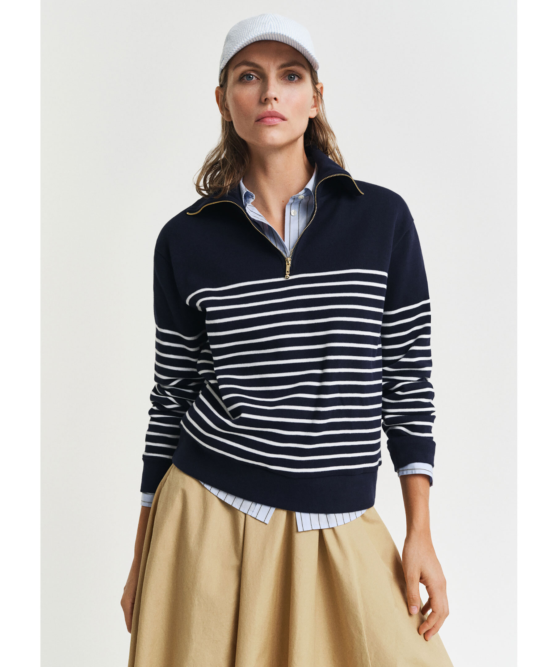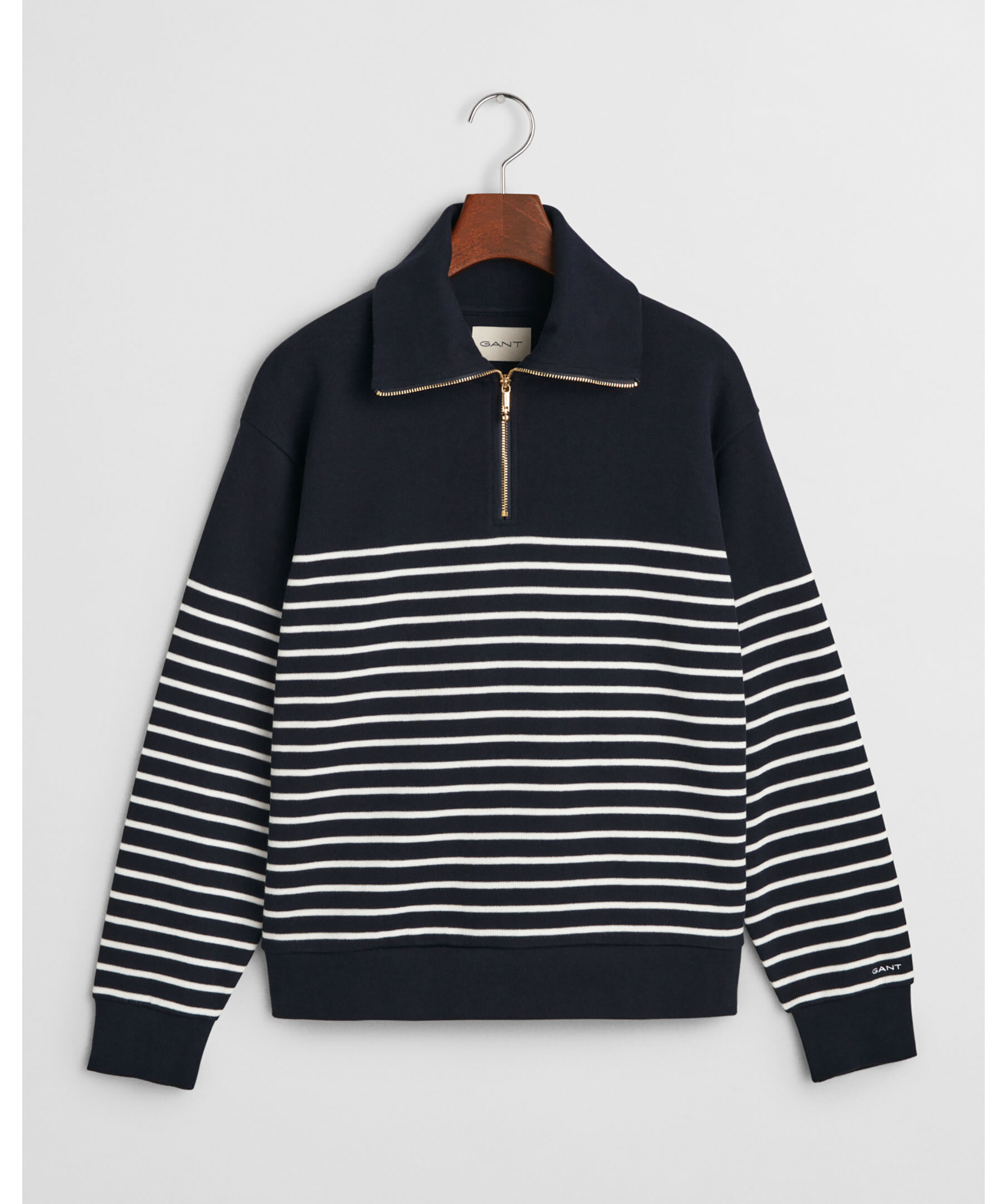 Mörkblå, finstickad och randig långärmad half-zip från Gant. Tröjan har en halv, guldig dragkedja framtill. Tillverkad i bomull.