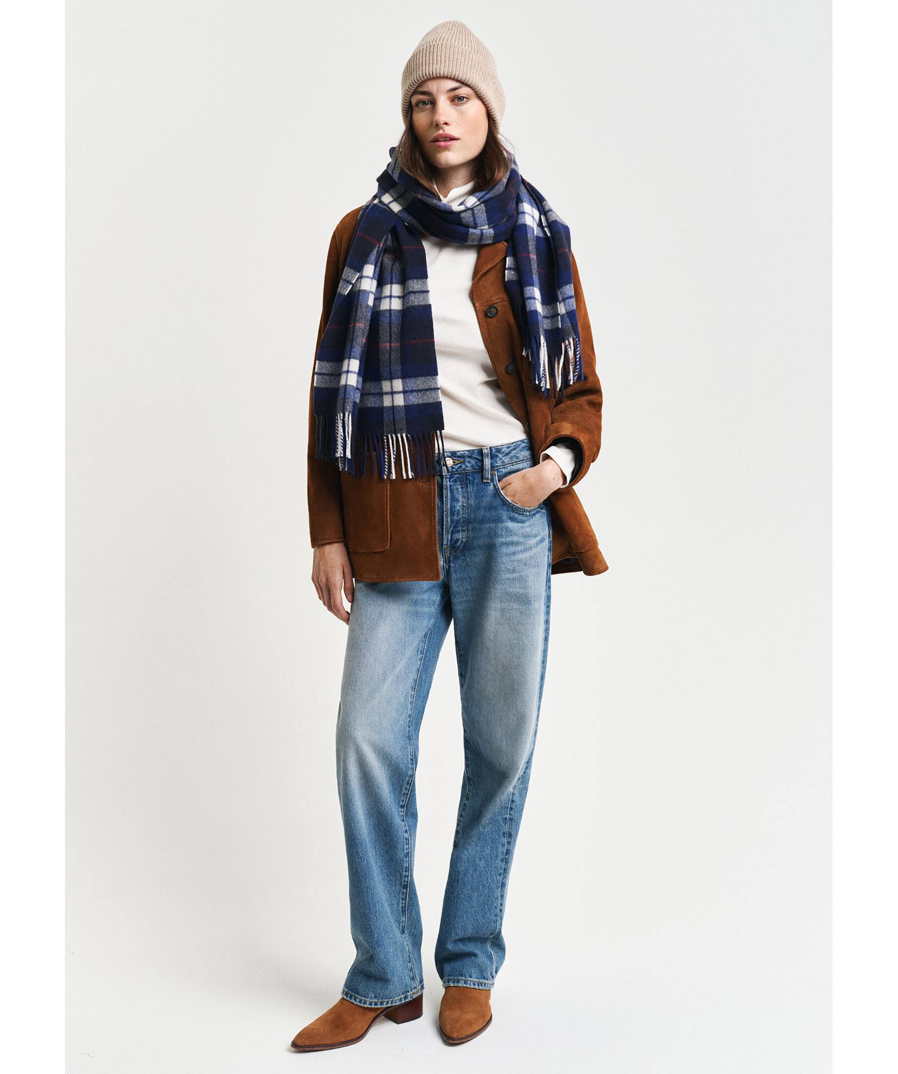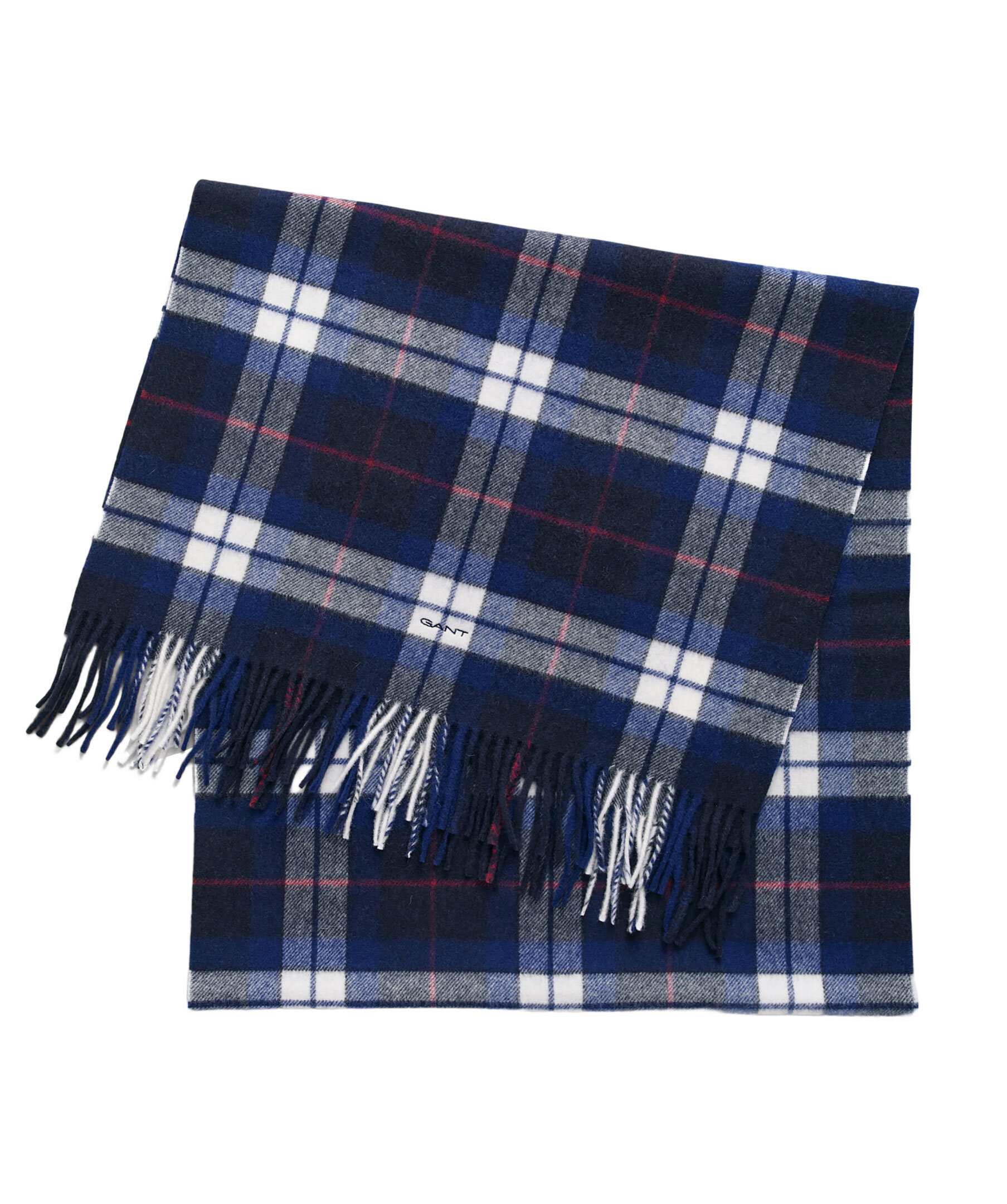 Mörkblå, rutig halsduk från Gant. Halsduken har fransar i kanterna, broderad GANT-logotyp längst ner och ett heltäckande skotskrutigt mönster. Halsduken tillverkad i 100% merinoull. Mått: 180 x 50cm.
