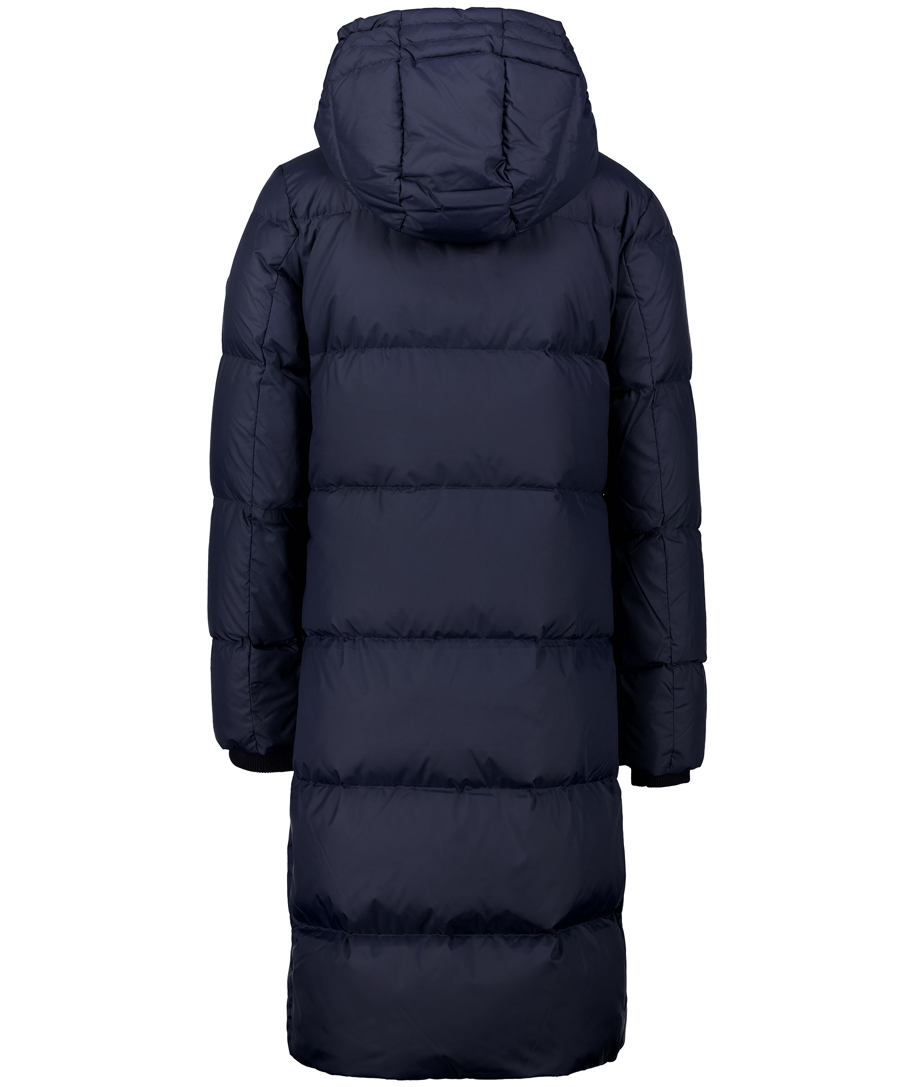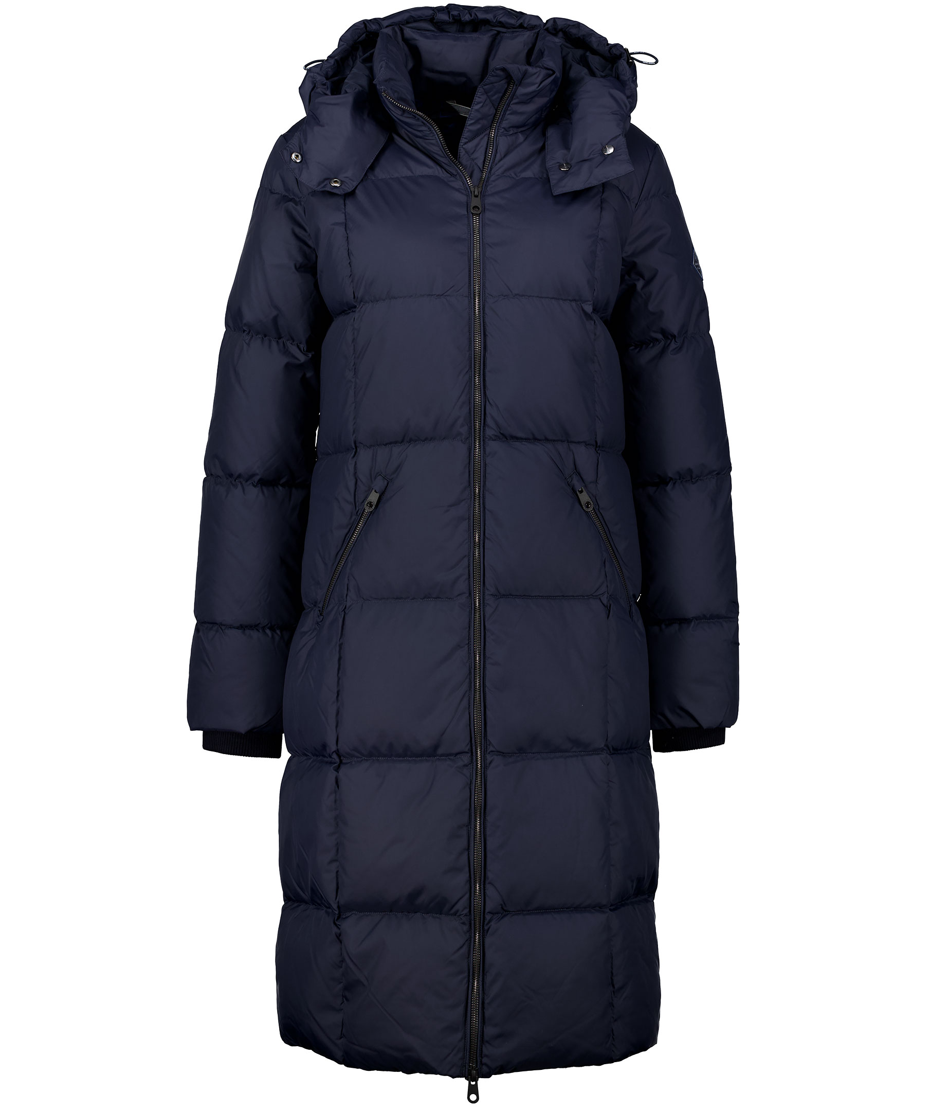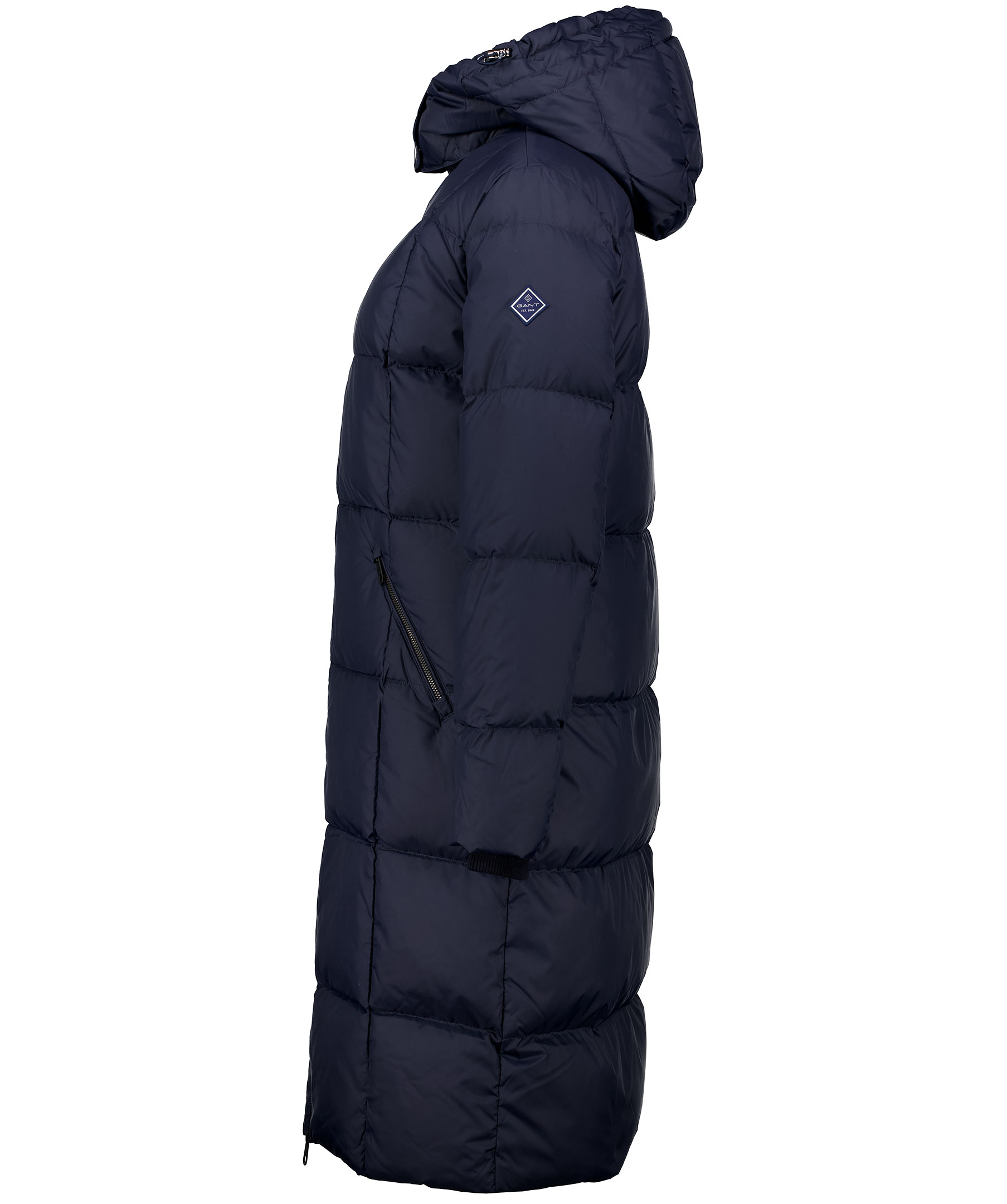 Marinblå, lång dunjacka med luva, från Gant. Luvan är avtagbar med tryckknappar och har hög krage samt ställbar dragsko. Jackan har två snedställda framfickor med dragkedja, en innerficka med dragkedjda samt fyrkantig patch med logga placerad på vänster ärm. Stängs med tvåvägsdragkedja och har dragsko i midjan. Yttermaterial i polyester.