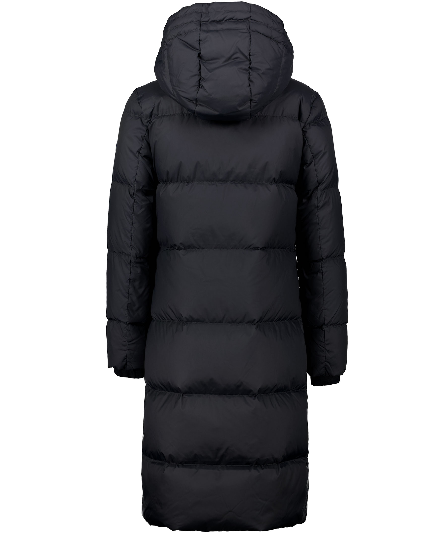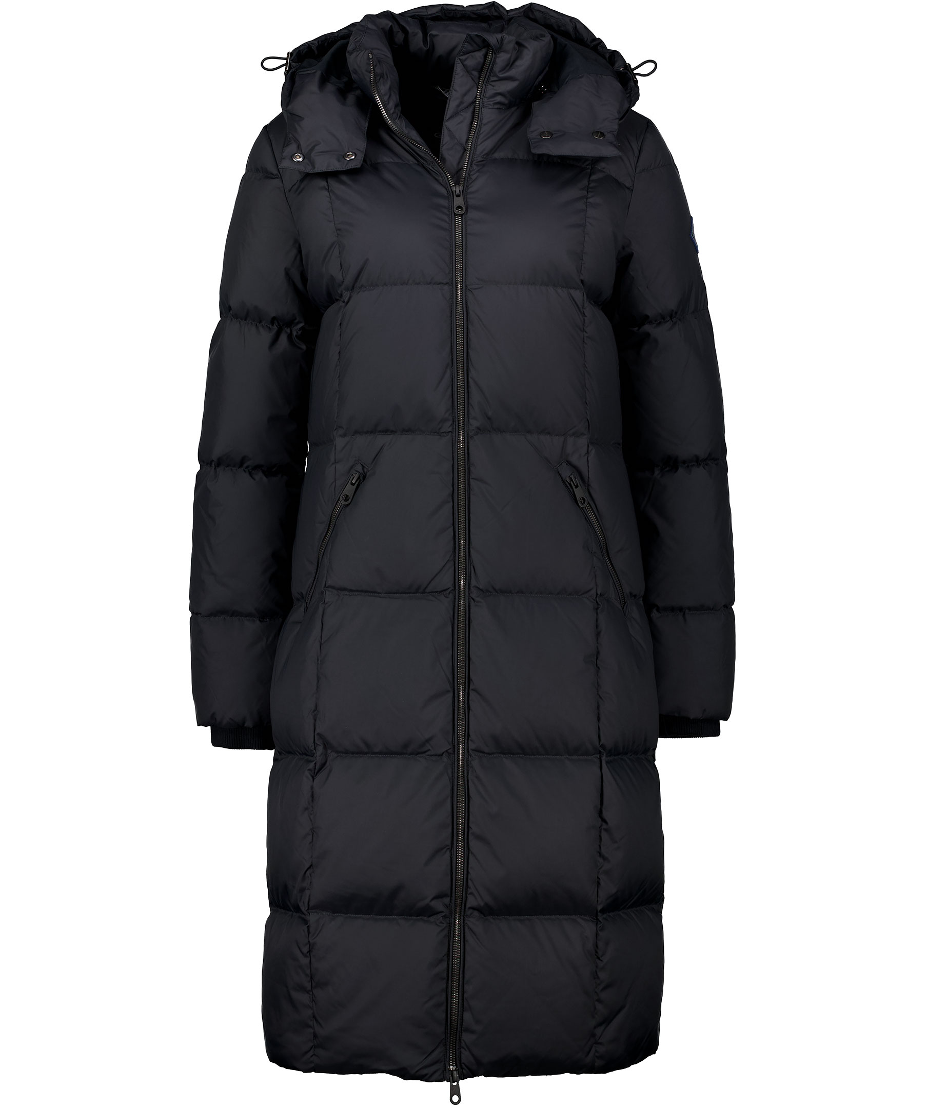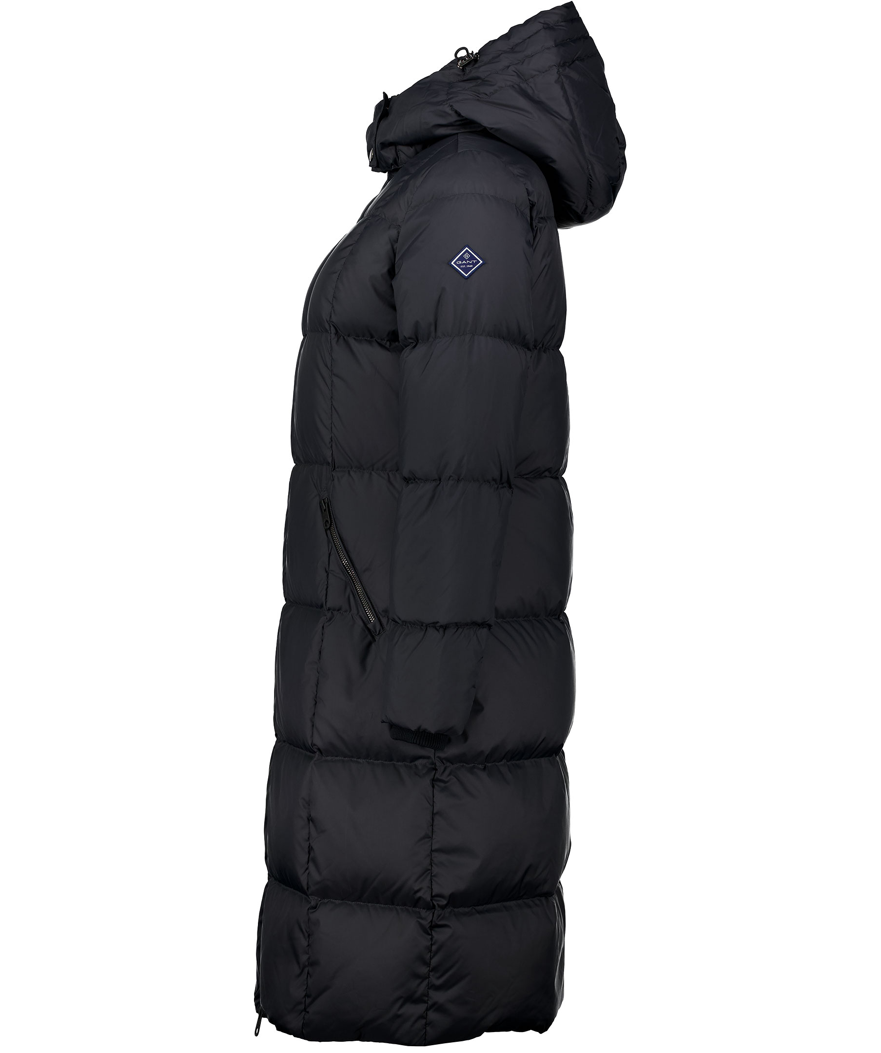 Svart, lång dunjacka med luva, från Gant. Luvan är avtagbar med tryckknappar och har hög krage samt ställbar dragsko. Jackan har två snedställda framfickor med dragkedja, en innerficka med dragkedjda samt fyrkantig patch med logga placerad på vänster ärm. Stängs med tvåvägsdragkedja och har dragsko i midjan. Yttermaterial i polyester.