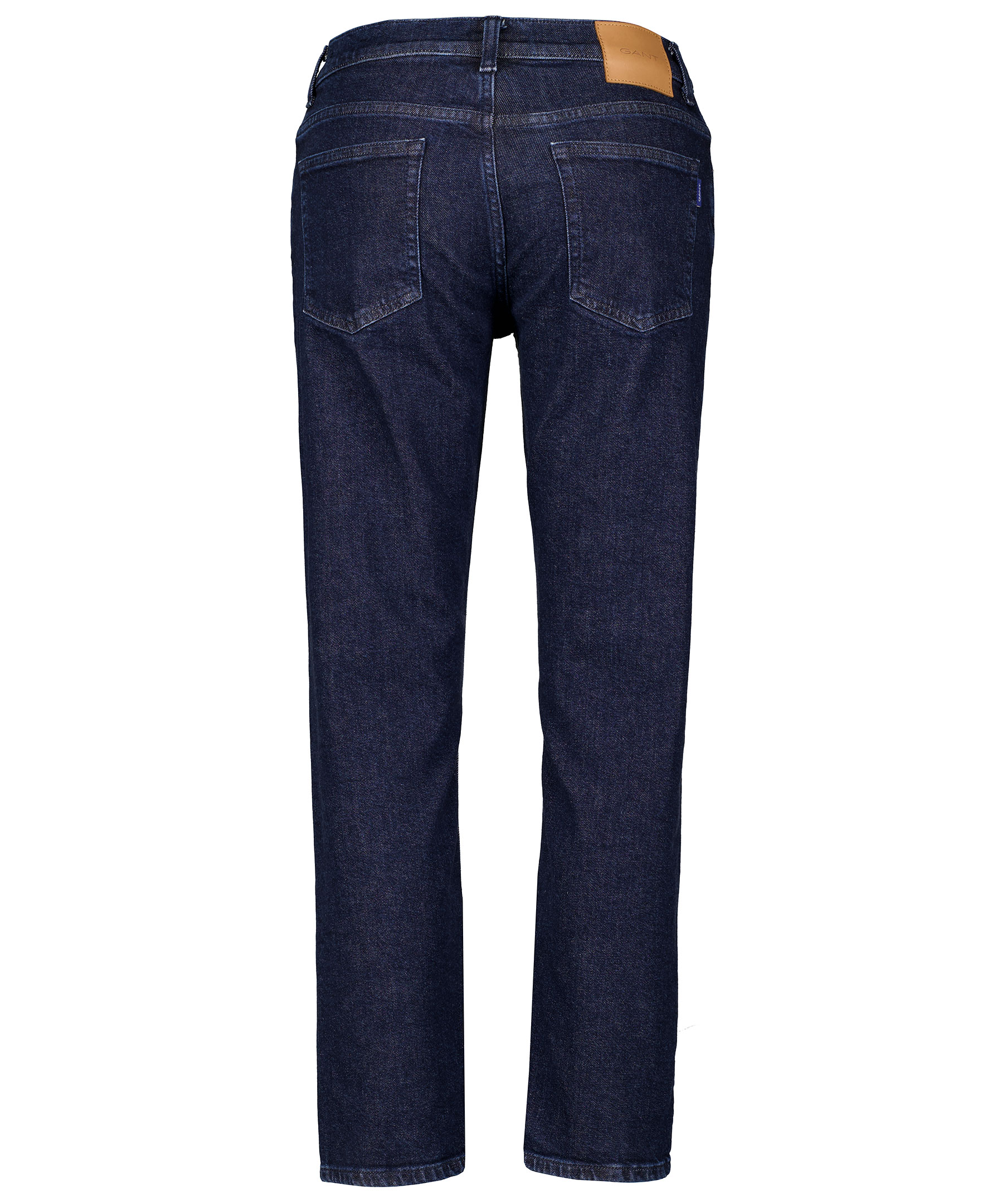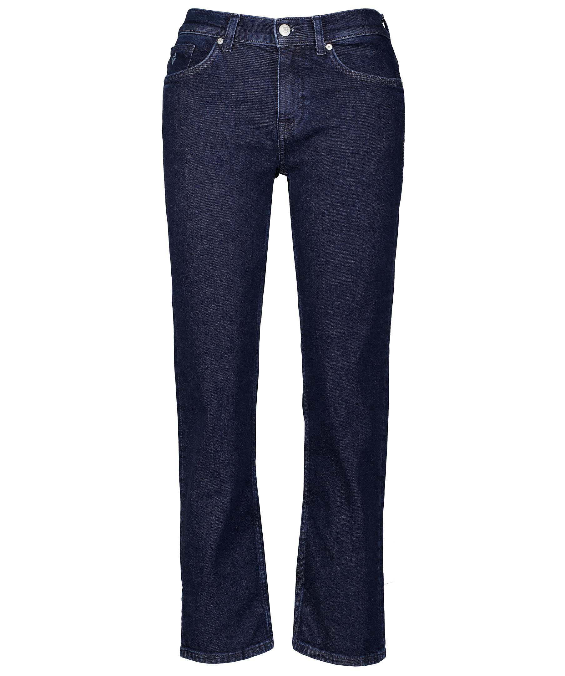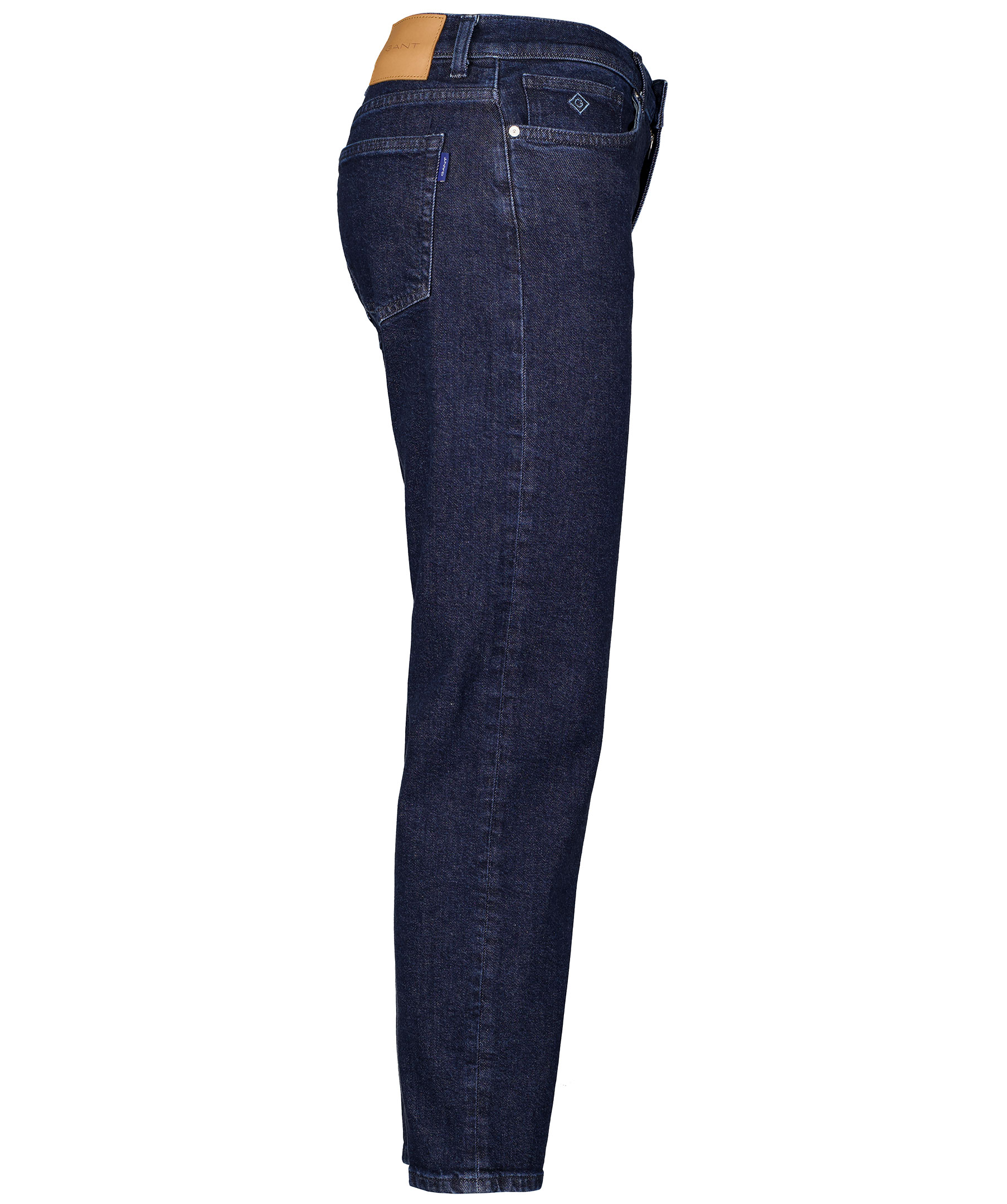 Mörkblå retroinspirerande jeans från Gant. Byxorna är gjorda i en kraftig bomullsblandning. Fem fickor, mellanhög midja och har något croppade ben. Logotyp på läderlappen bak vid linningen.