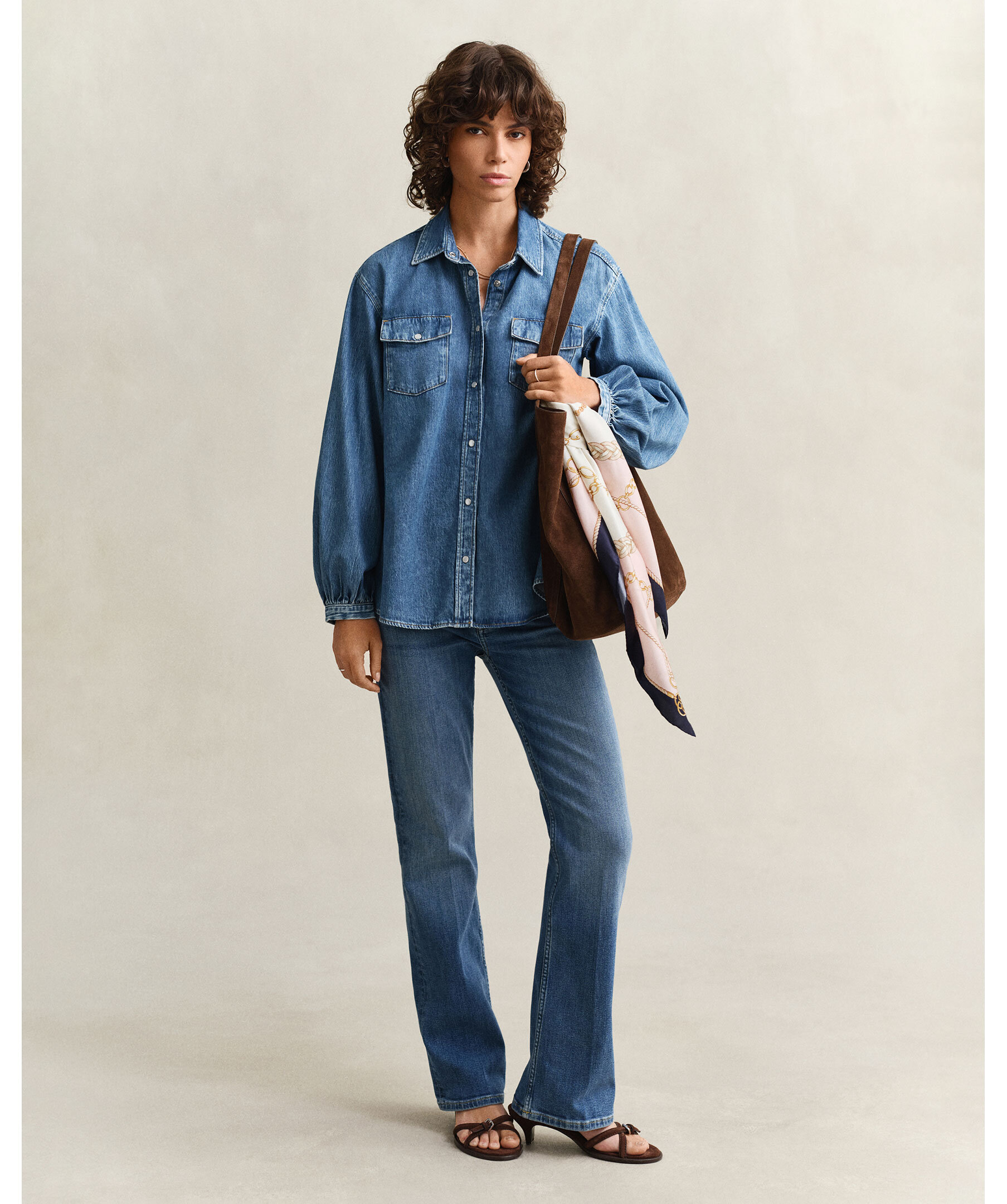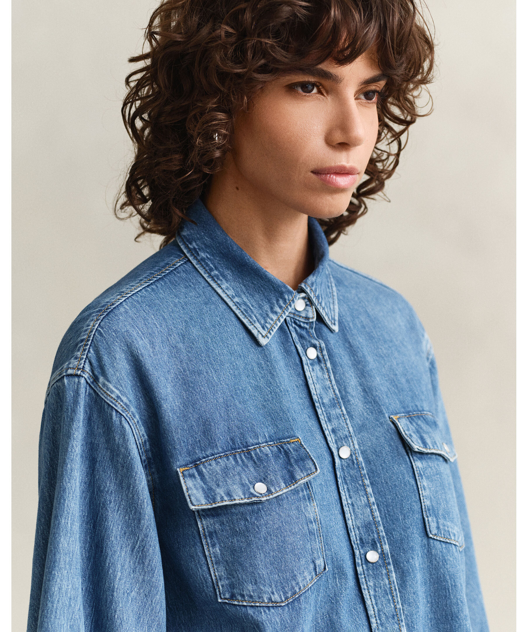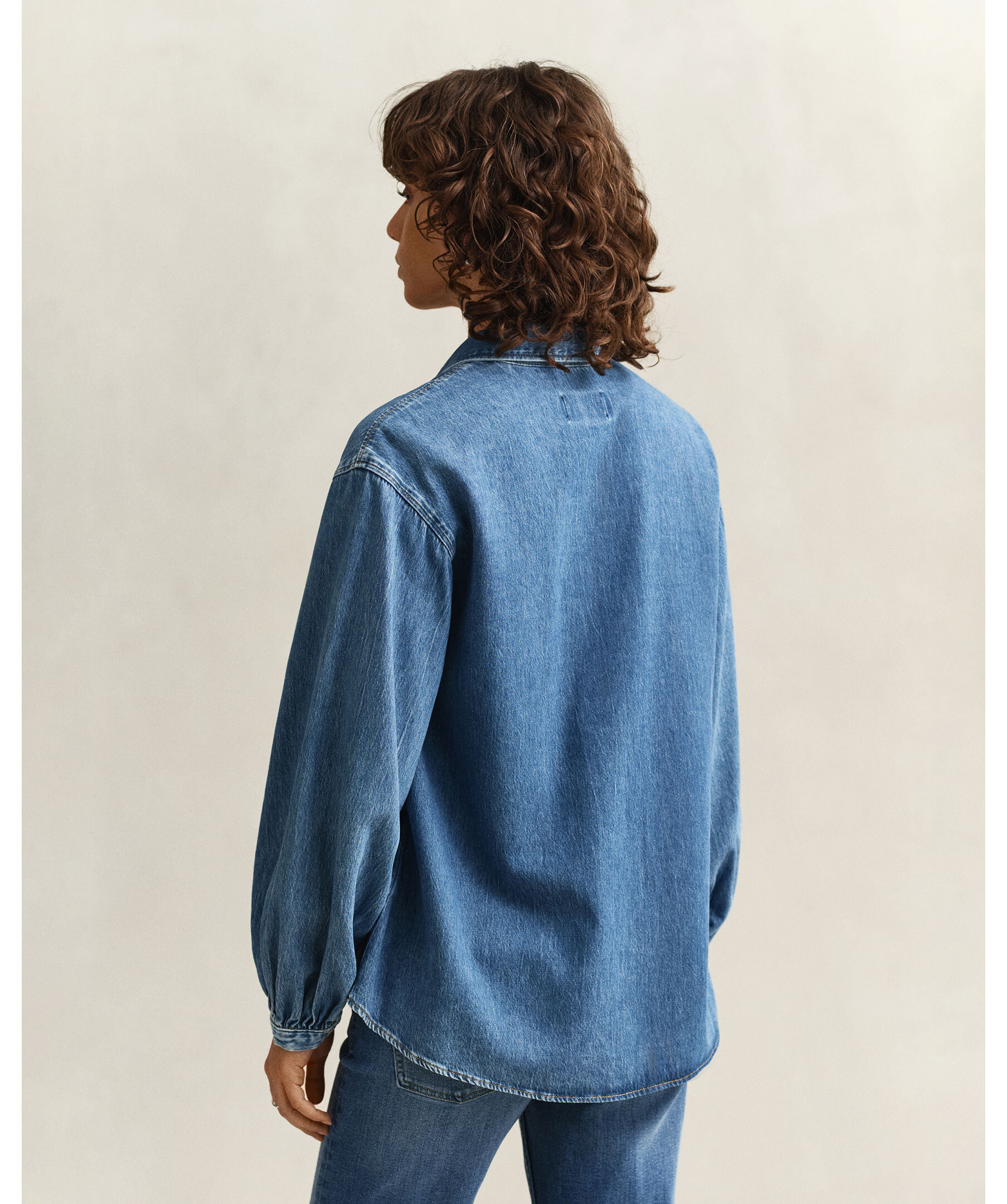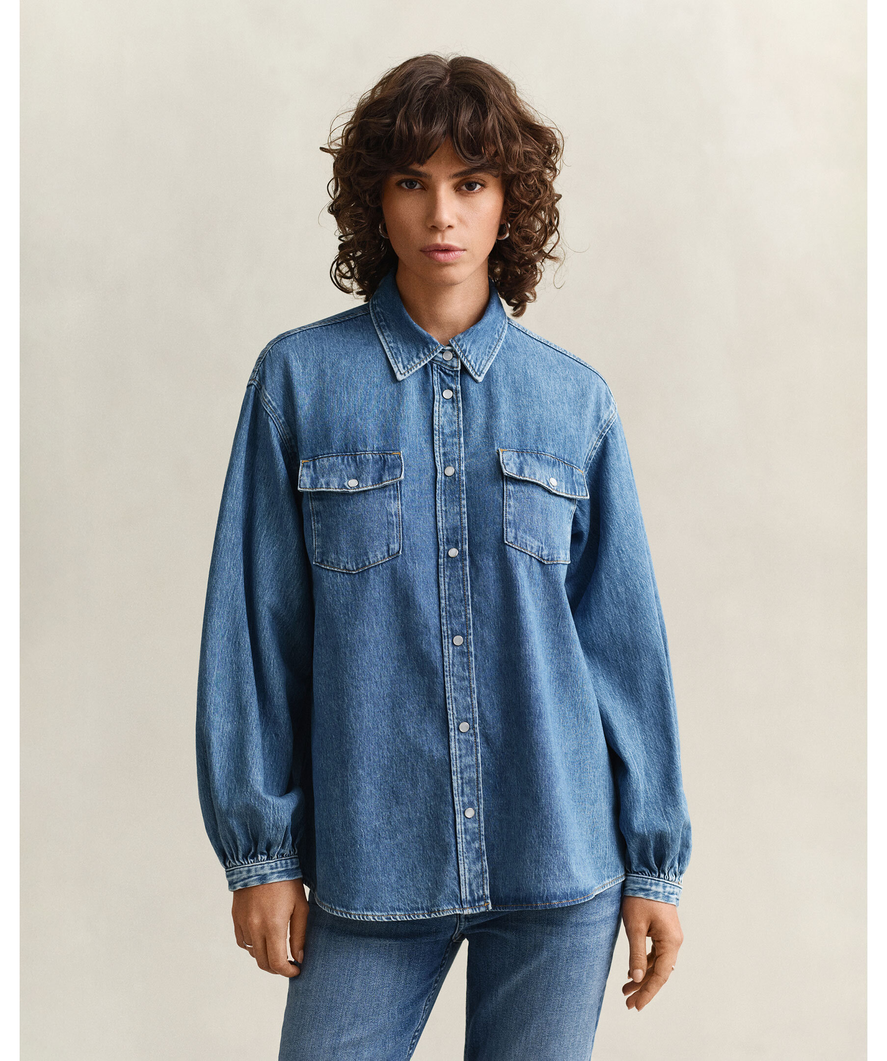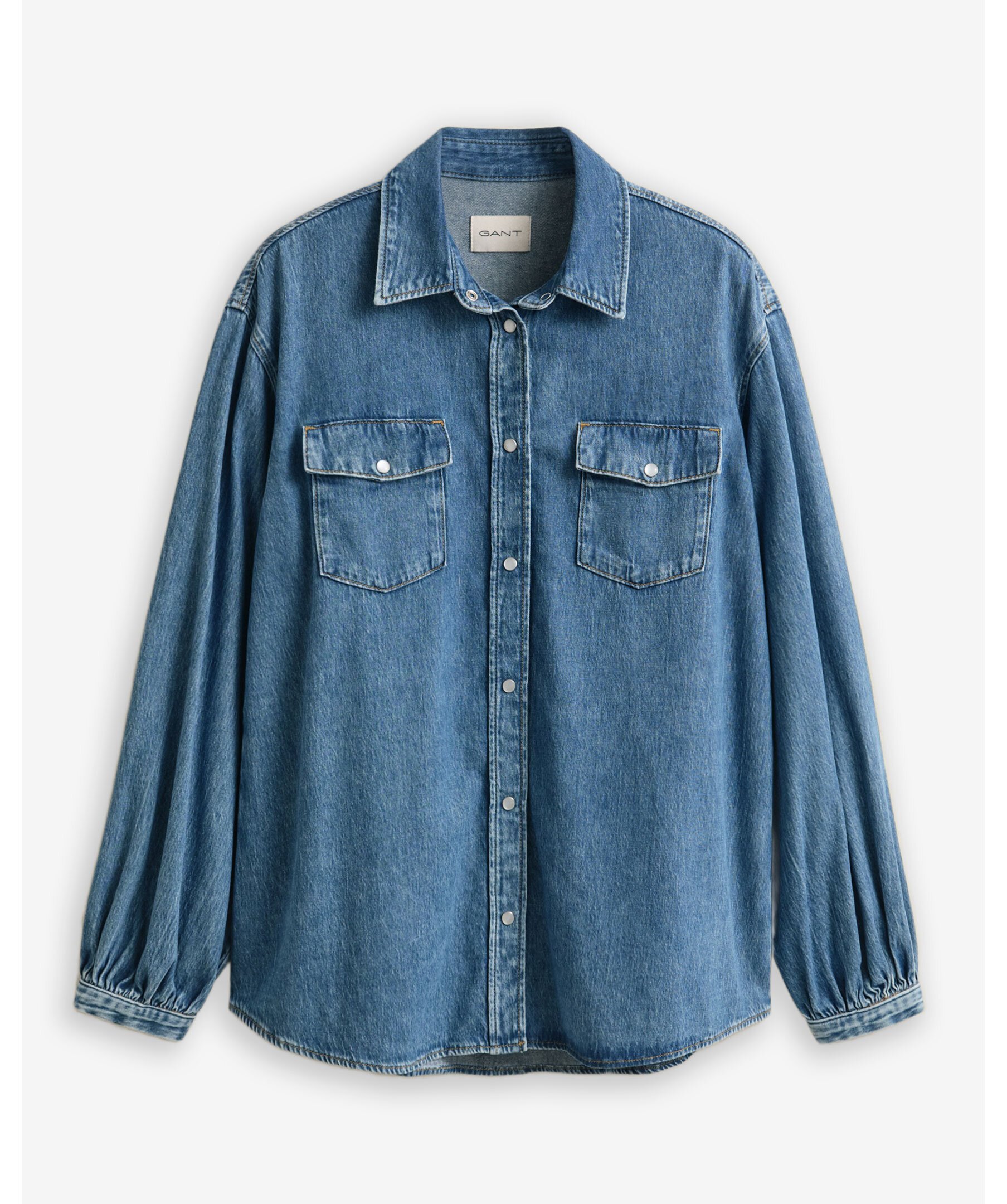Jeansskjorta från Gant i en mellanblå tvätt, voluminösa ärmar och sänkta axlar som framhäver siluetten. Relaxed fit med spetskrage, tryckknappar och bröstfickor med tryckknappar. För en tajtare passform rekommenderas en storlek mindre.
