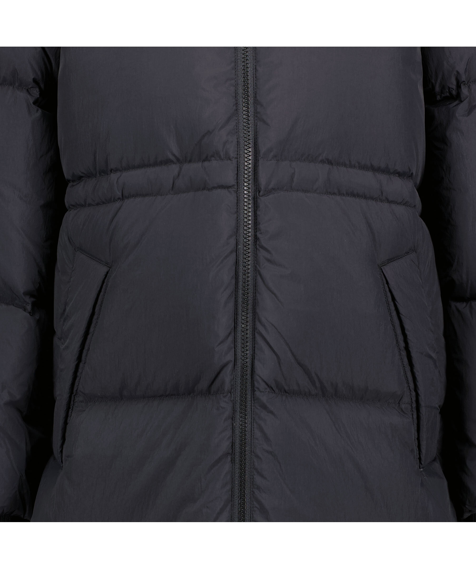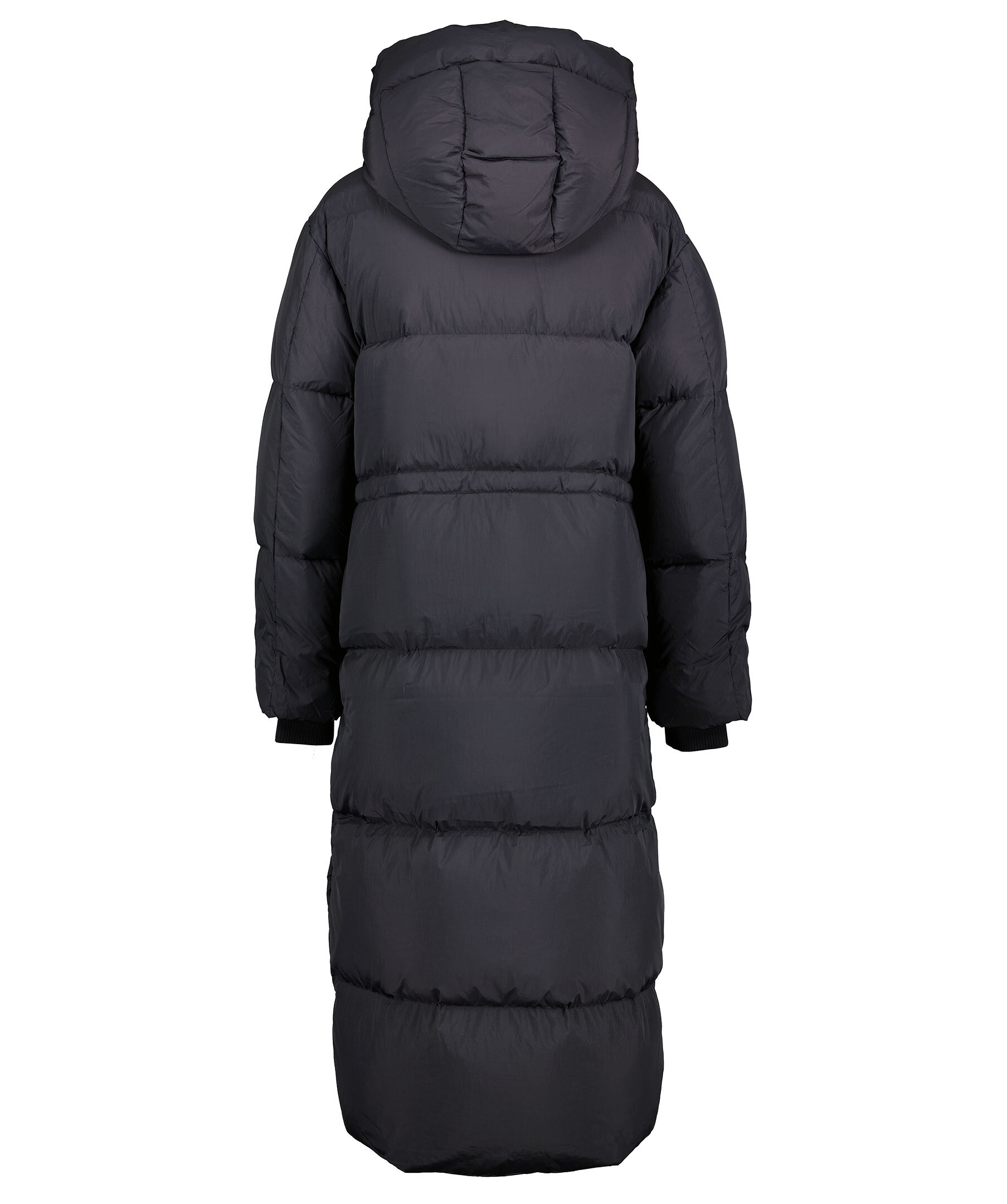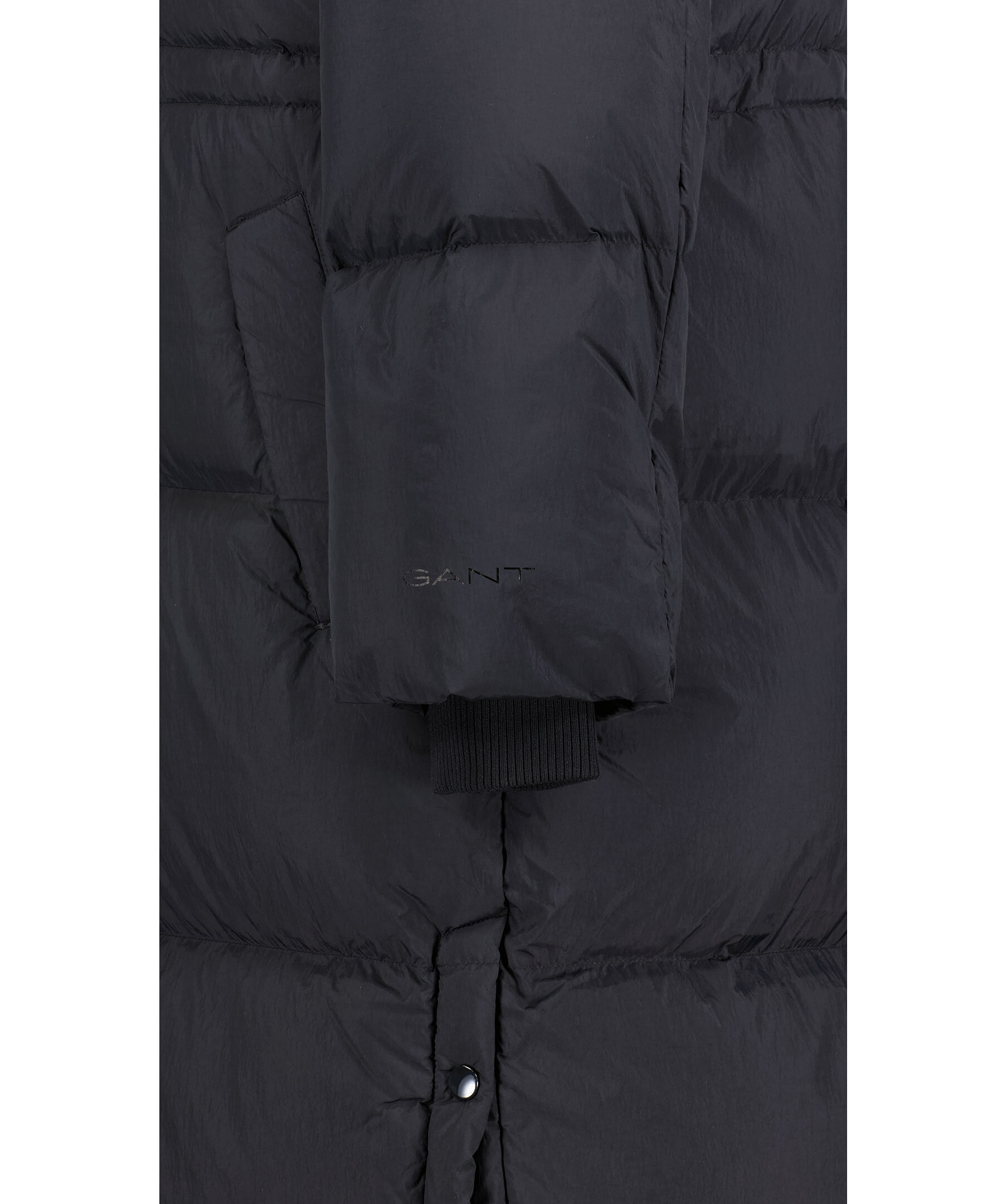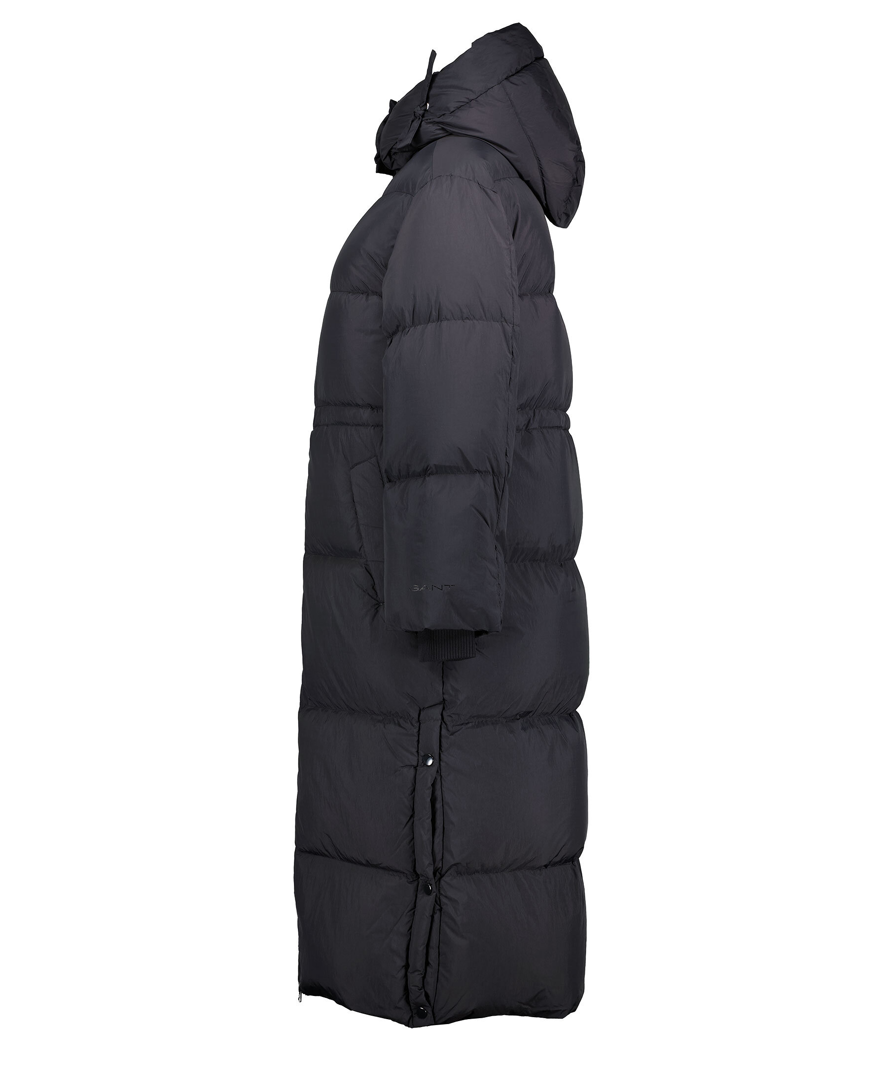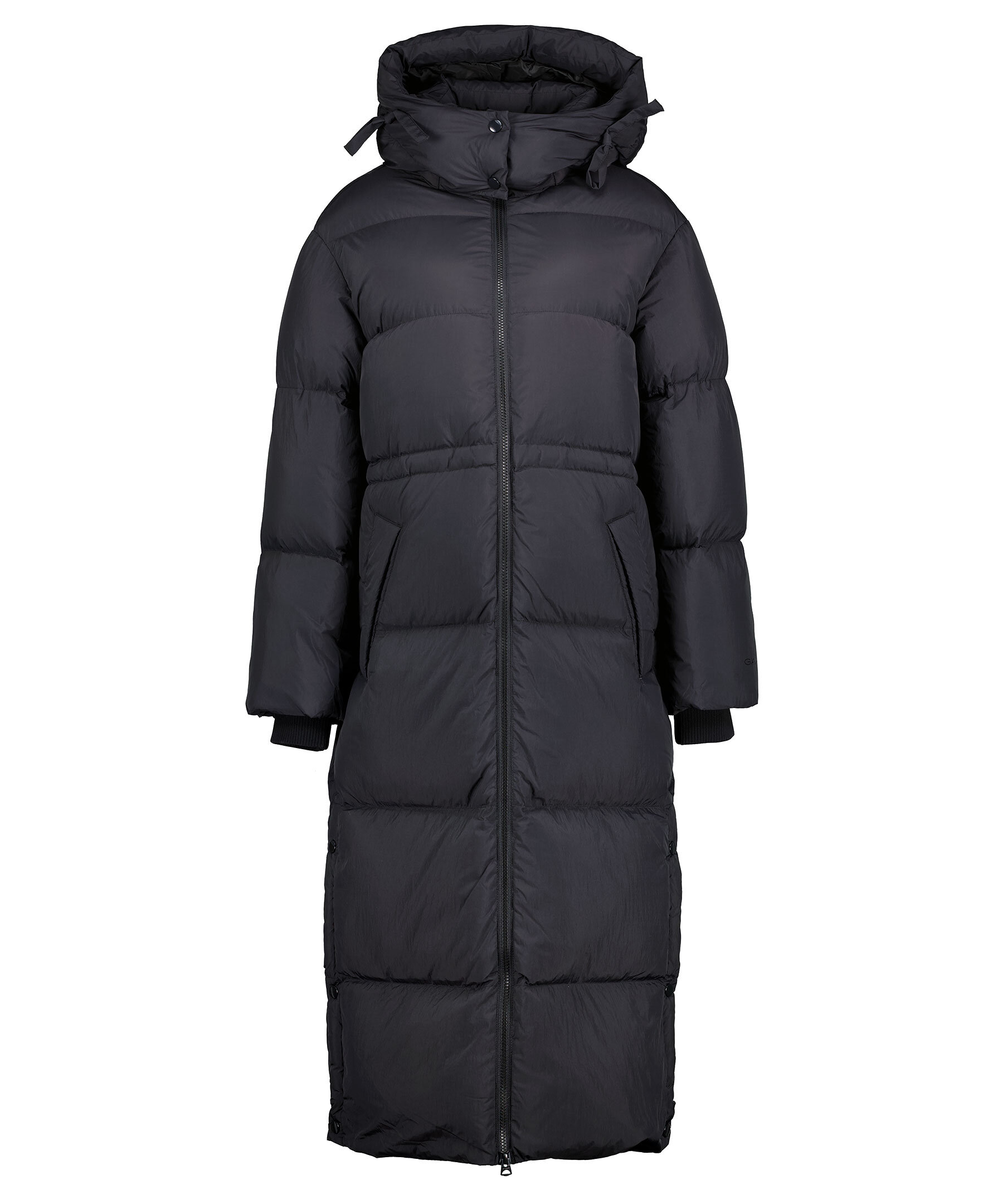 Svart lång quiltad dunjacka från Gant. Stängs framtill med tvåvägs dragkedja. Dragsko i midjan. Avtagbar luva med dragsko. Tryckt logotyp vid vänster ärmslut. Två fickor framtill, en bröstficka som stängs med dragkedja. Tillverkad i vattenavvisande material. Avslappnad passform. Slitsar i sidorna som stängs med tryckknappar. Ribbstickade muddar vid ärmslut.
