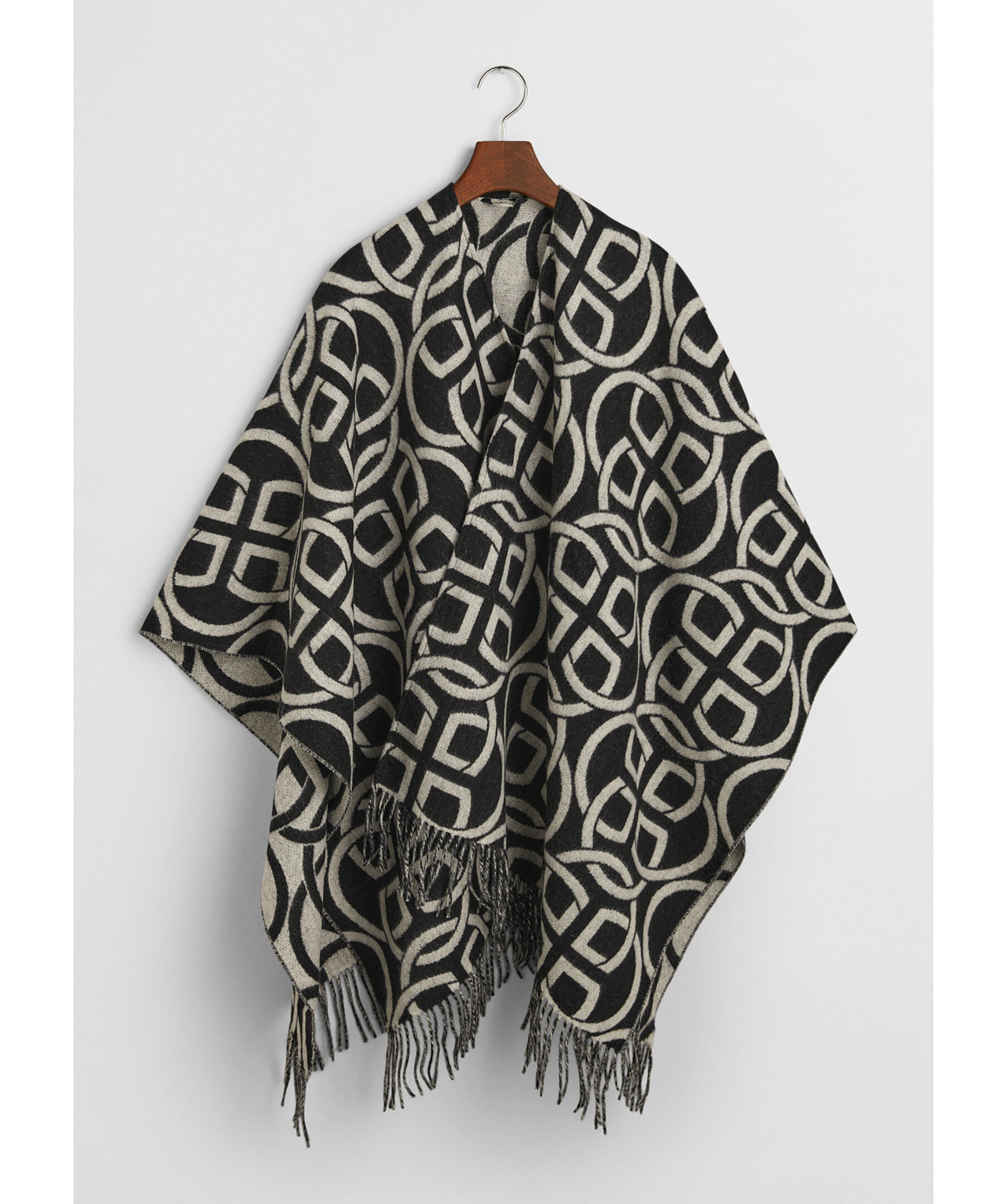 Svart poncho från Gant. Ponchon har fransar i kanterna, tvåfärgad G-mönstrad monogramdesign i jacquard samt broderad GANT-logotyp i vänster hörn. Tillverkad i merinoull. Mått: L 210 cm x B 125 cm