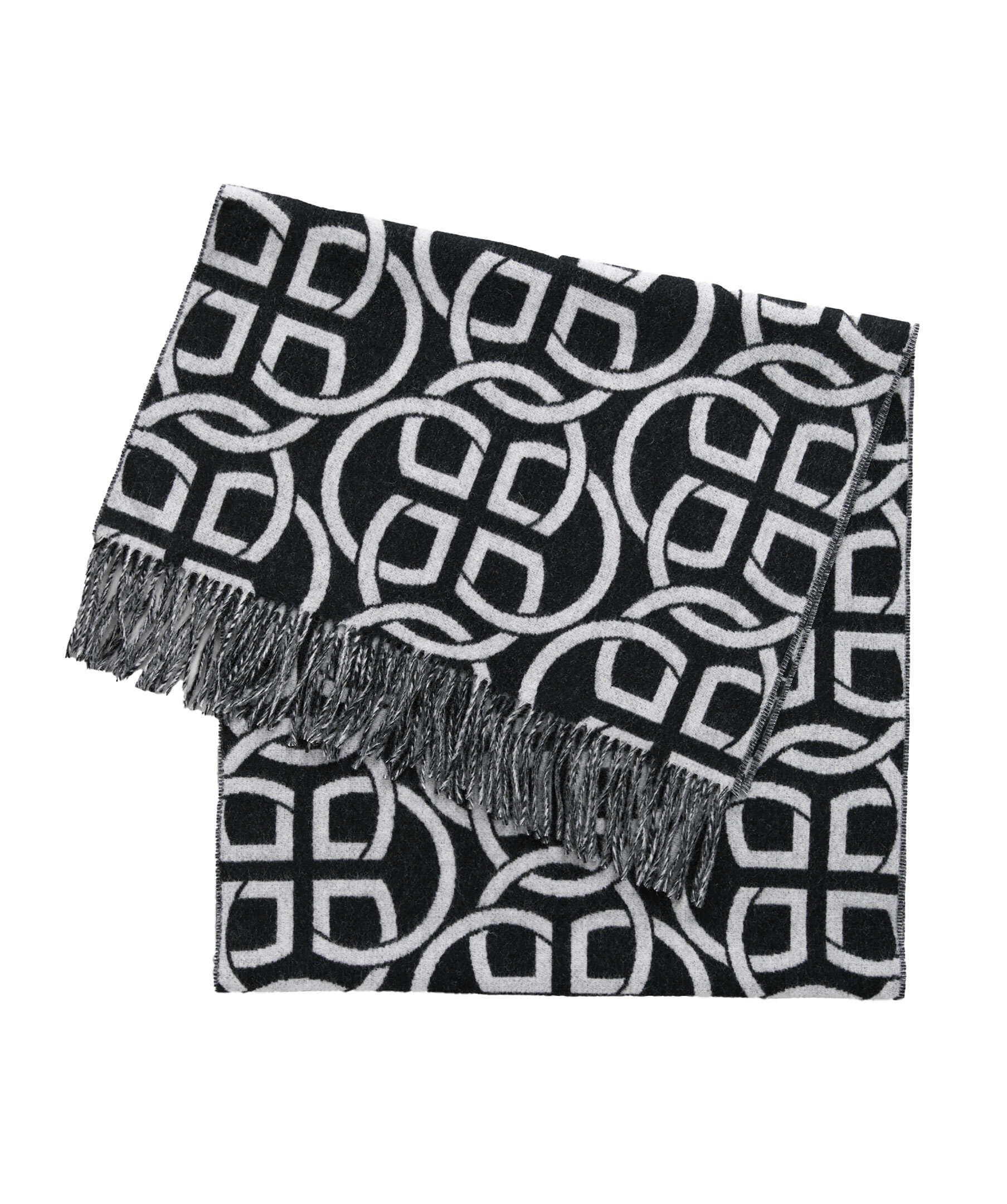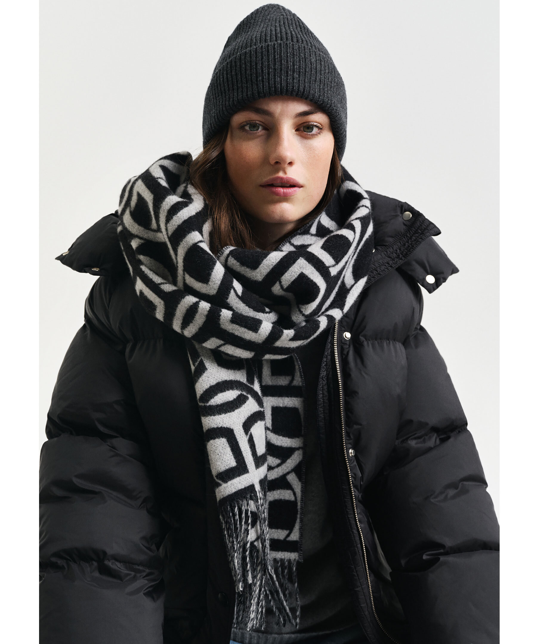 Svart och grå halsduk från Gant. Halsduken har fransar i kanterna, broderad GANT-logotyp längst ner och ett heltäckande G-mönster i jacquard. Halsduken är vändbar och tillverkad i 100% merinoull. Mått: 180 x 50cm.