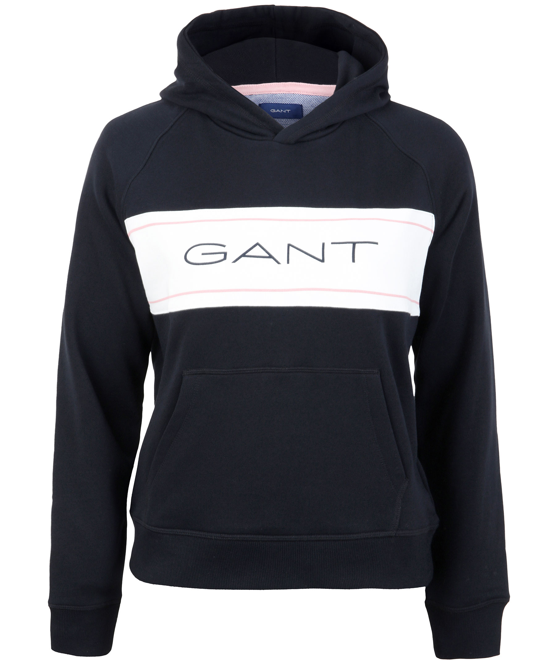 Svart hoodie från Gant. Tillverkad i bomullsmix. Vitt parti med logotyp på bröstet, ficka på magen och ribbade muddar.