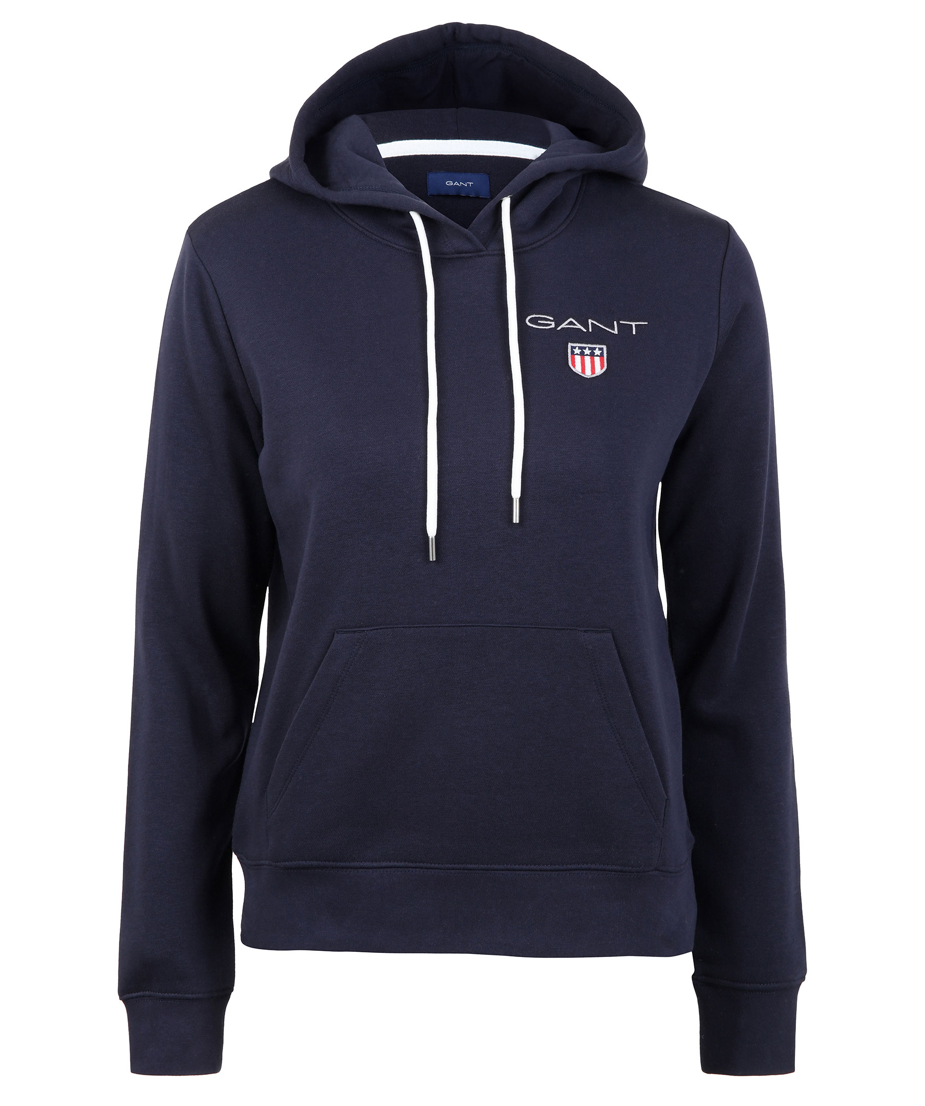 Marinblå hoodie från Gant. Tillverkad i bomullsmix. Broderad logotyp på bröstet, ficka på magen, vita snören samt muddar i ärmslut.