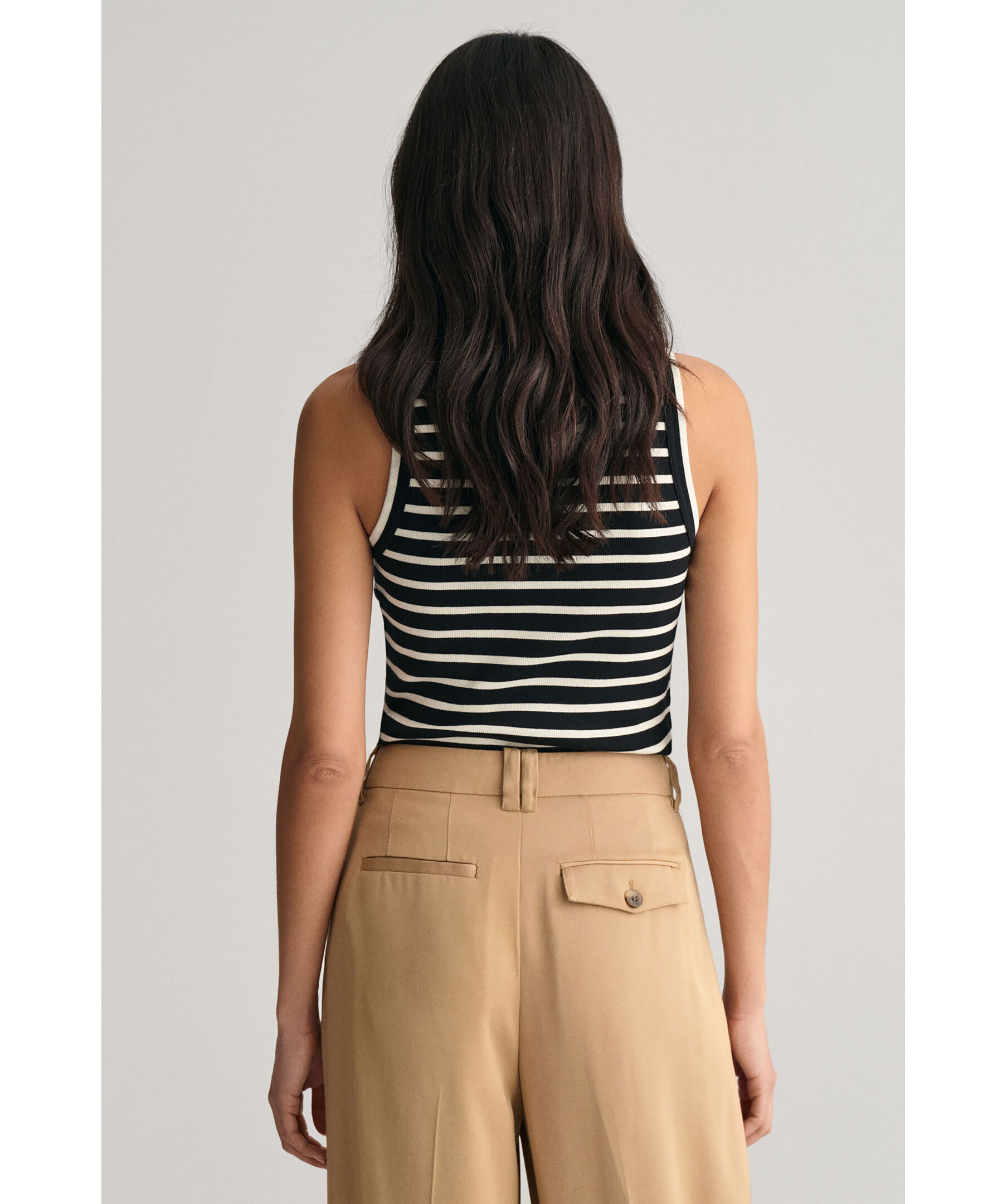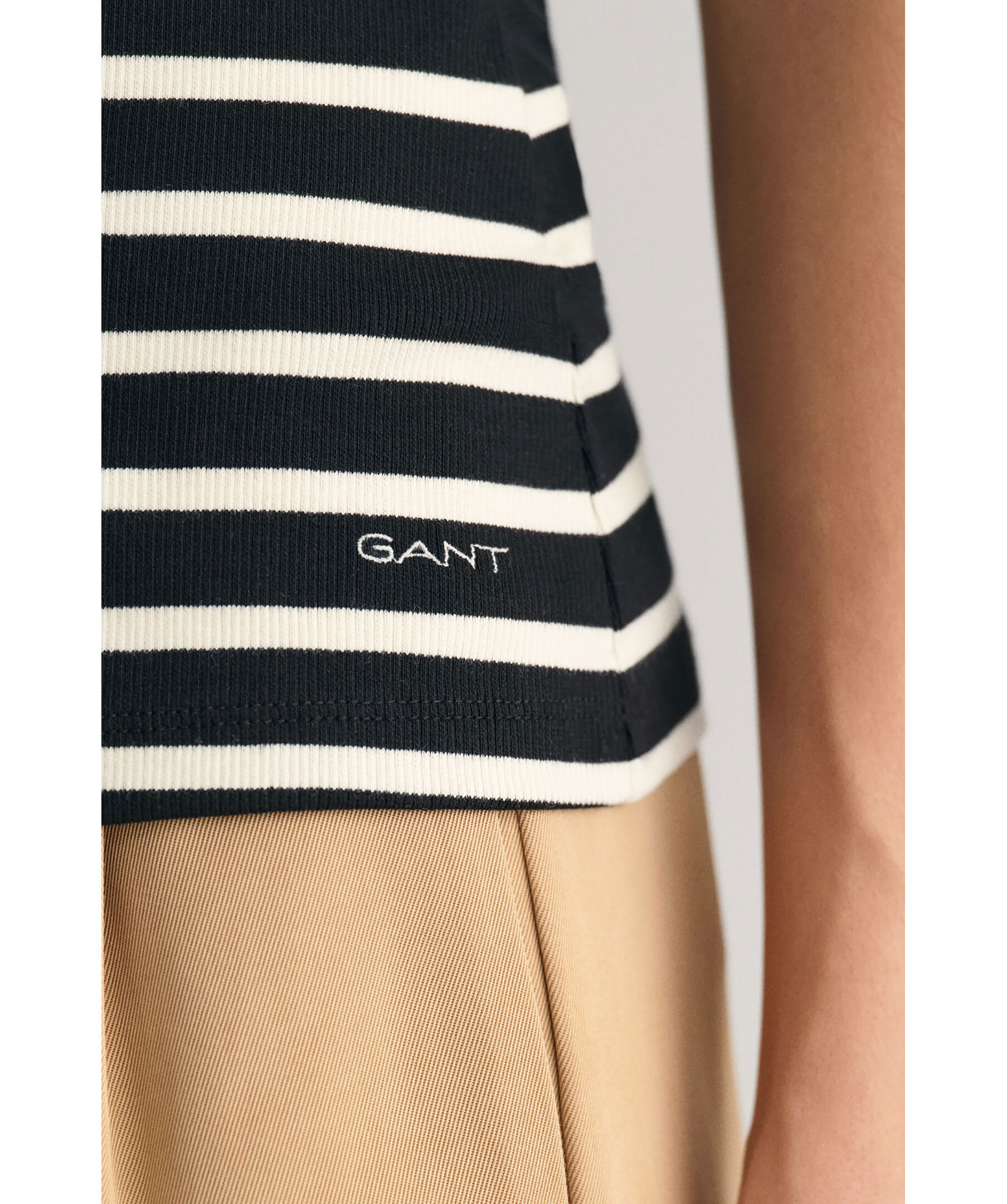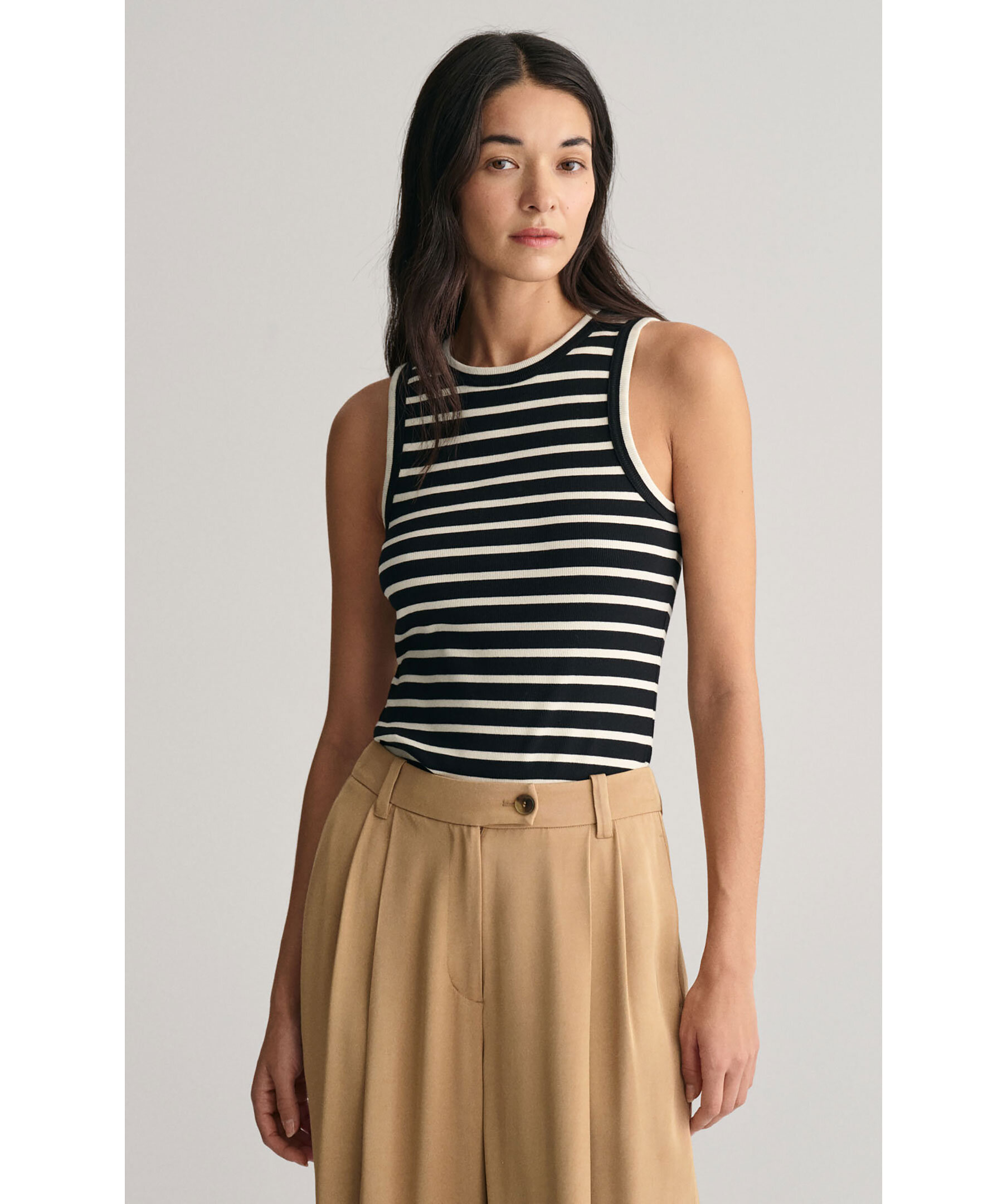 Svart och vitt linne med horisontala ränder från Gant. Linnet har en smal passform som är ett väldigt användbart plagg i garderoben. Designat med ribbstickad struktur och hög, rund halsringning med dekorativa tvillingsömmar. Tillverkat i en bomullsblandning.
