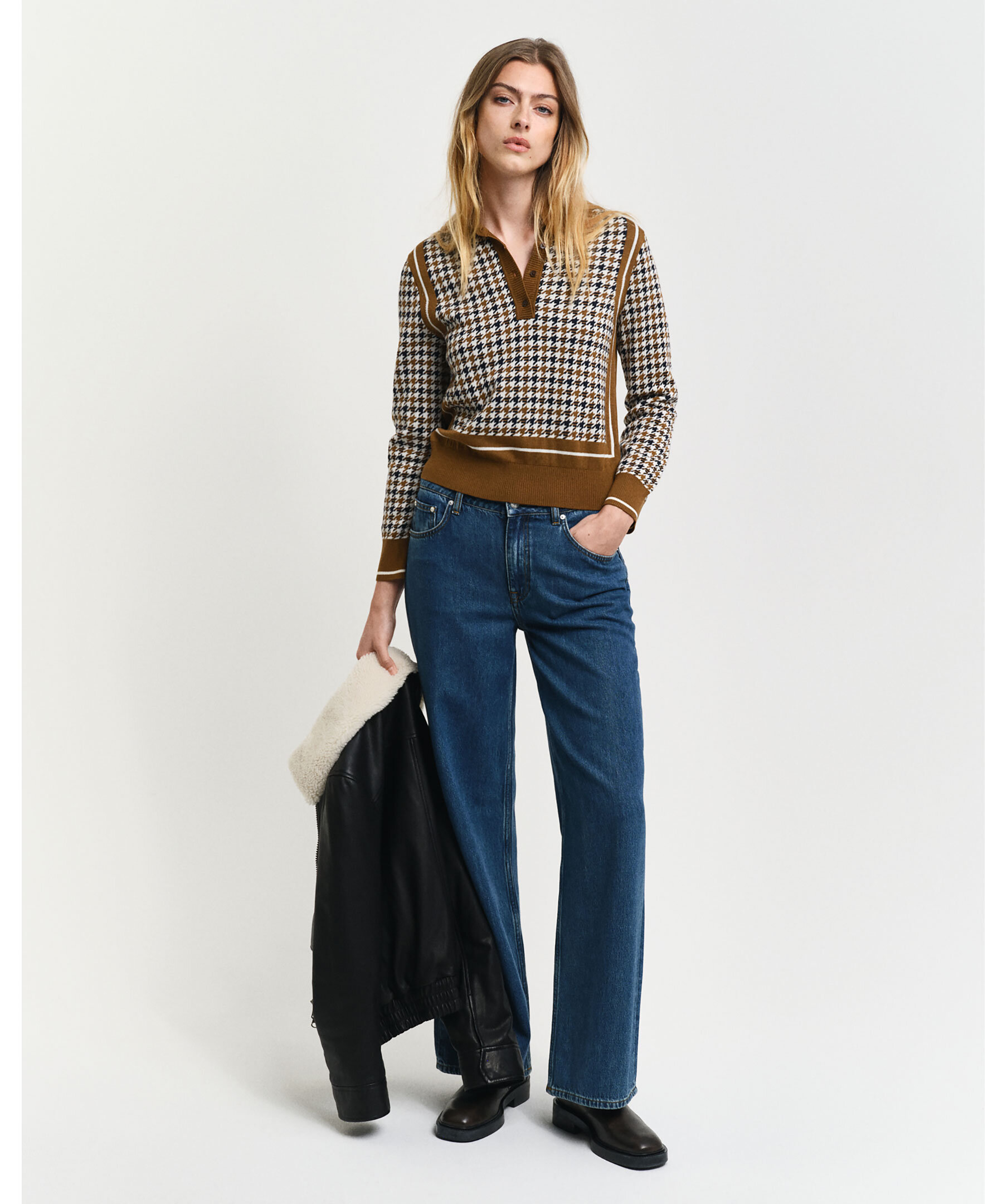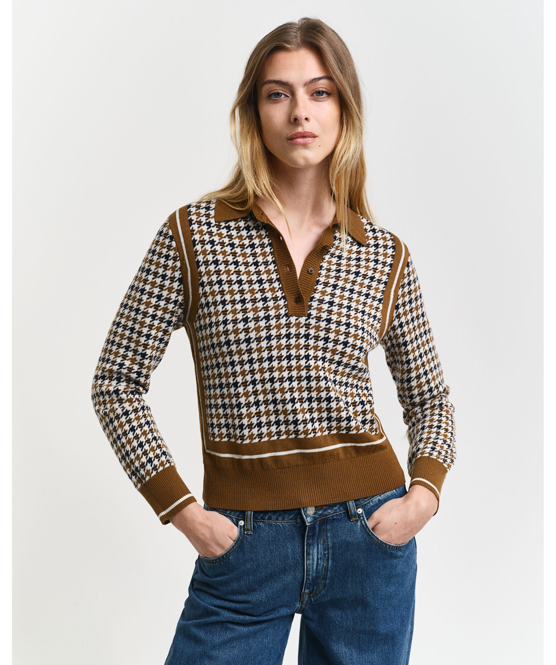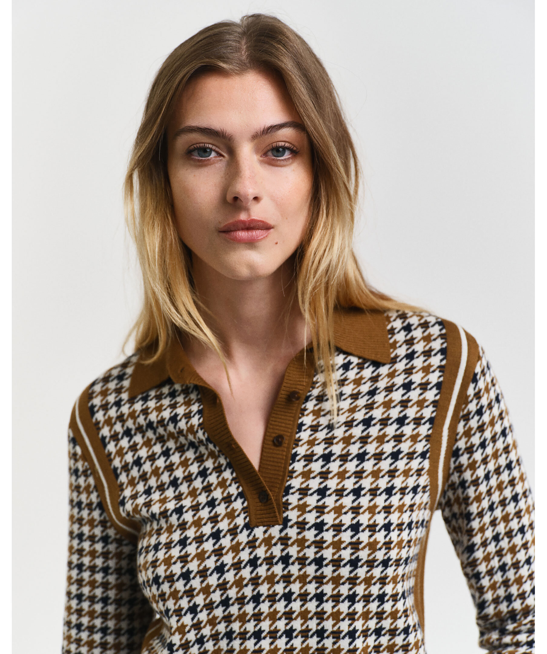 Tröjan i 100% supermjuk merinoull har rugbykrage och normal passform. Tröjan är klassiskt hundtandsmönstrad med blockfärgad ram på livet och kontrastfärgade kanter vid de ribbstickade ärmsluten.