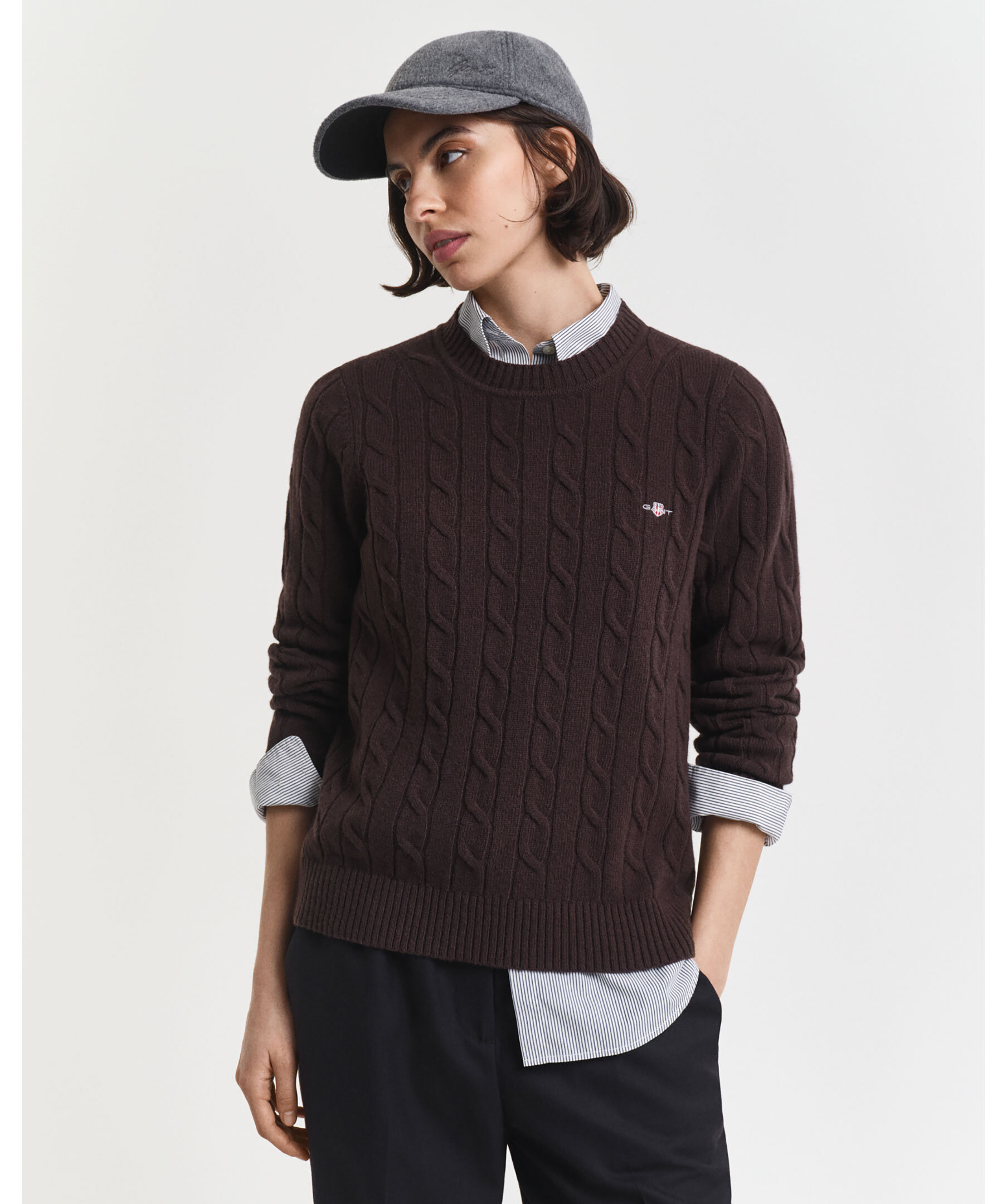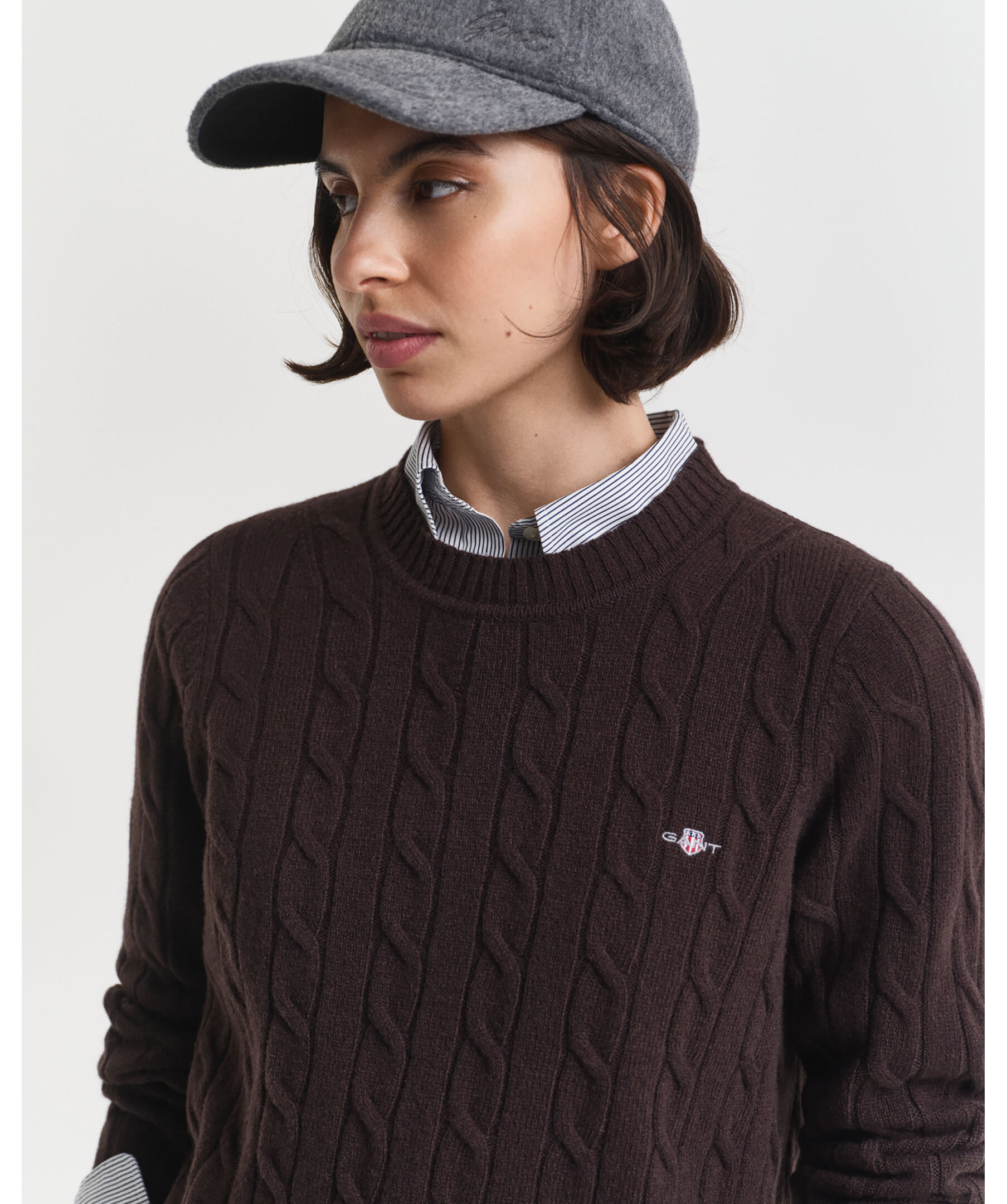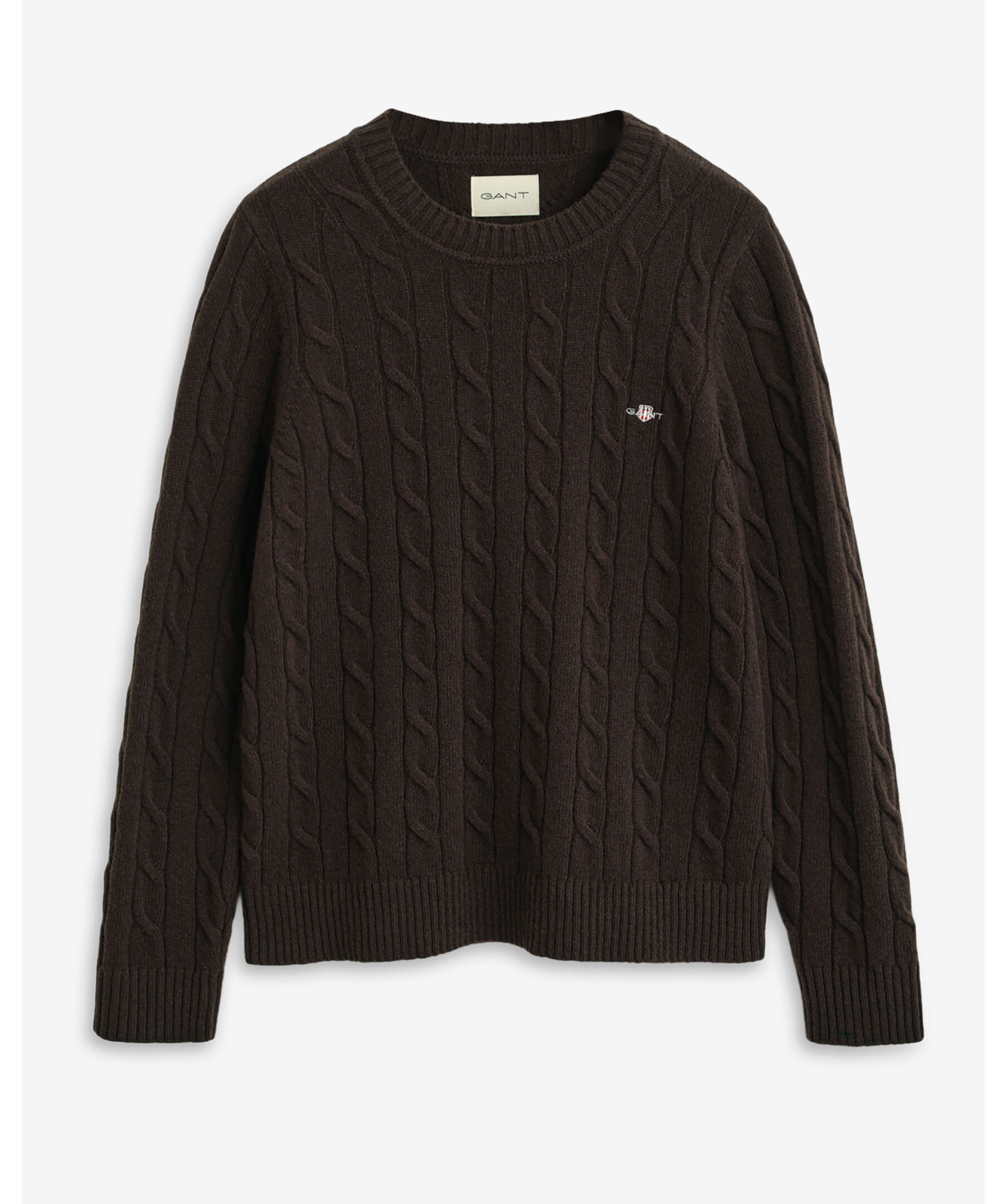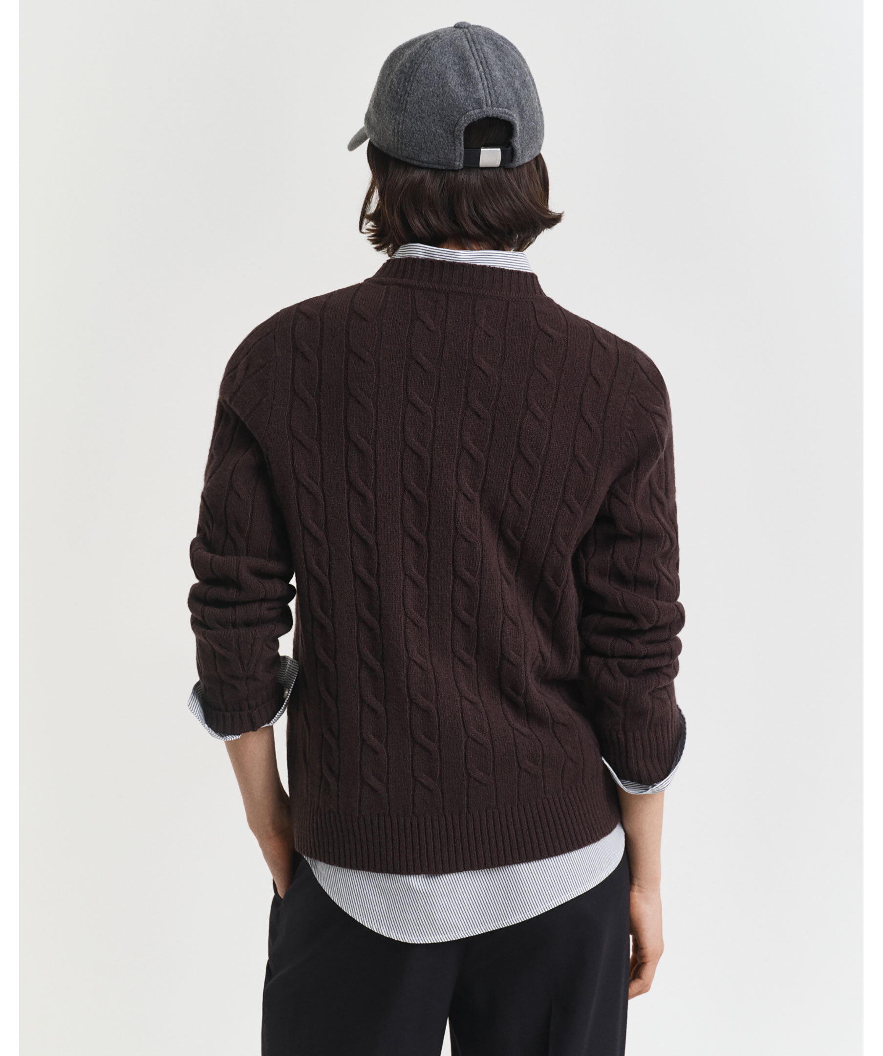Kabelstickad tröja från GANT med rundad hals och är stickad i 100 % lammull. Den är normal i passformen och har ribbade kanter vid halsringning, ärmslut och nederkant. På bröstet finns en broderad GANT-logga som ger en stilren och tidlös detalj.