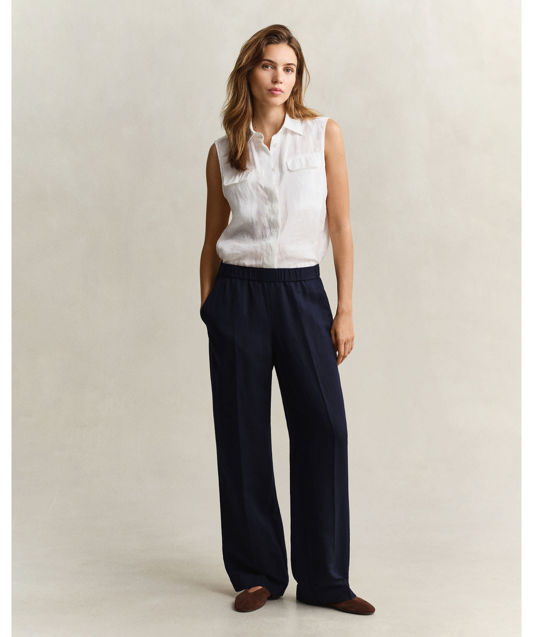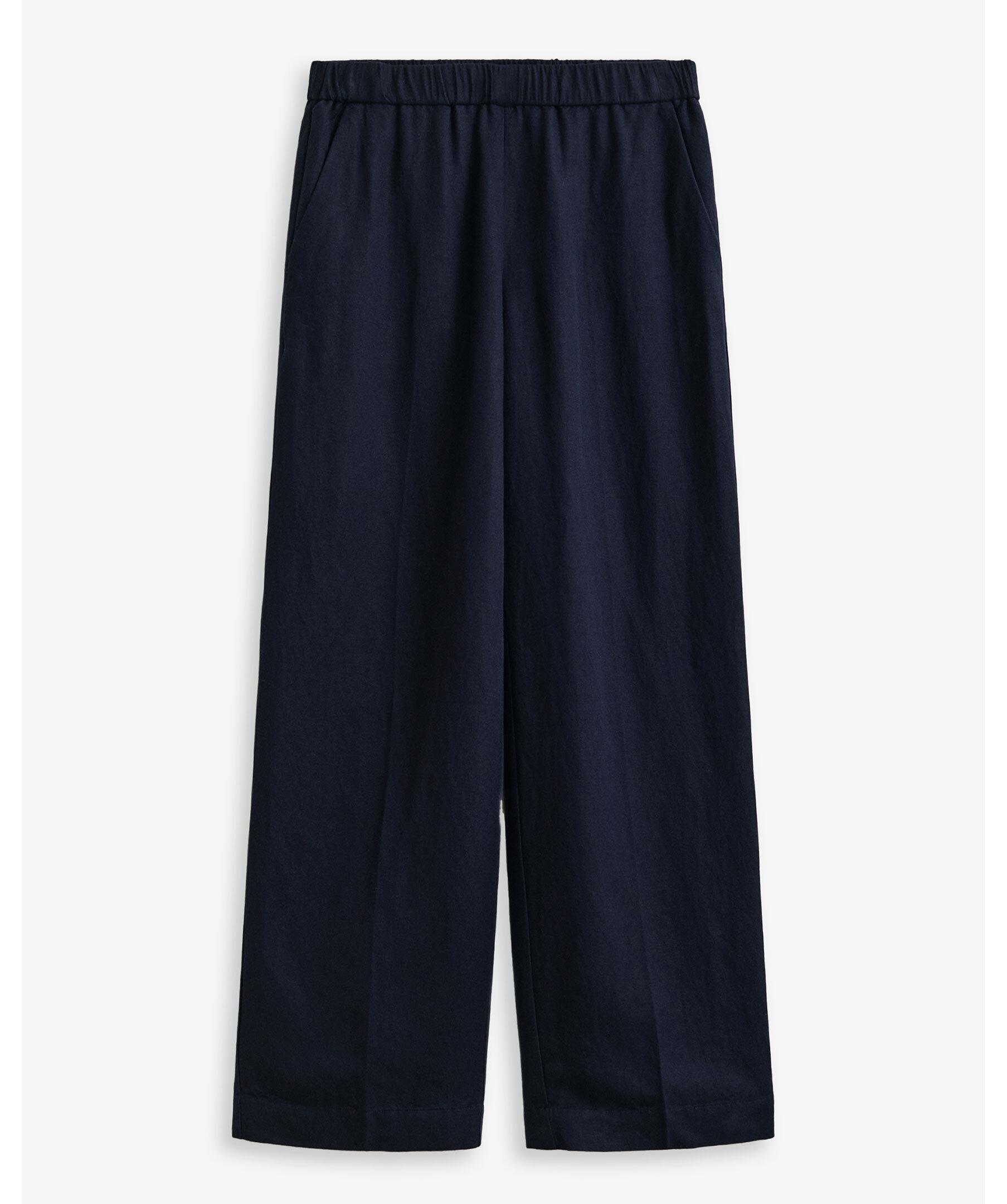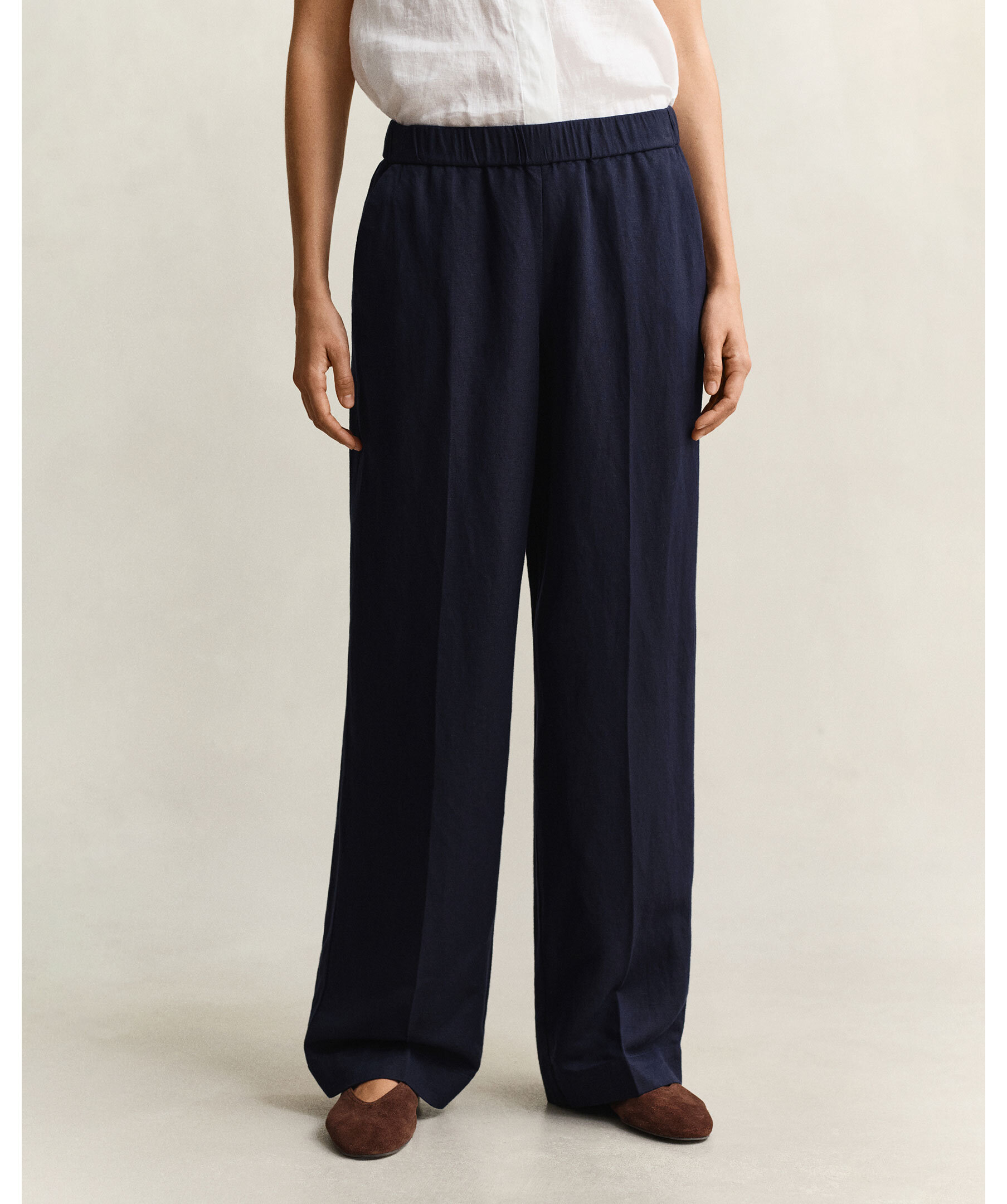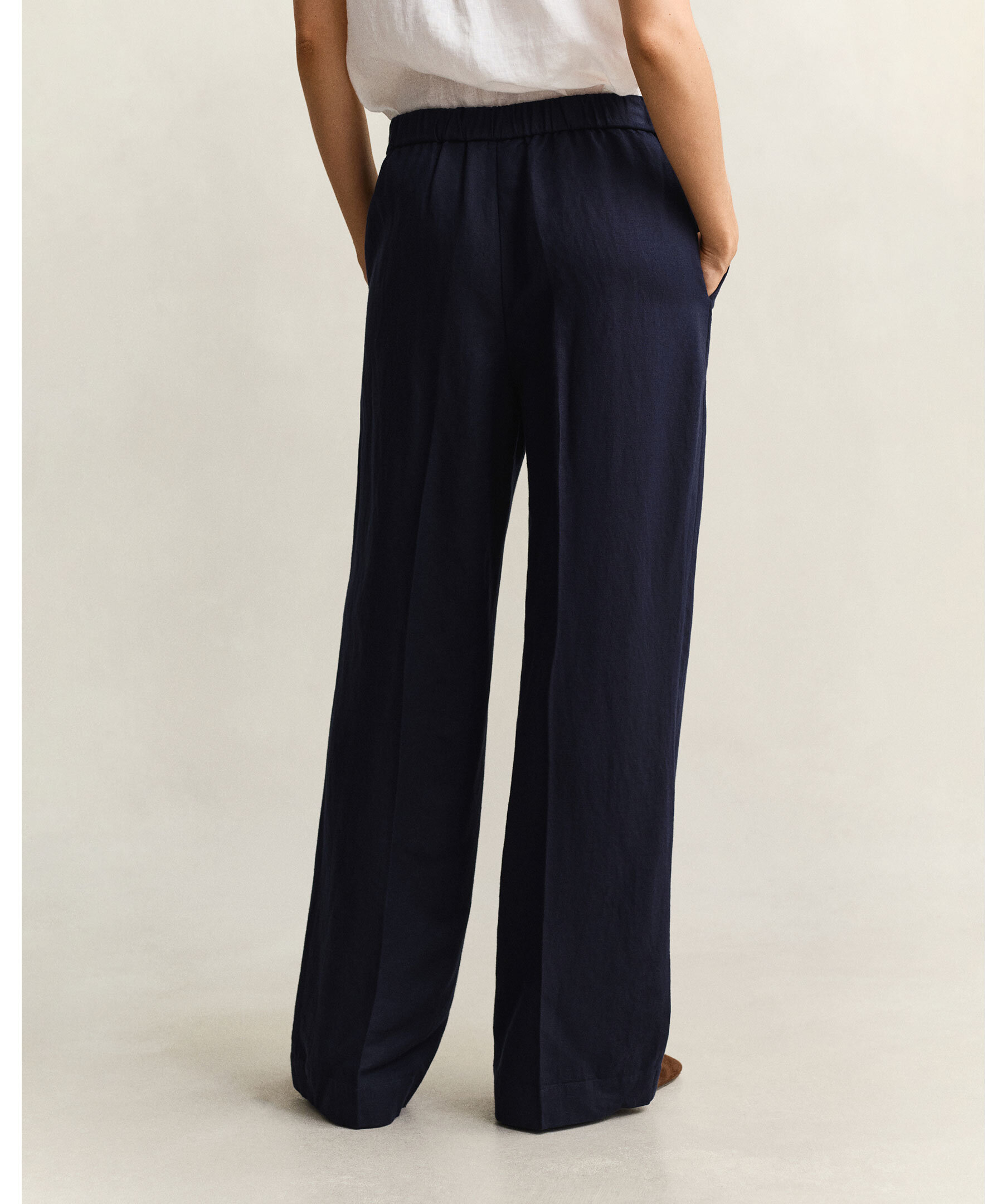 Marinblå byxor i avslappnad passform från Gant är tillverkade i en blandning av lin och viskos, vilket ger mjuk fall och subtil lyster. De har midjemodell, raka ben och dras enkelt på med elastisk midja. Ytterligare detaljer är snedställda framfickor, pressveck och hög sömfinish vid nederkanten.
