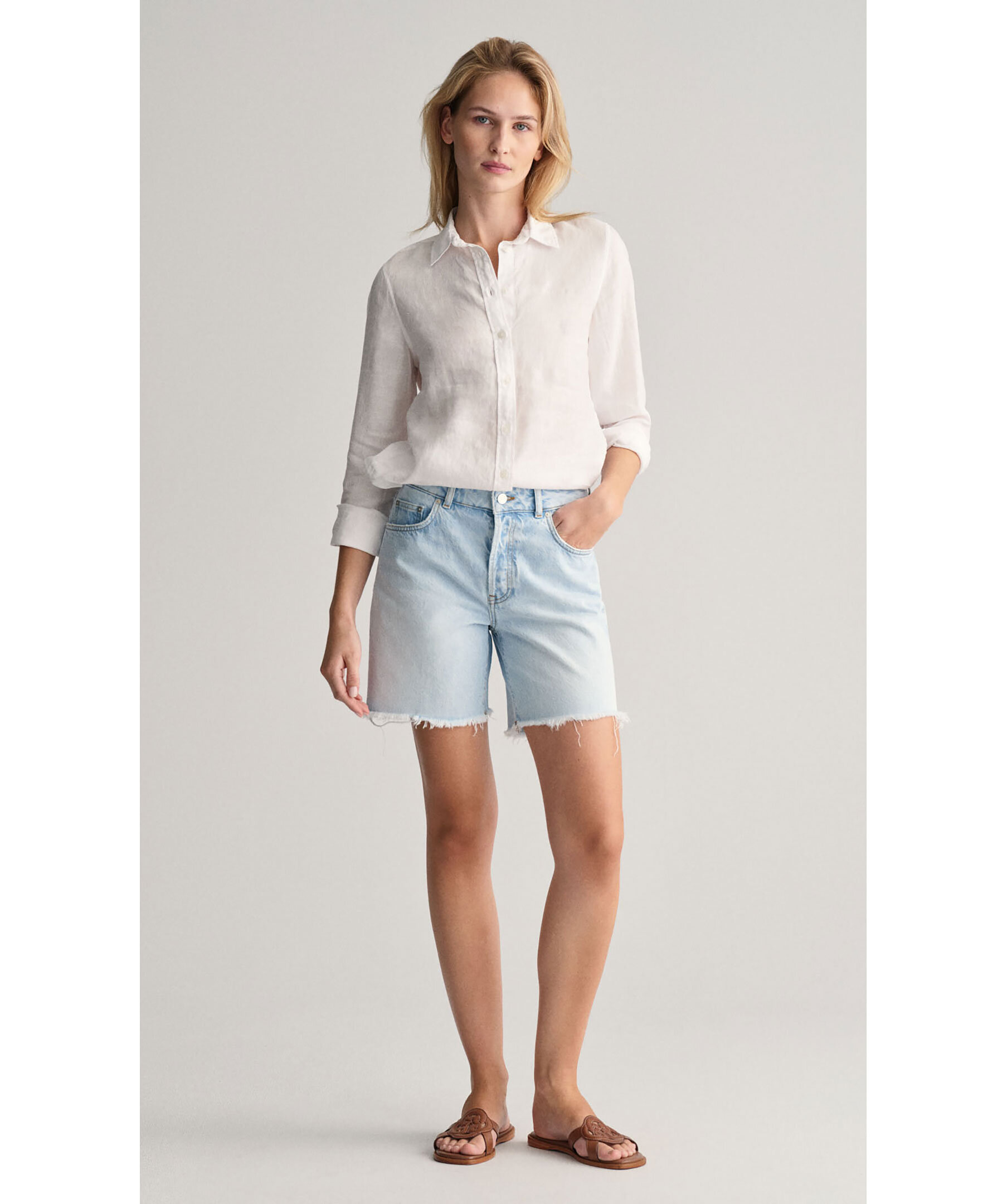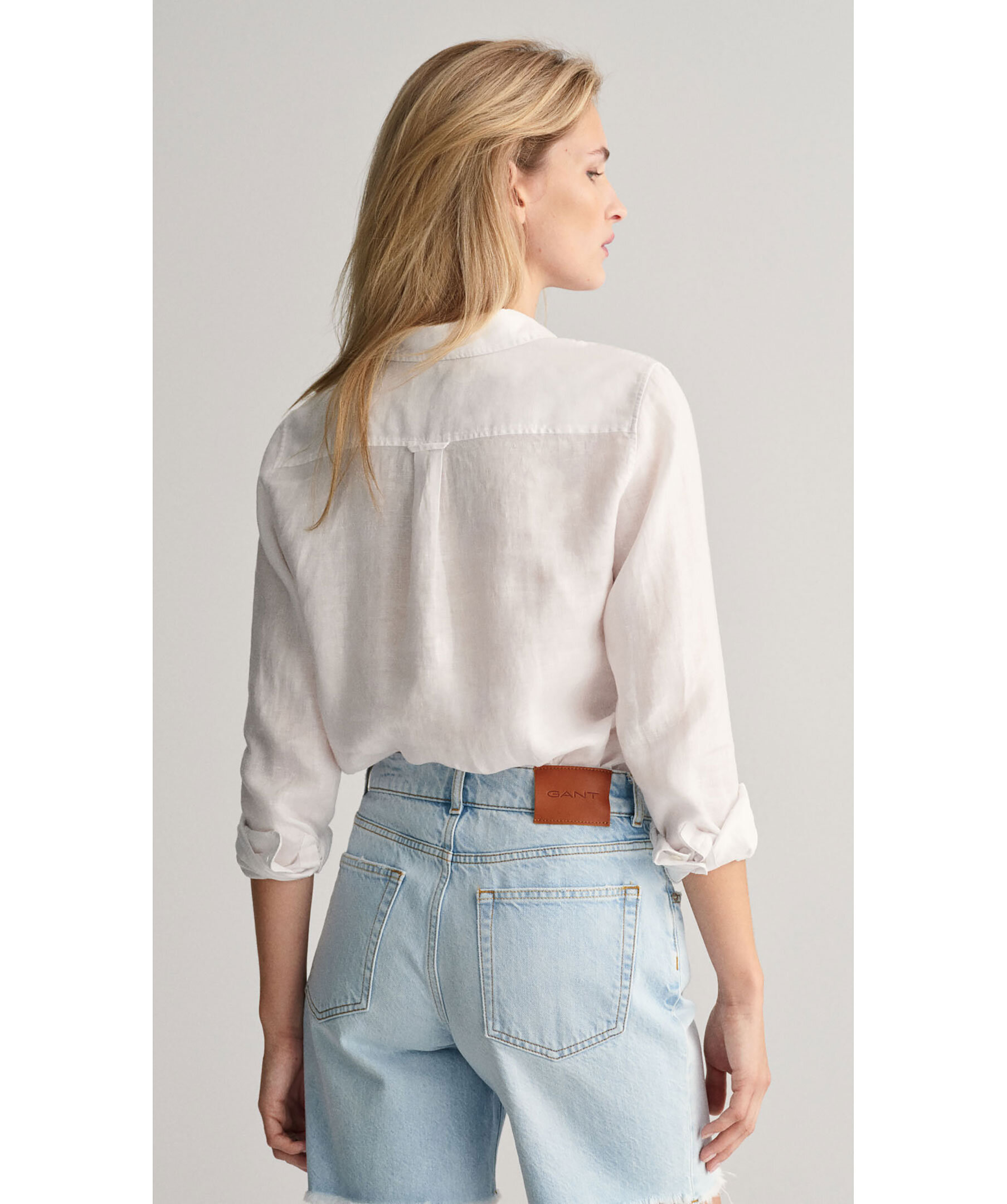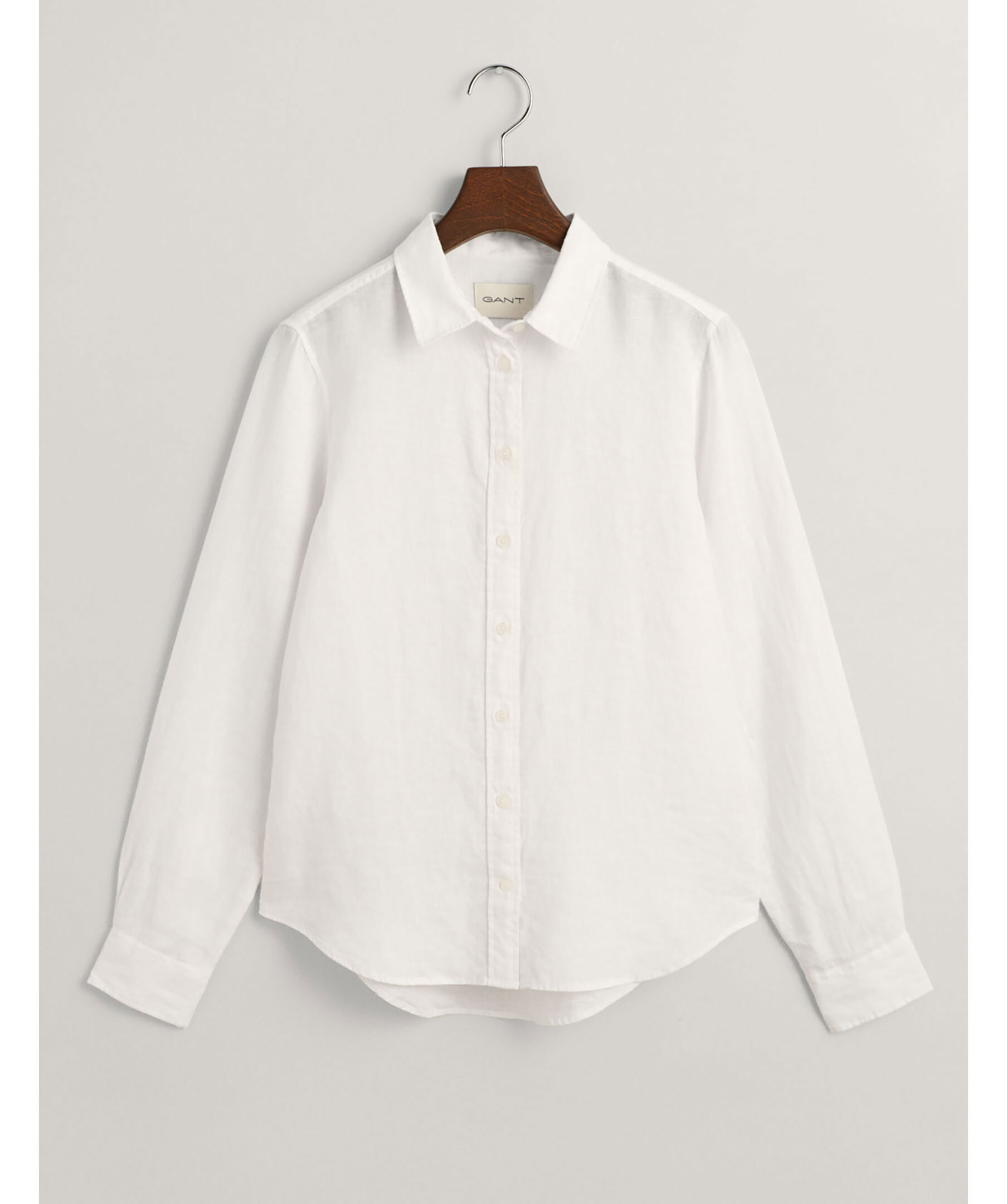 Vit linneskjorta från Gant. Stängs framtill med knappar. Spetsig krage. Broderad logotyp på vänster bröst. Enkla, justerbara manschetter. Boxpleat och locker loop på ryggen.