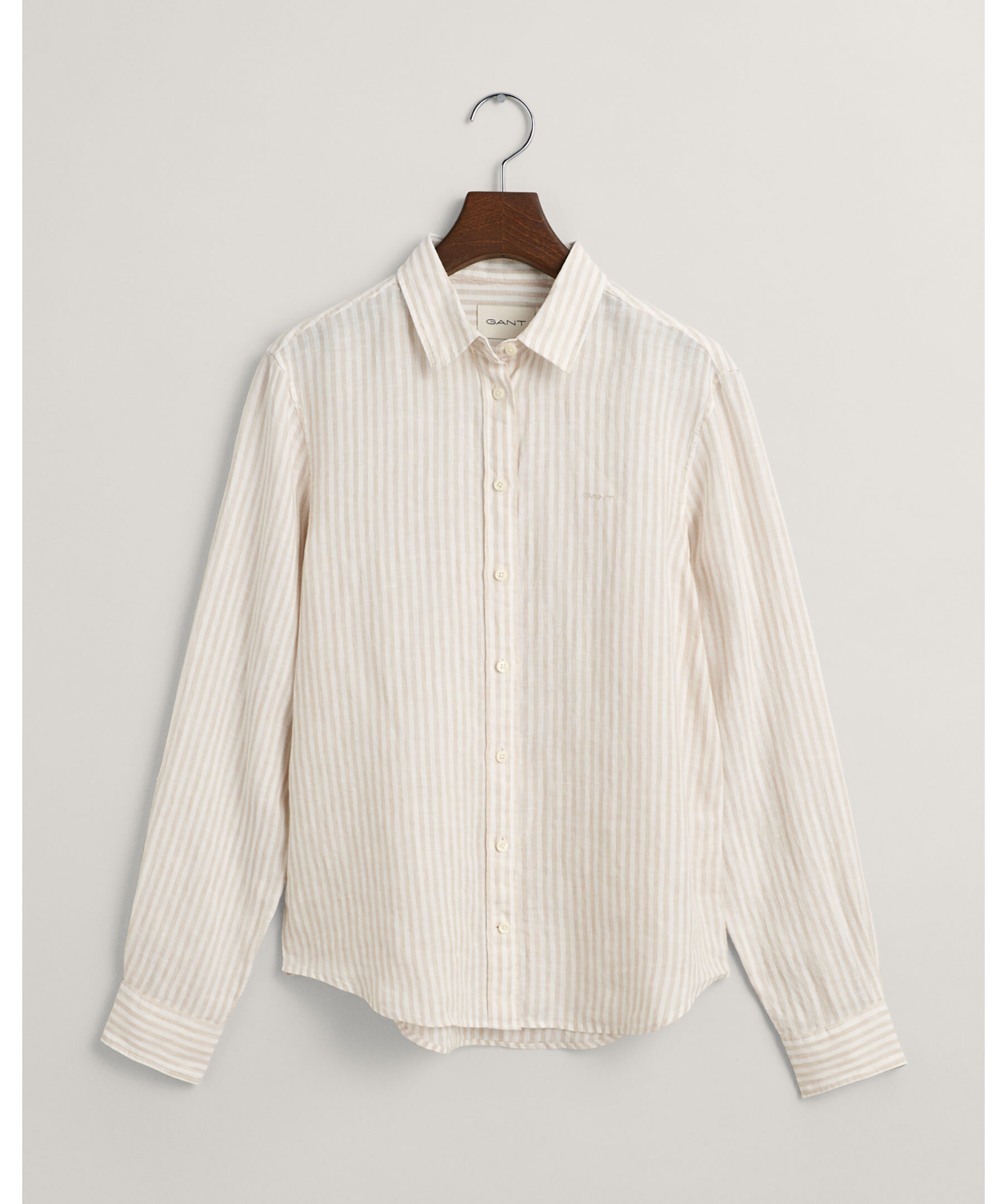 Randig, sandfärgad linneskjorta från Gant. Naturligt lätt och luftig, tillverkad i tunt tvättat linne. Den har en normal passform, point-krage, justerbara manschetter, broderad GANT-logotyp på bröstet och deras klassiska locker loop med boxpleat i ryggen.