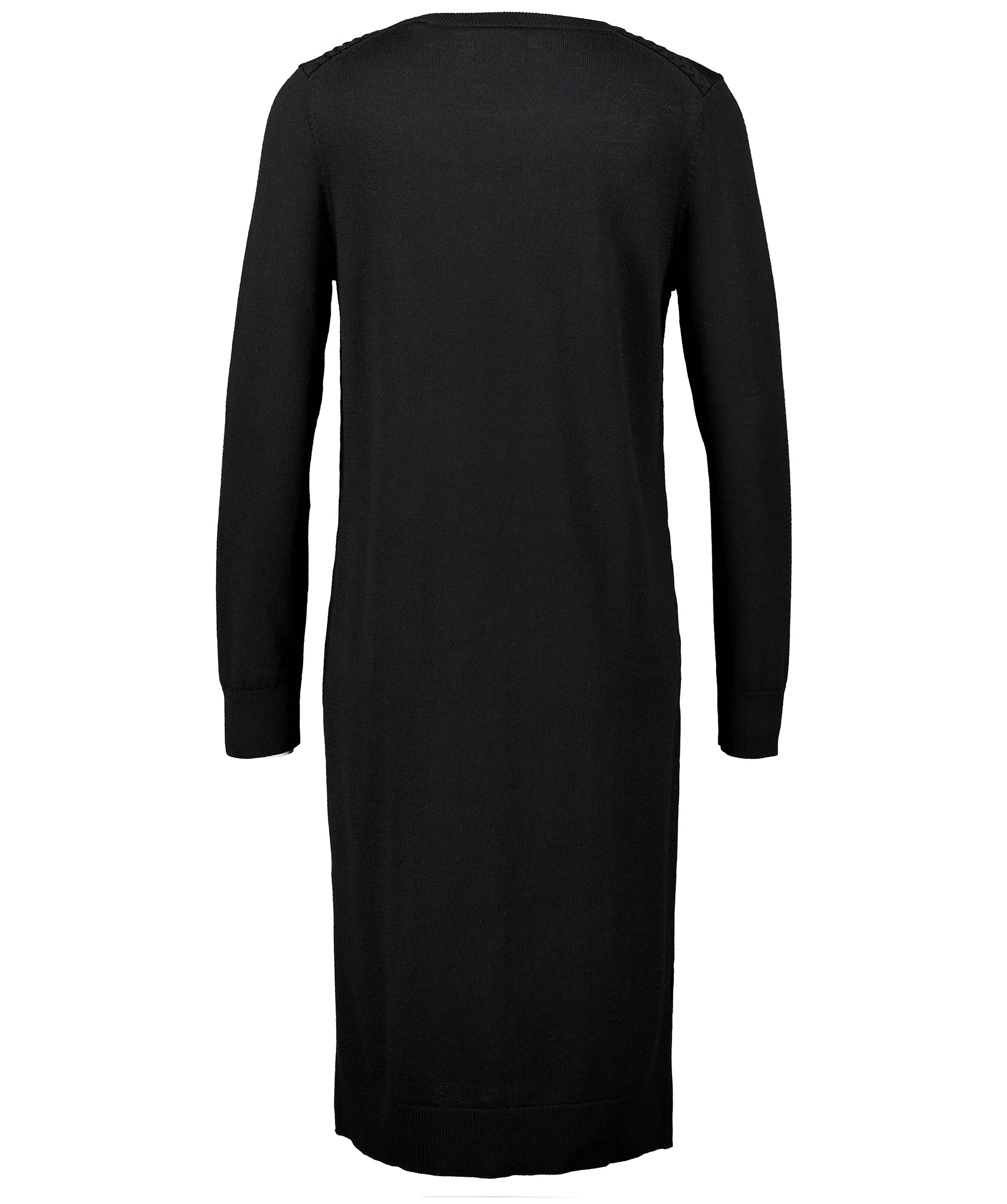 Svart, finstickad klänning från Gant. Liten, svart broderad logotyp på vänster ärmslut. Rak passform, rundad halsringning och ribbstickade muddar i ärmslut, plaggslut och i ringningen. Slitsar i sidorna och tillverkad i 100% merinoull.