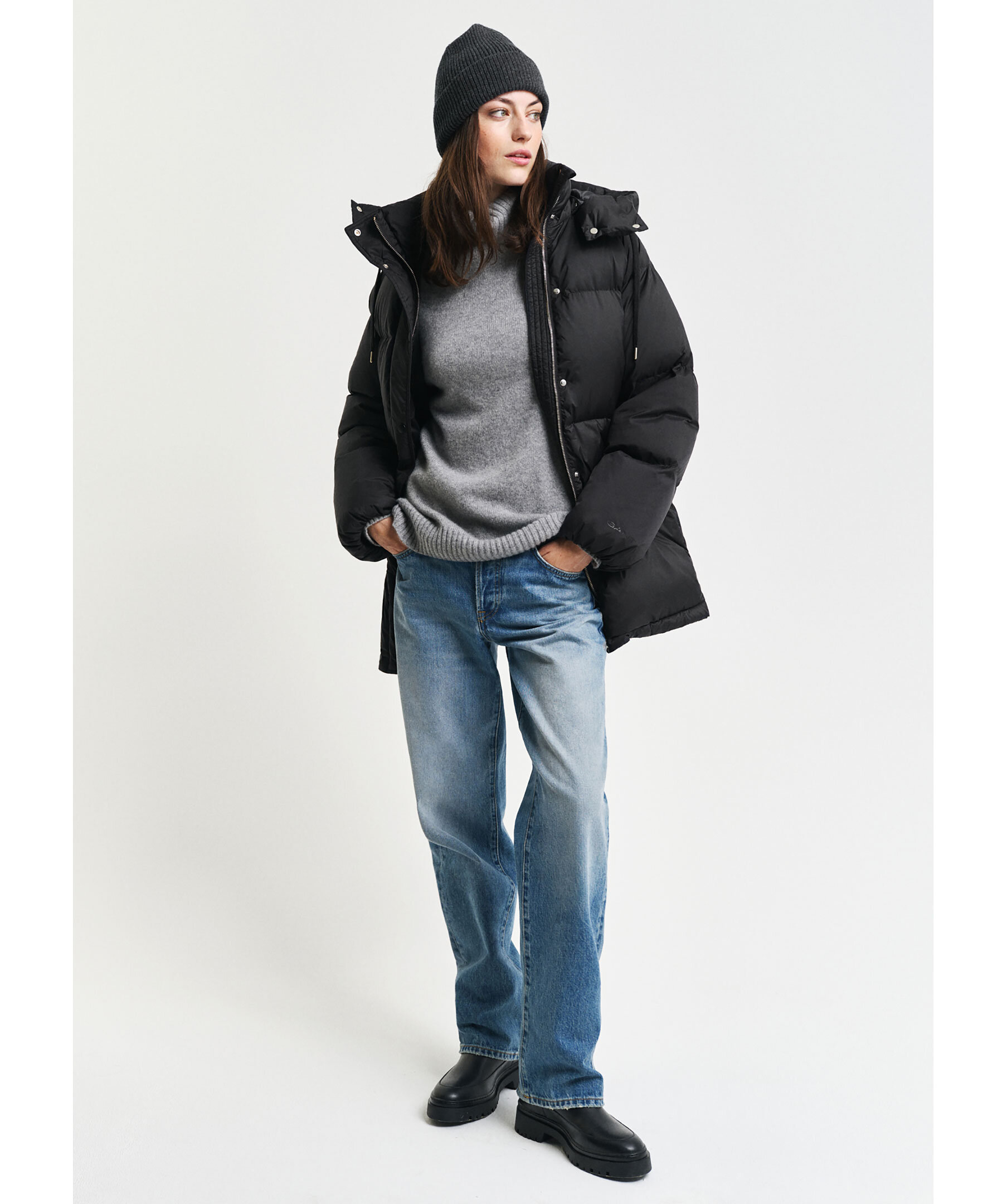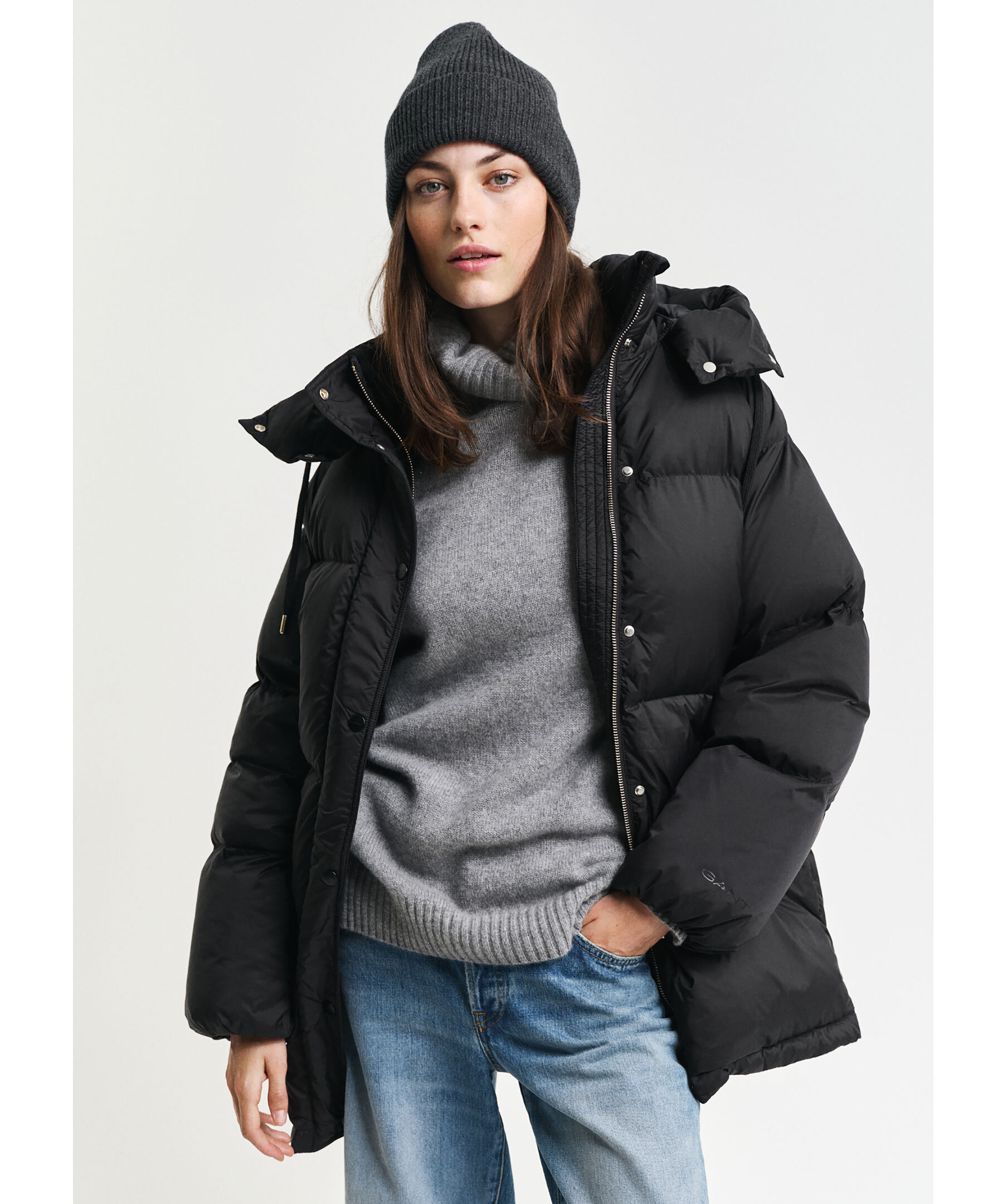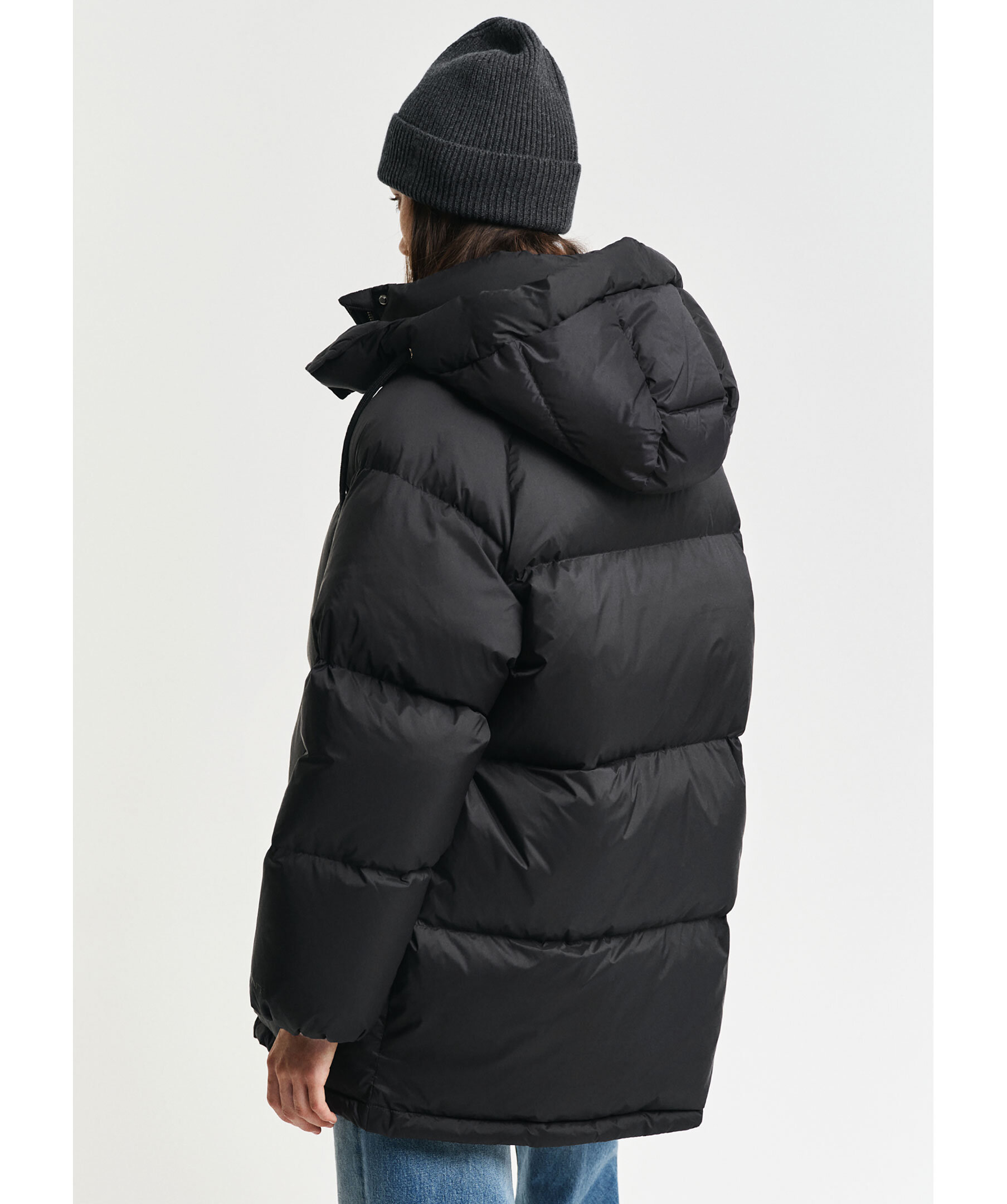 Svart pufferjacka från Gant. Jackan stängs med tvåvägsdragkedja och har avtagbar och justerbar huva, tryckknappar med logotyp, innerficka, och två passpoalfickor fram. Andra detaljer är raglanärmar med resår i ärmsluten samt dragsko i midjan för en åtsmitande passform. Jackan har jacquardfoder med logotyp och en GANT-logotyp i gummi på ärmen. Vattenavvisande och slutar strax nedanför höfterna. Tillverkad i polyamid med dunfyllning.