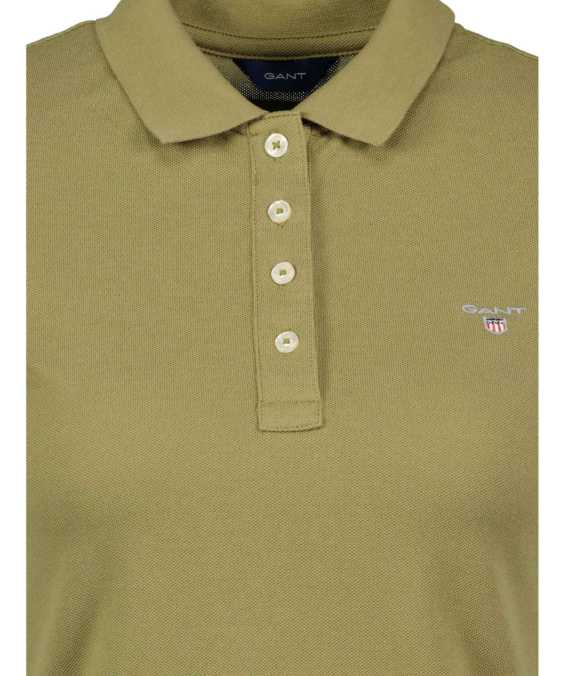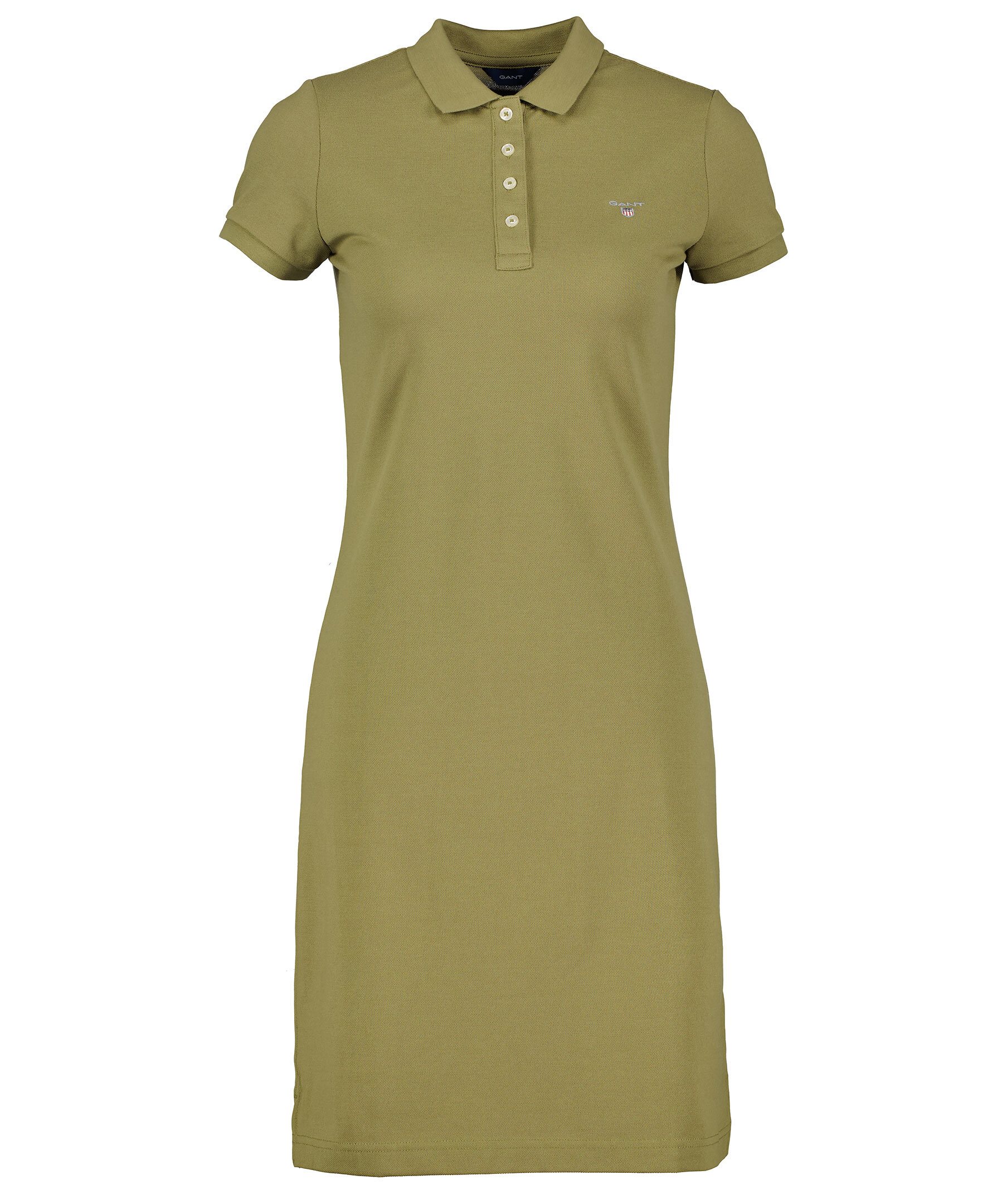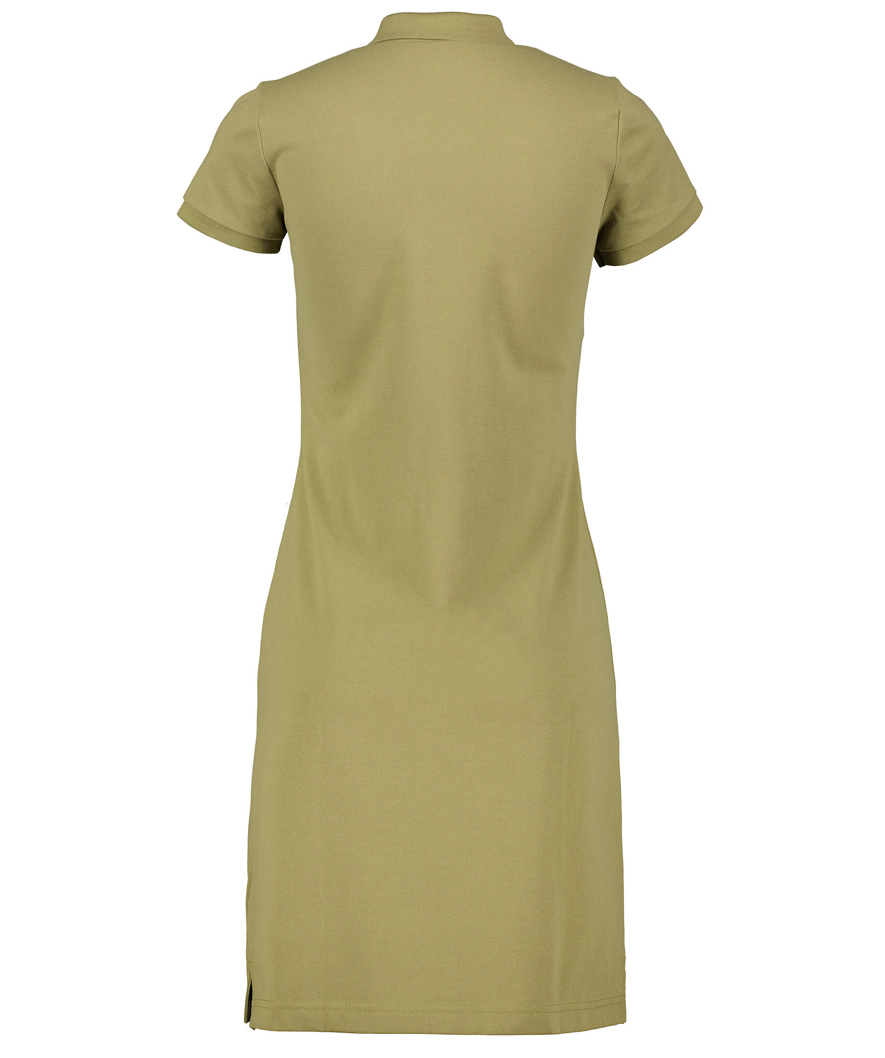 Olivgrön piké klänning från Gant. Ribbstickad krage och ärmslut. Broderad logotyp på vänster bröst. Fyra knappar. Tillverkad i 100% bomull.