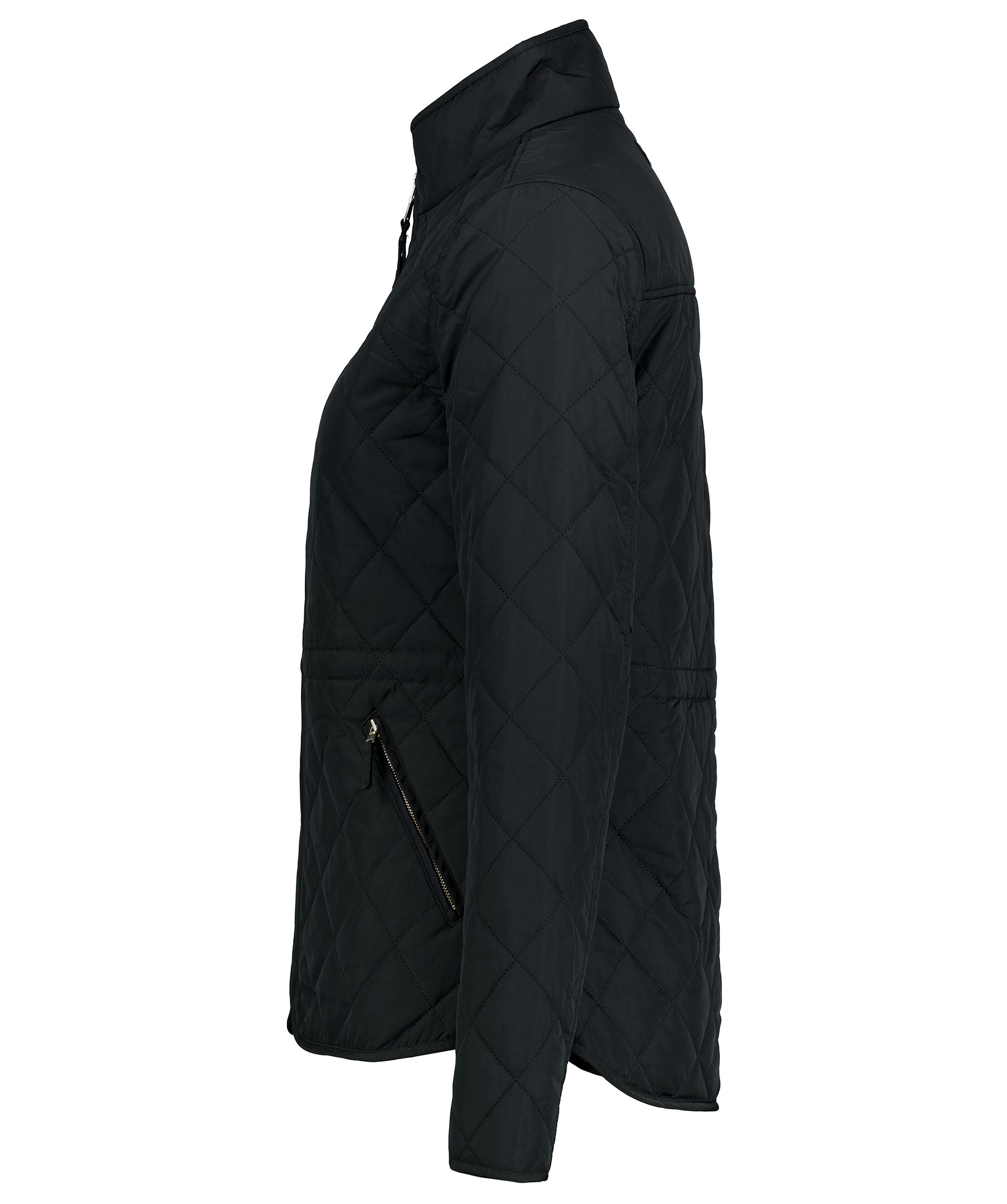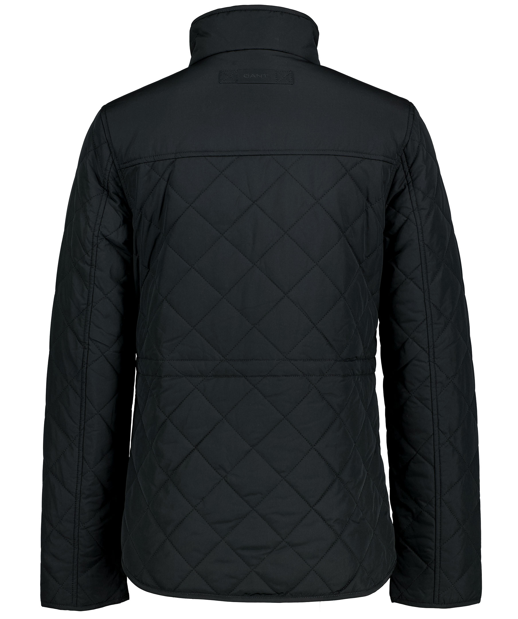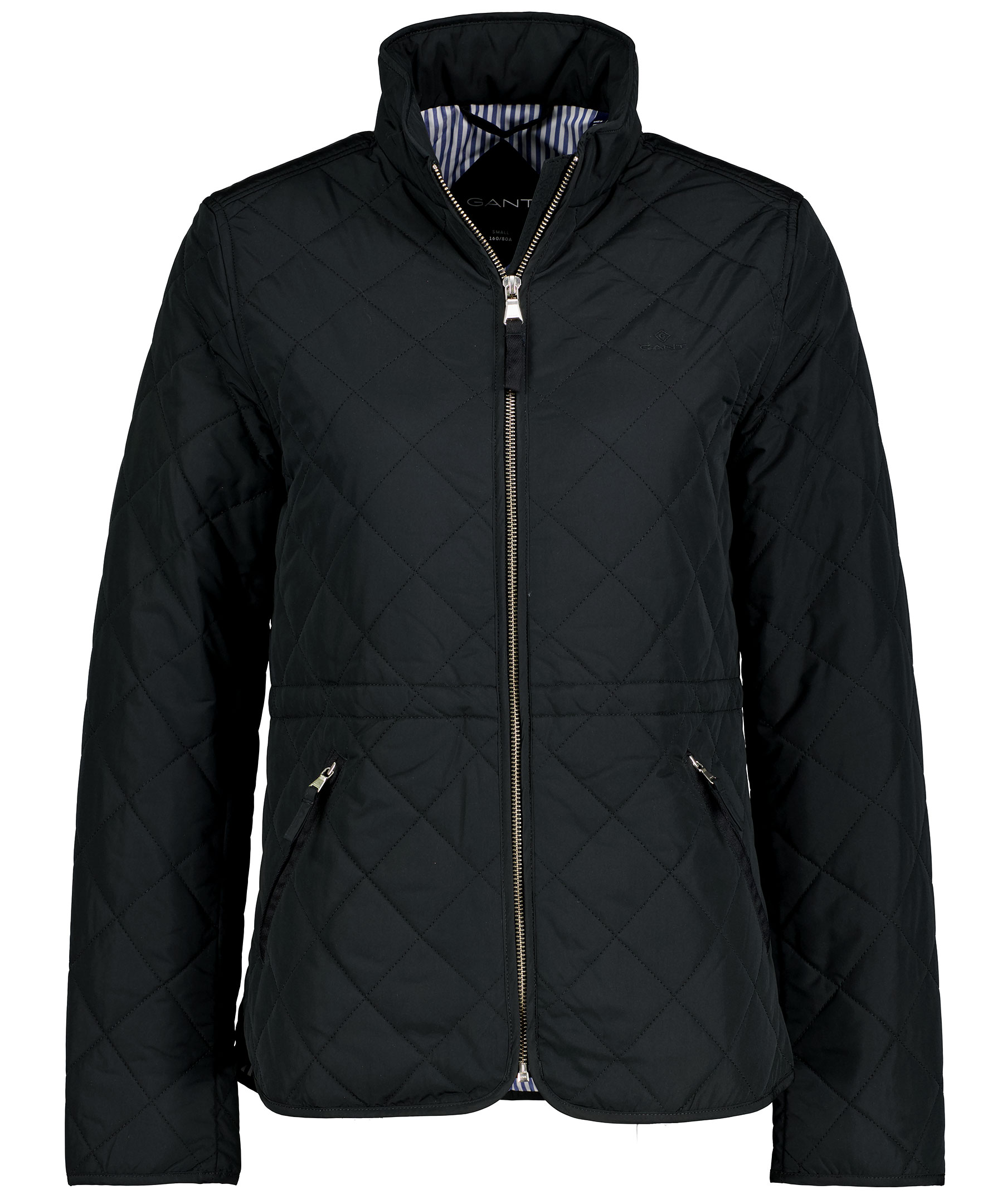 Svart, tunn quiltad jacka i kort modell från Gant. Tillverkad i polyester med lätt fyllning av syntet. Svart broderad logga på bröstet, kort krage, två fickor med dragkedja fram samt dragsko i midjan. Randigt foder i vitt och blått. *100% polyester *Broderad logga *Två innerfickor