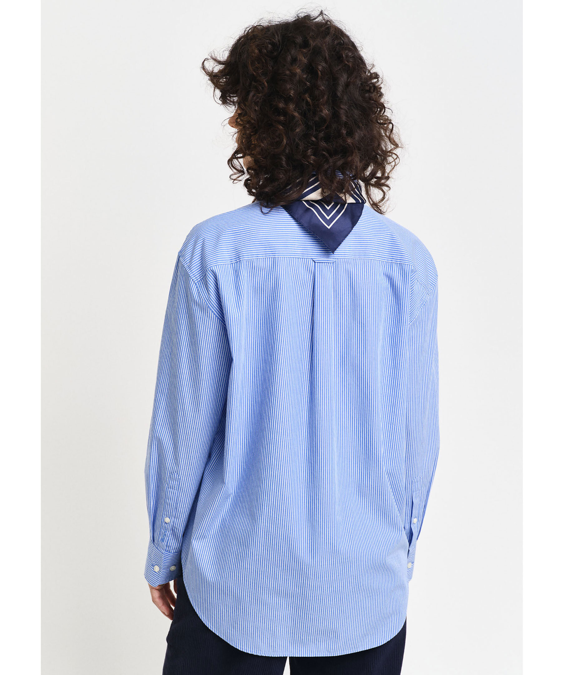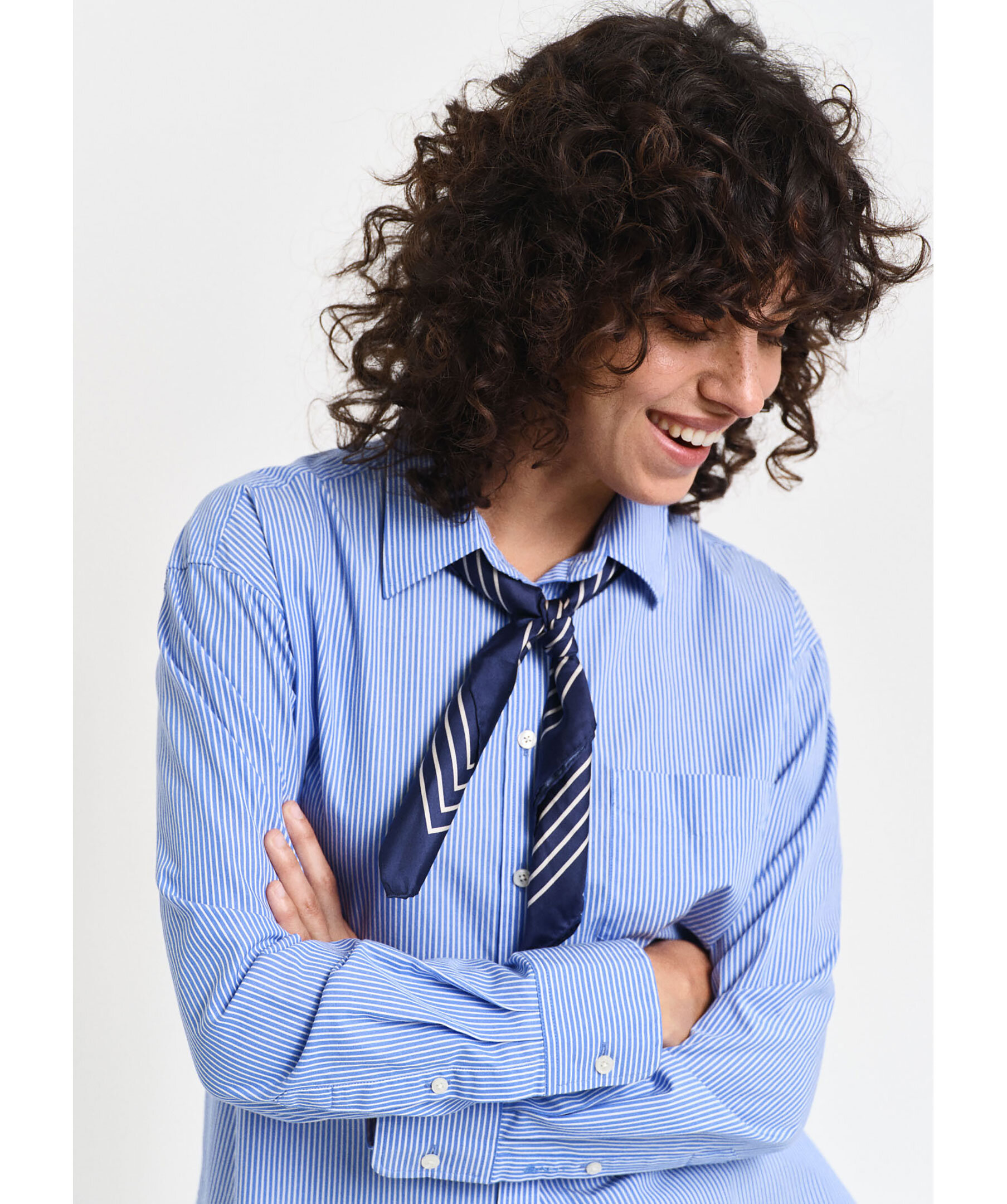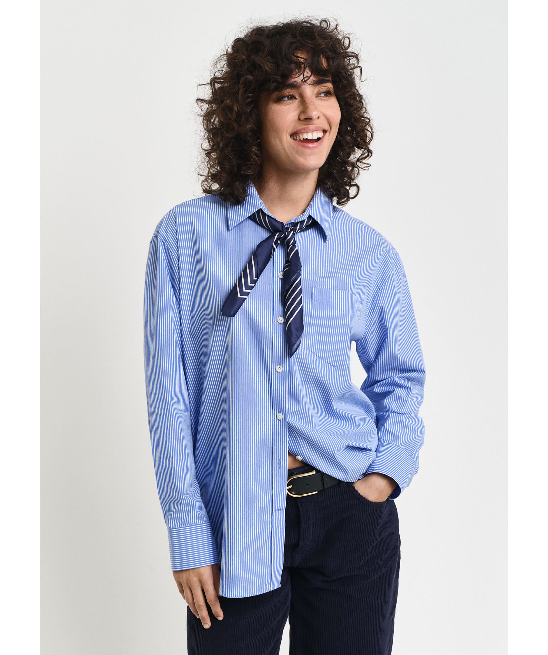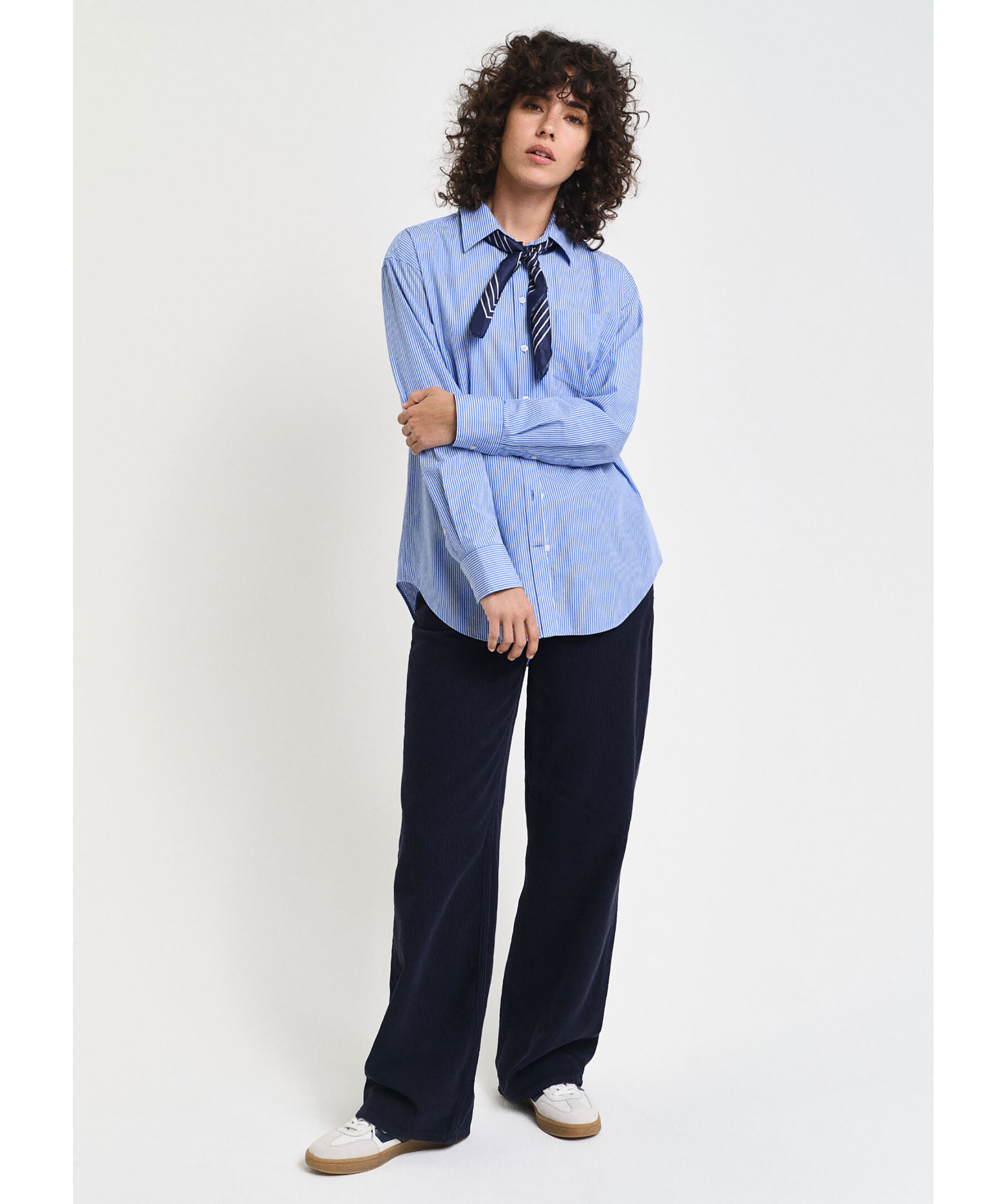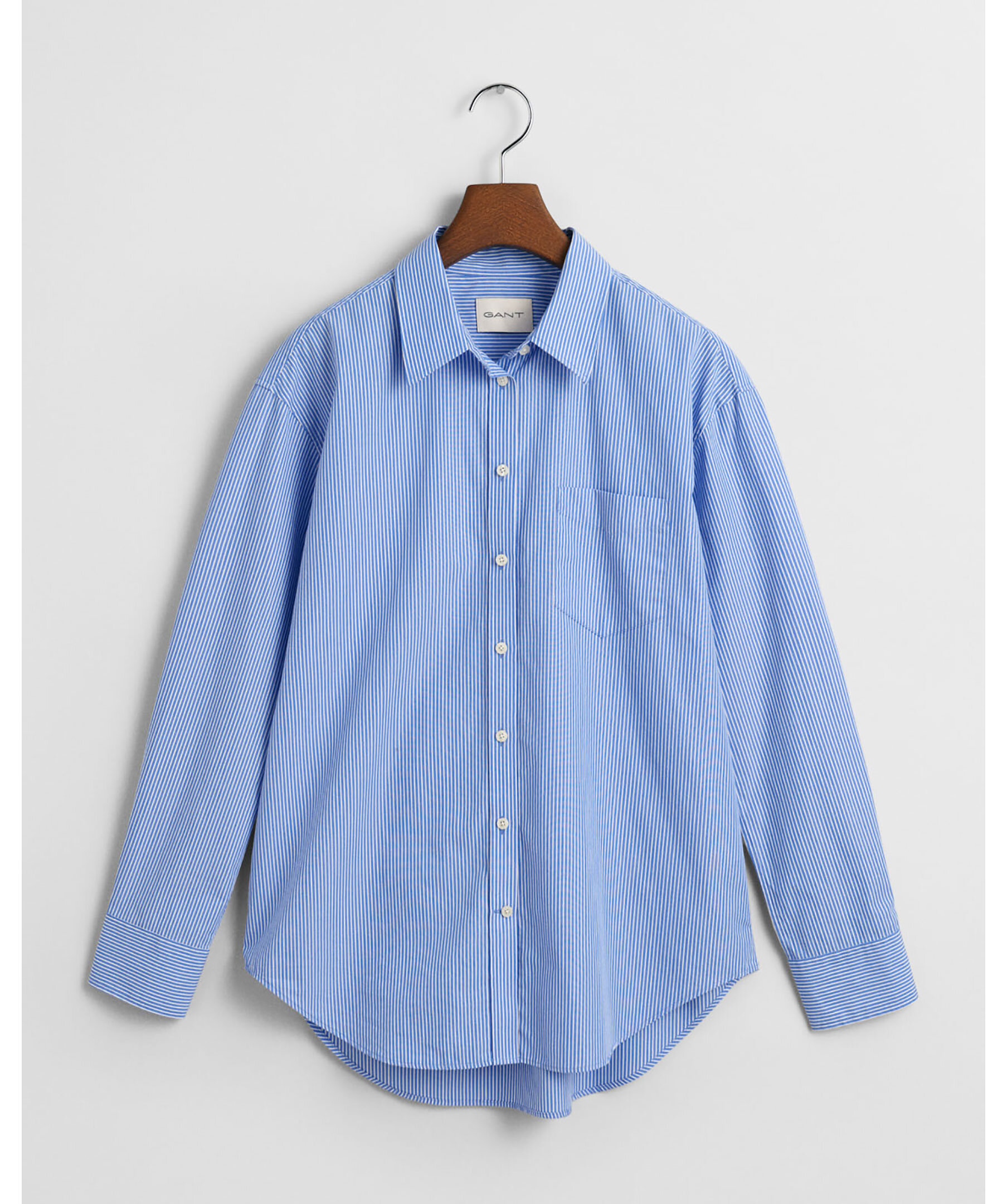 Blå skjorta i mjukt tvättad bomullspoplin med ränder från Gant. Den har en relaxed och elegant silhuett samt point-krage, rundad fåll, bröstficka och en lågmäld GANT-logotyp broderad på ärmen. Styla med chinos eller jeans.