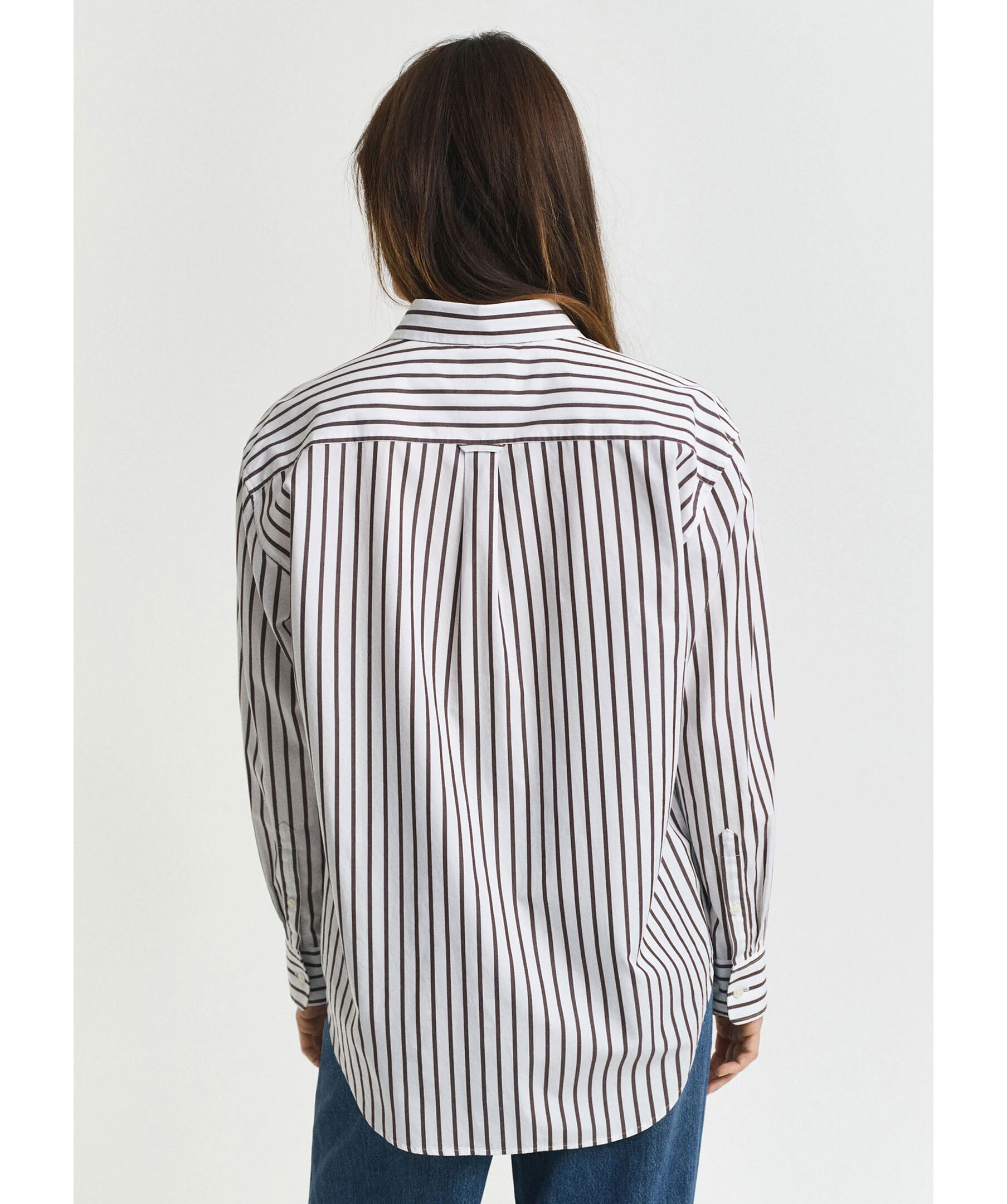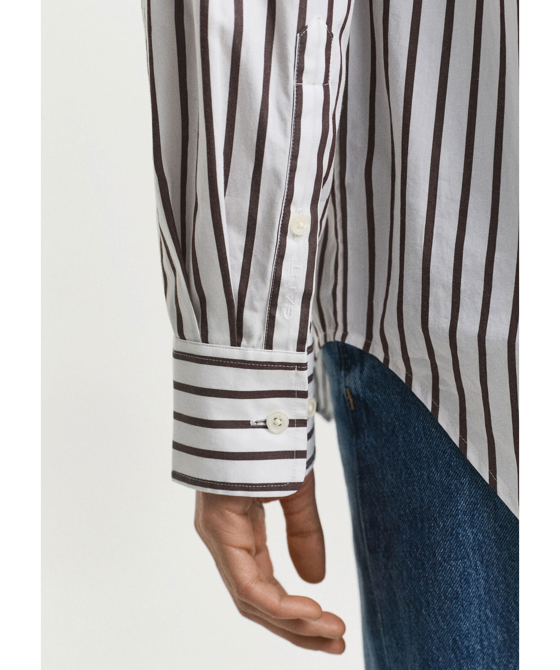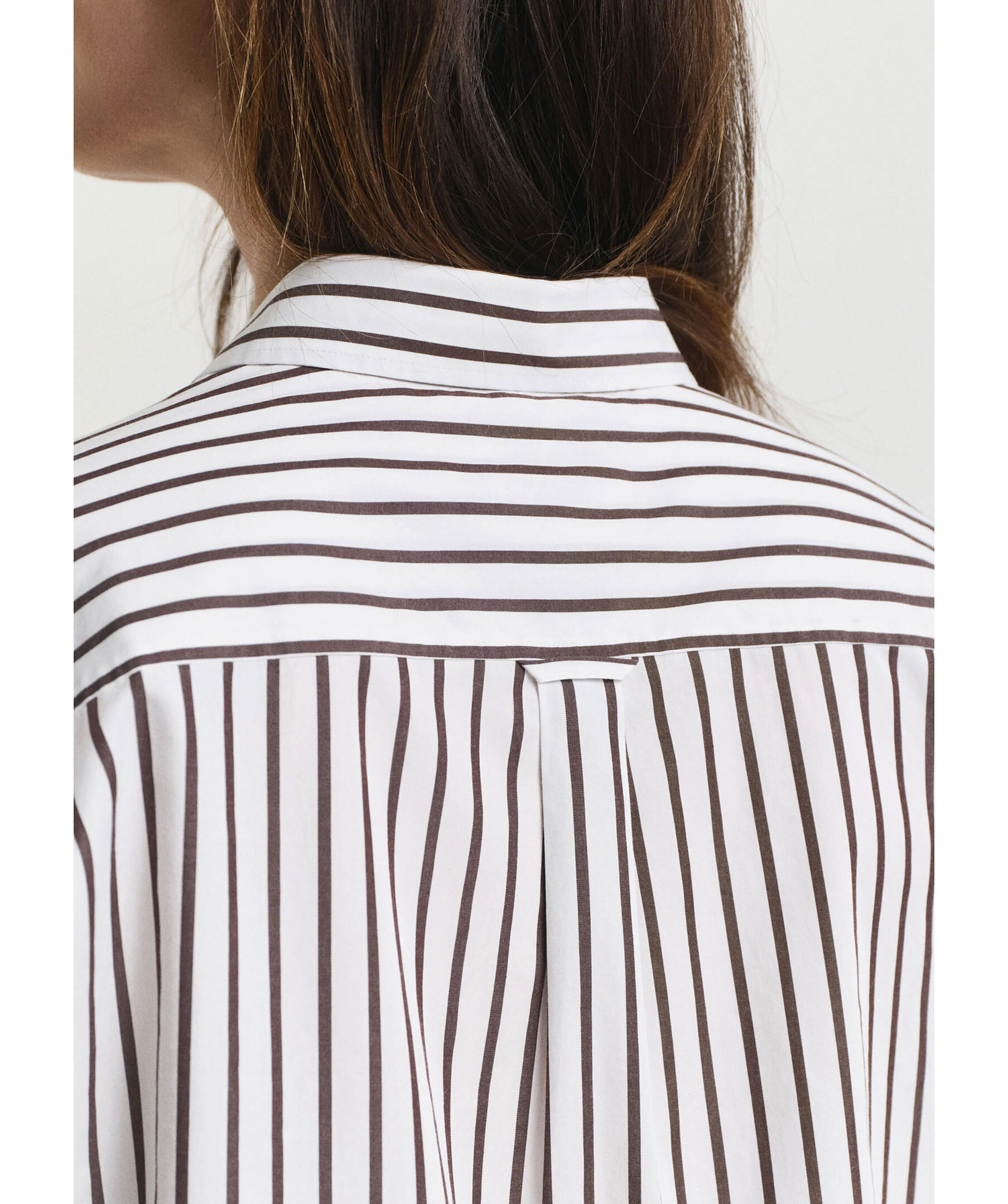 Vit skjorta med bruna ränder från Gant. Den har en relaxed och elegant silhuett samt point-krage, rundad fåll, bröstficka och en lågmäld GANT-logotyp broderad på ärmen. Styla med chinos eller jeans. Tillverkad av 100% bomull.