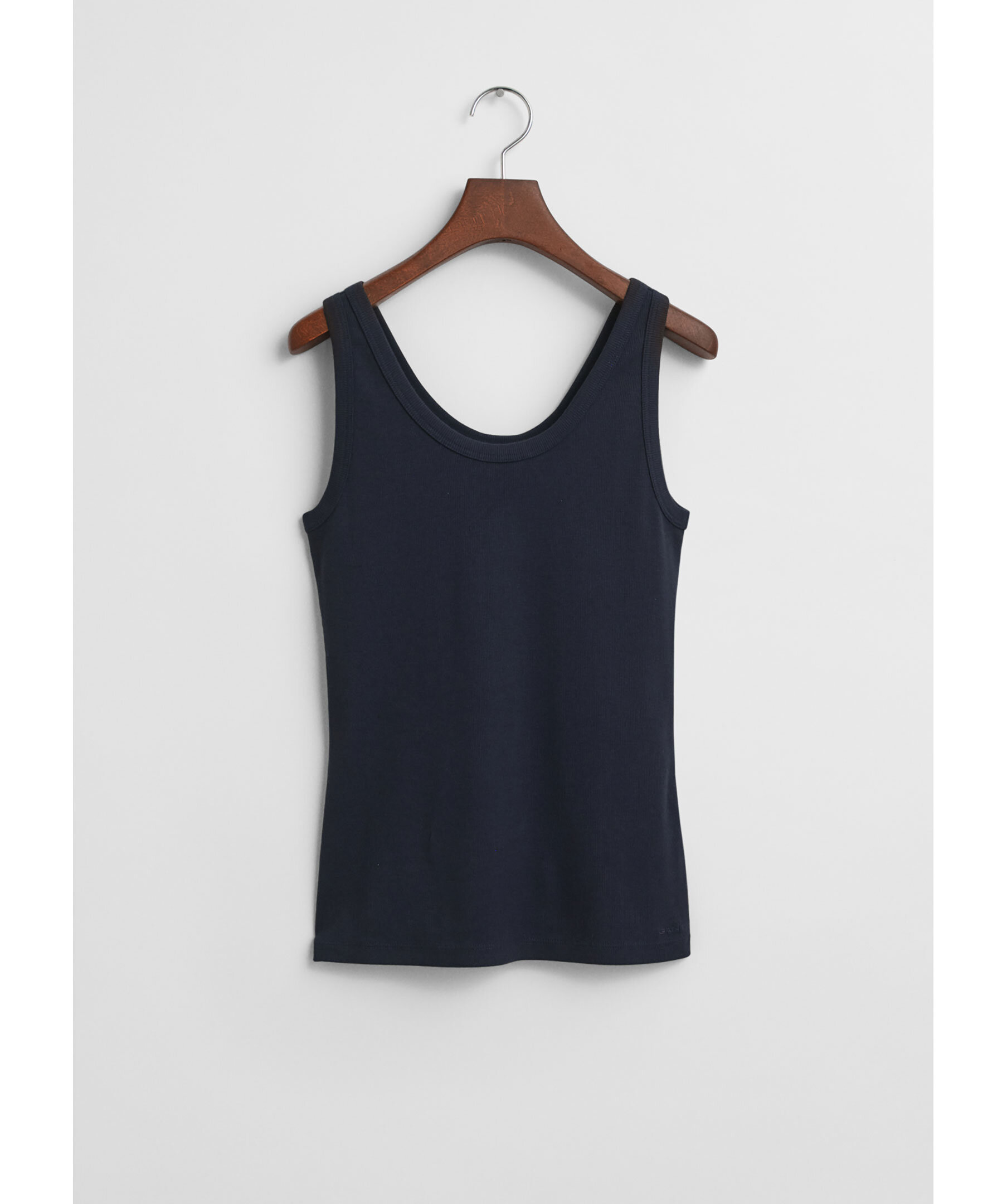 Mörkblå ribbat linne från Gant. Rundad urringning, broderad GANT-logotyp nedtill. Tillverkad i en bomullsblandning.
