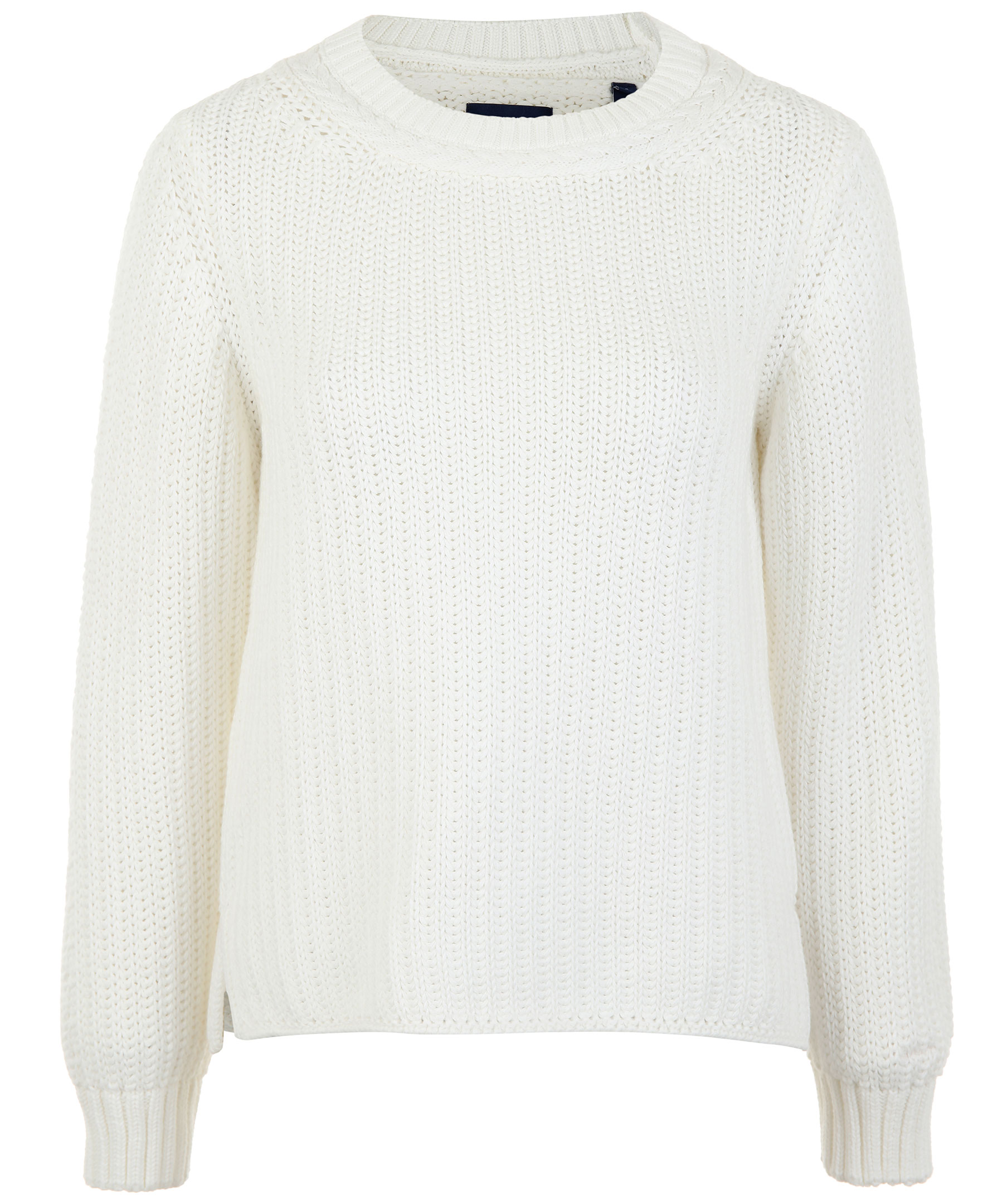 Vit, grovstickad tröja från Gant. Tröjan i rak modell och är stickad med en fläta runt halsringningen och små hål på ärmarna. Ribbad mudd i halsringning och ärmslut samt har små slitsar i plaggslut. Tillverkad i 100% bomull.