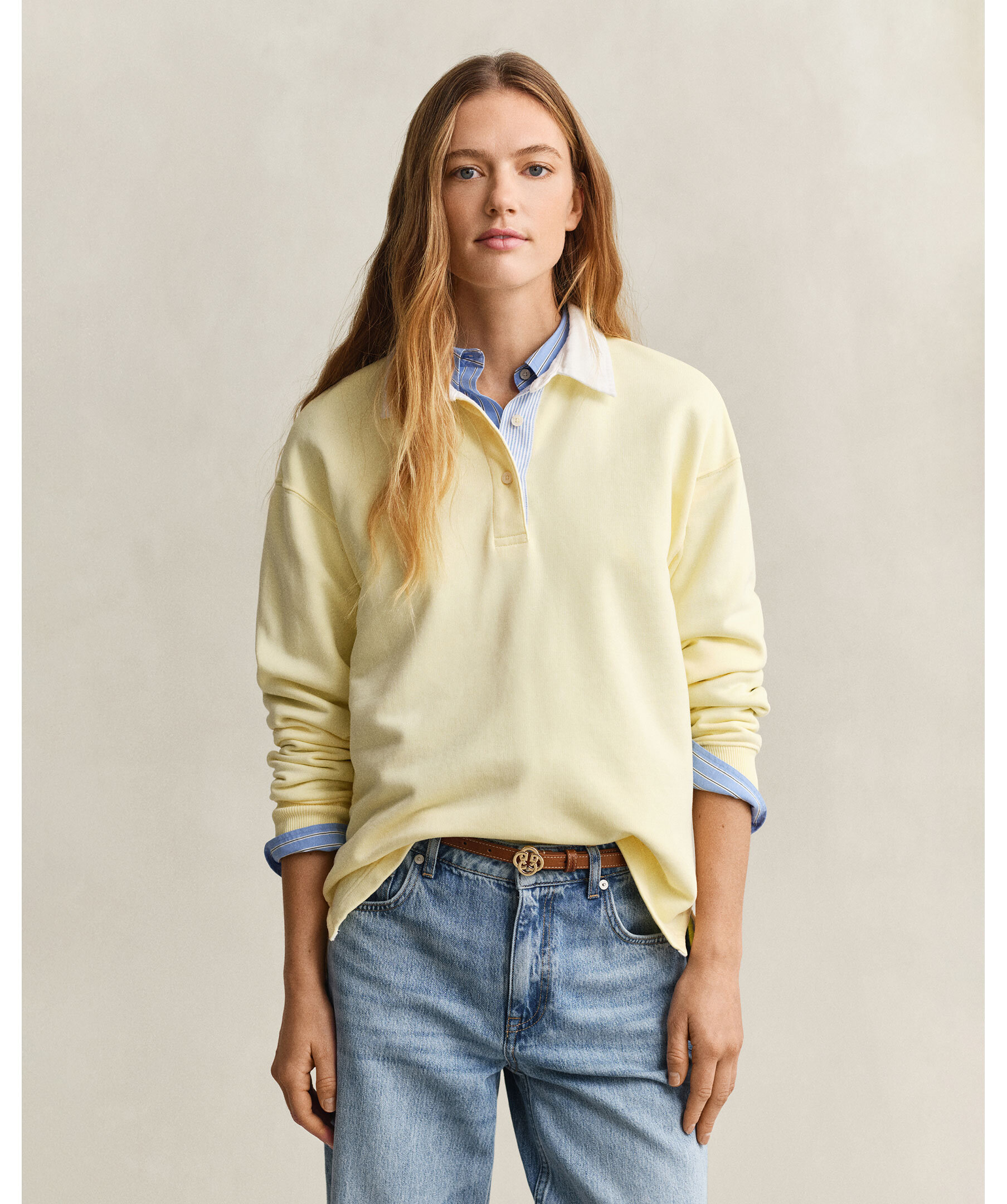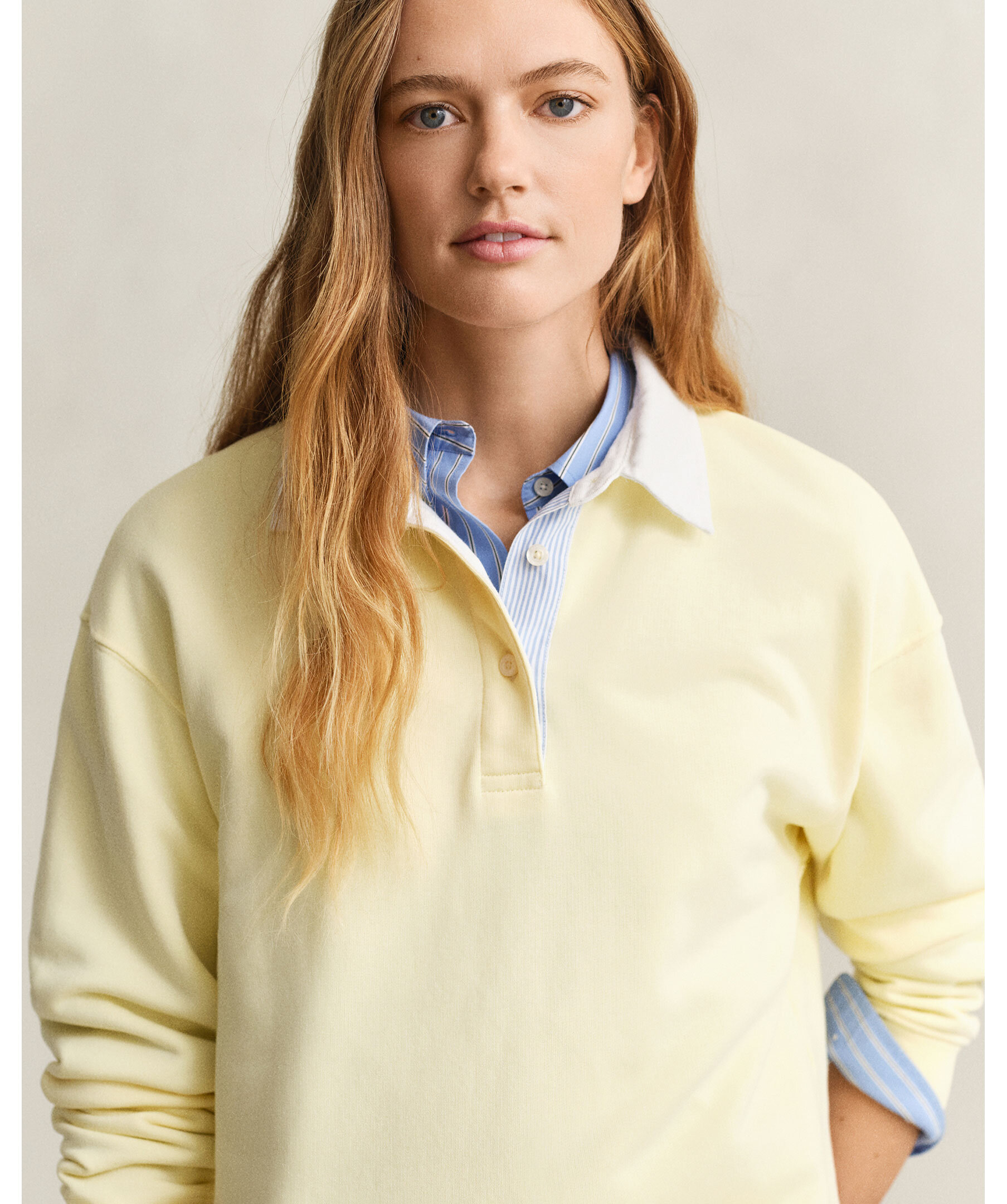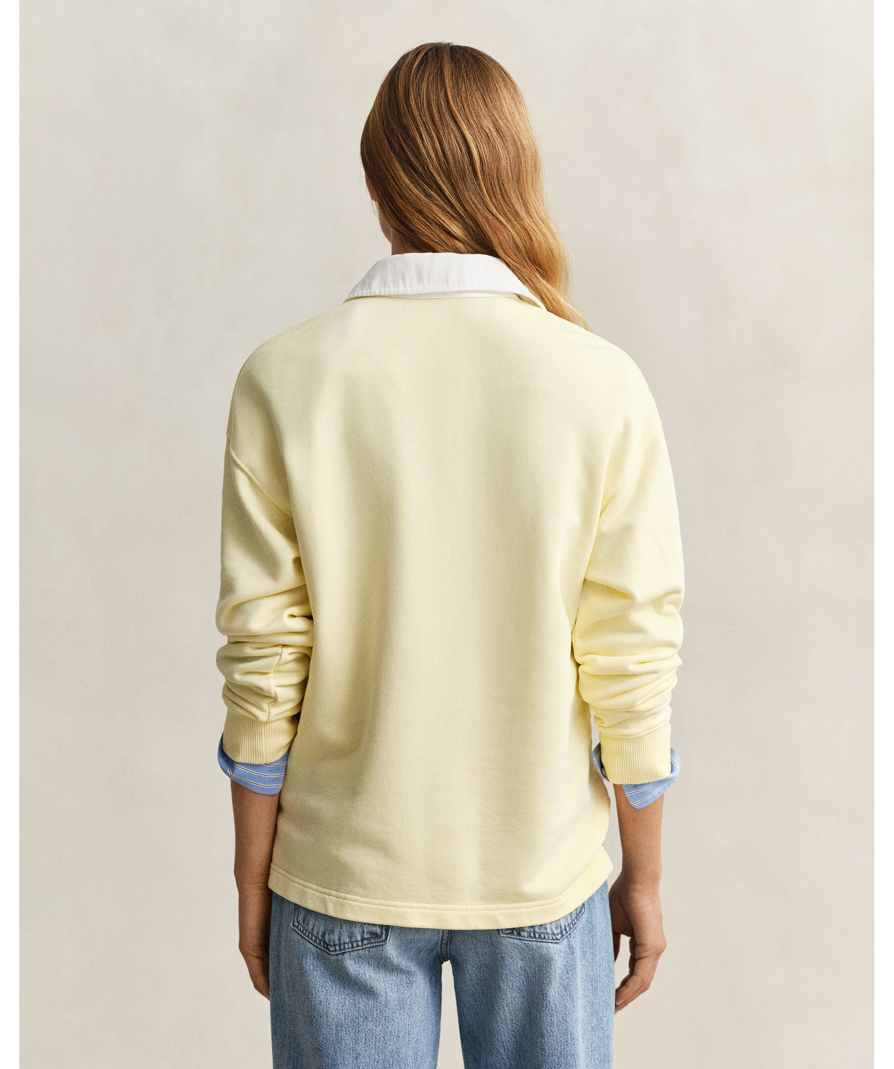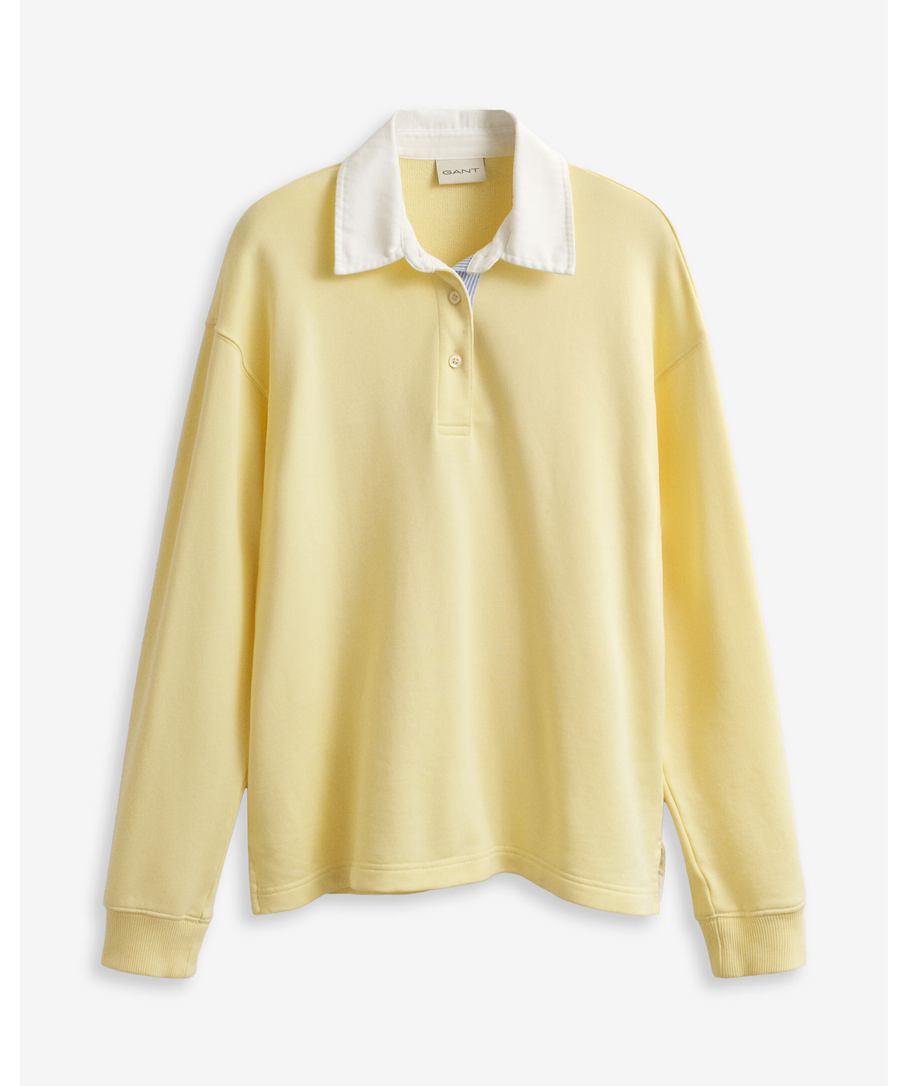 Ljusgul rudgytröja från Gant i mjuk bomulls- och lyocellblandning. Relaxed fit med twillkrage, randig vävd knappslå, ribbade manschetter och knappar i återvunnen polyester. Ton-i-ton brodyr på ärmen ger en subtil märkning. För en tajtare passform rekommenderas en storlek mindre.