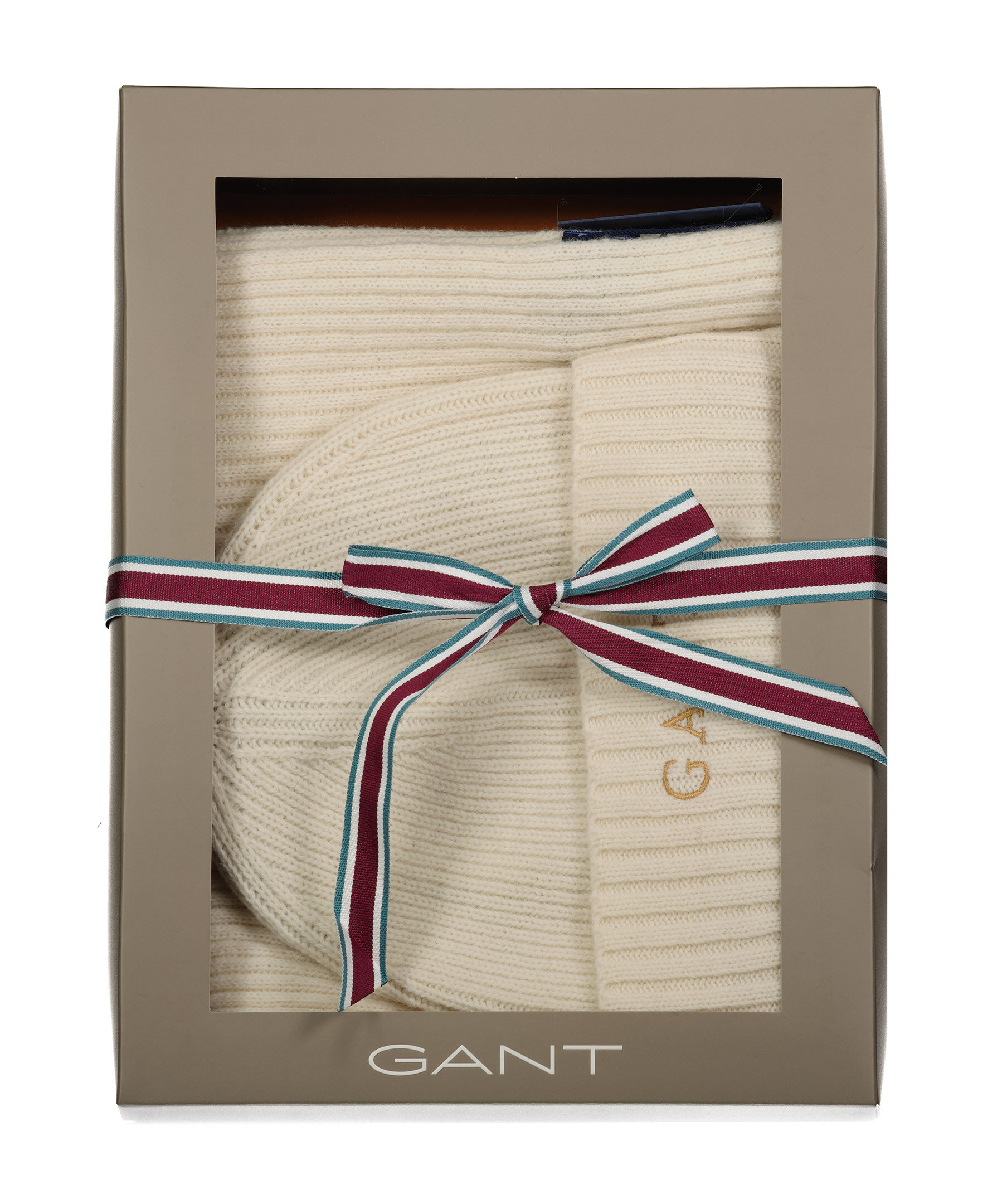 Krämvitt set med kabelstickad mössa och halsduks från Gant. Broderad logotyp i beige. Mössan är fodrad med jersey-tyg. Levereras i present förpackning.