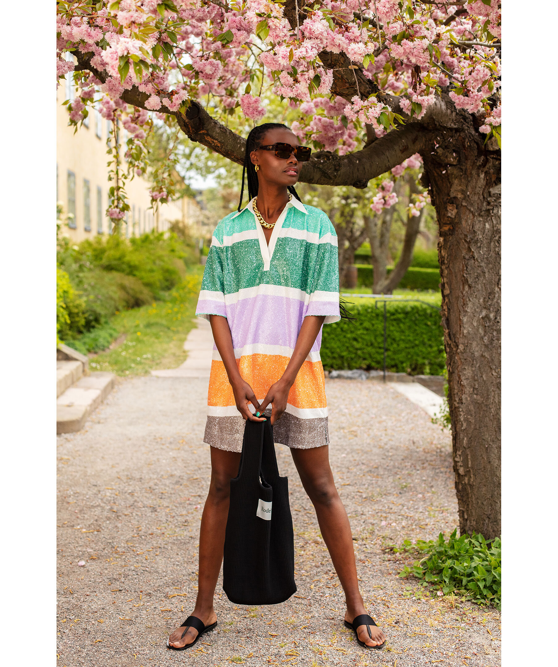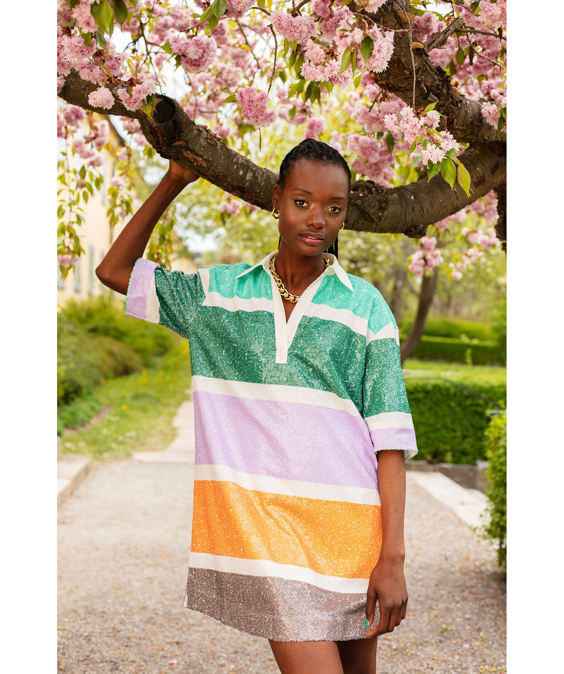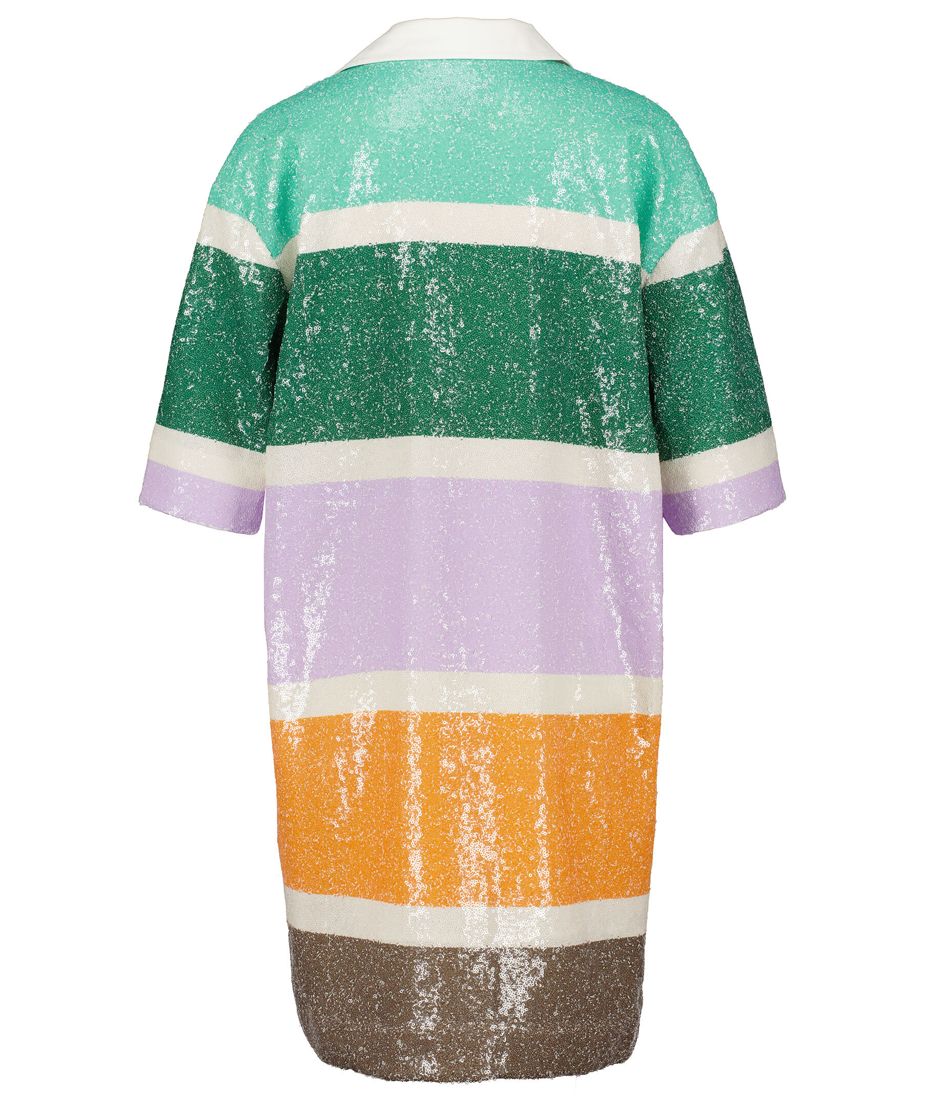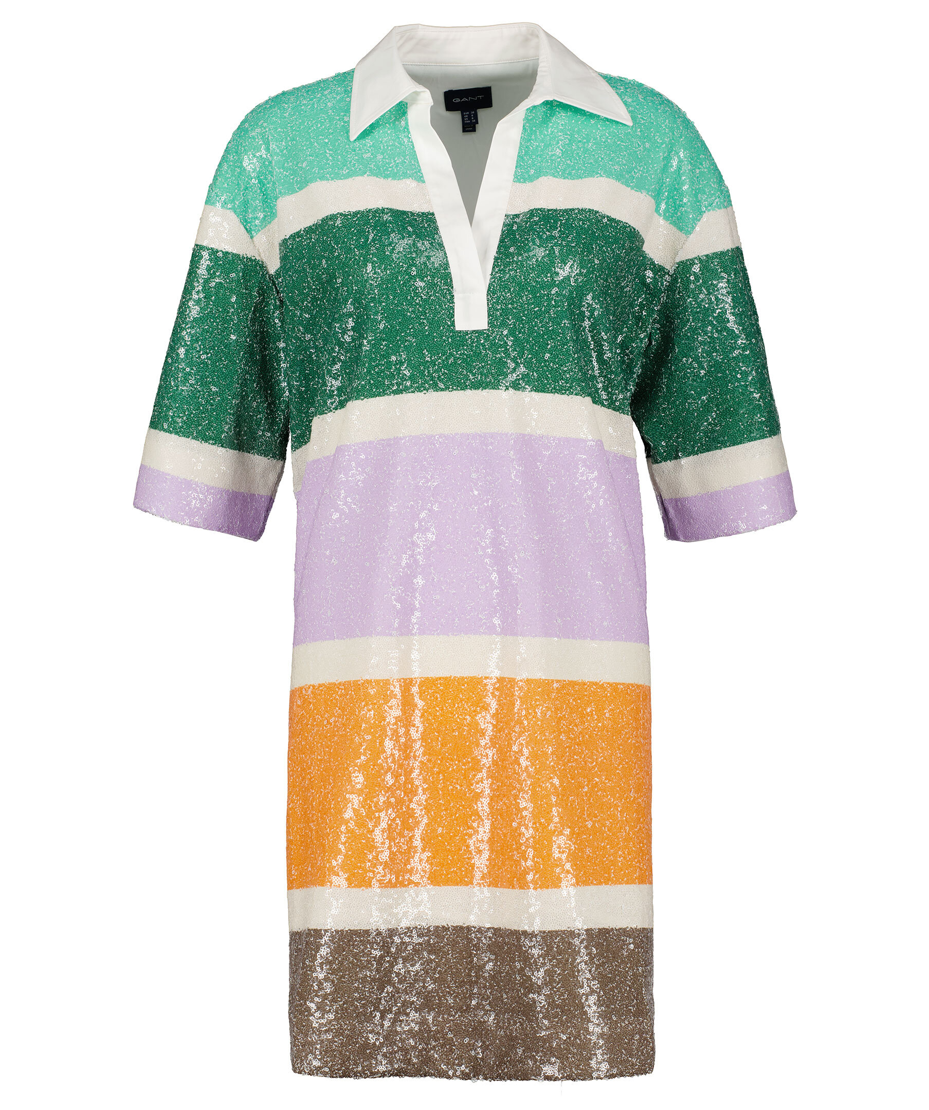 Lila, grön, vit, grå och orange paljettklänning i piké modell från Gant. Öppen knappslå utan knappar, spetsig twillkrage.