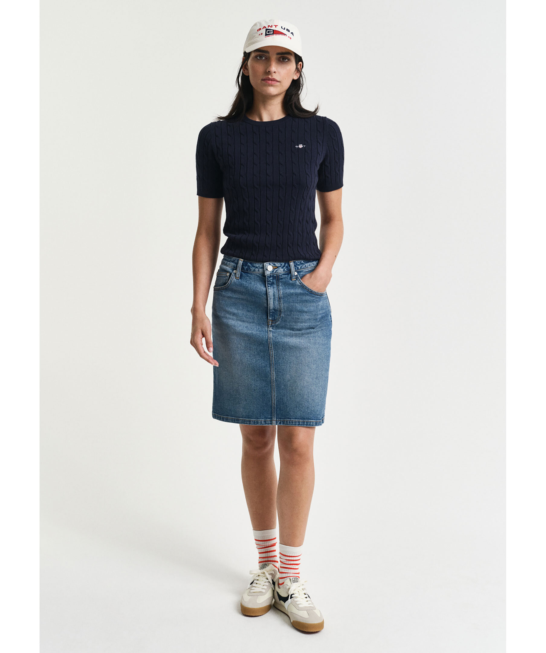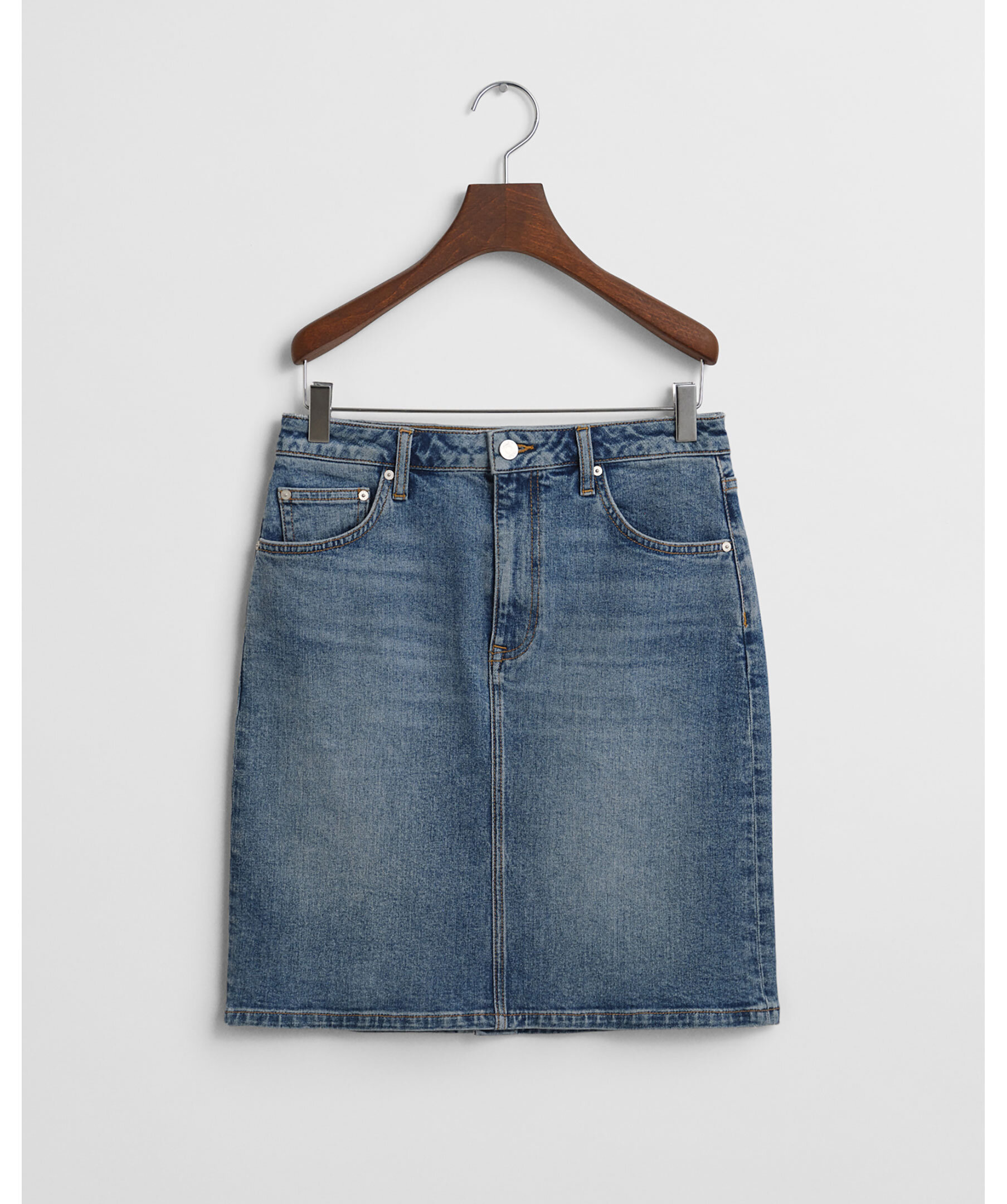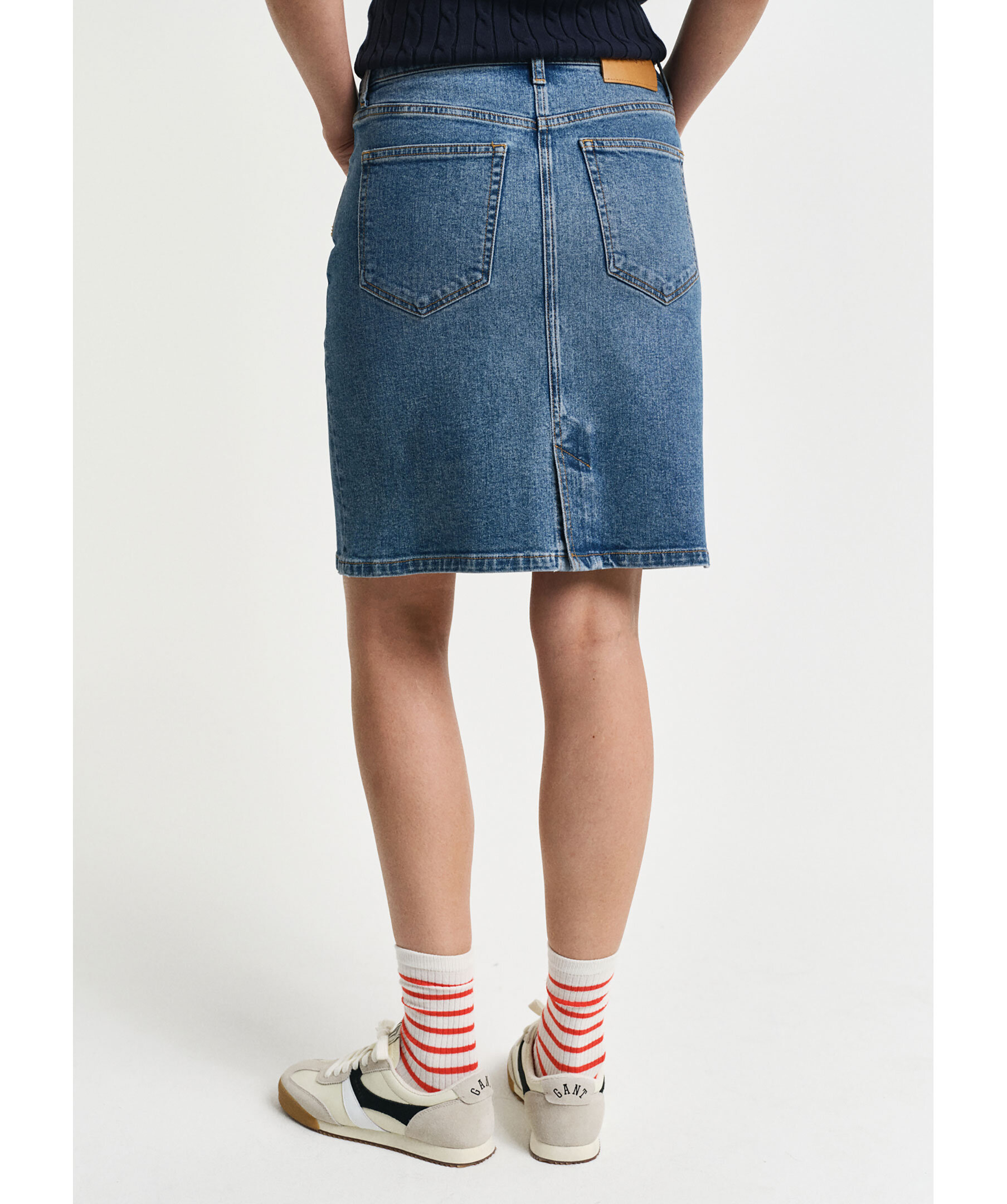Blå denimkjol från Gant i en kort modell. Kjolen har mellanhög midja med bälteshällor, två framfickor, två bakfickor och sprund baktill. Tillverkad i en bomullsblandning.