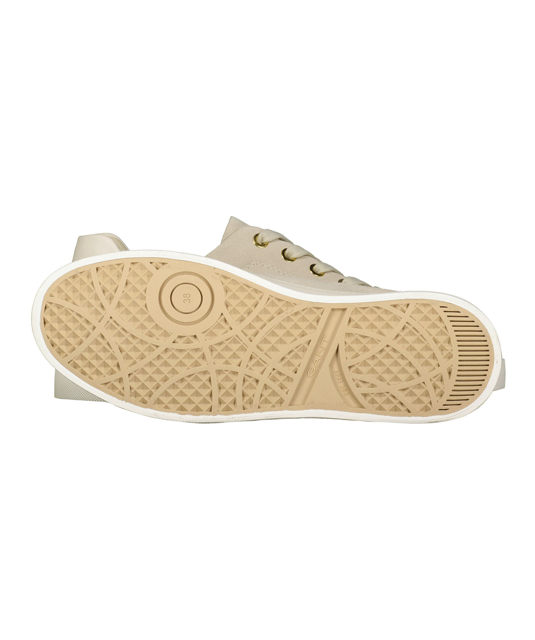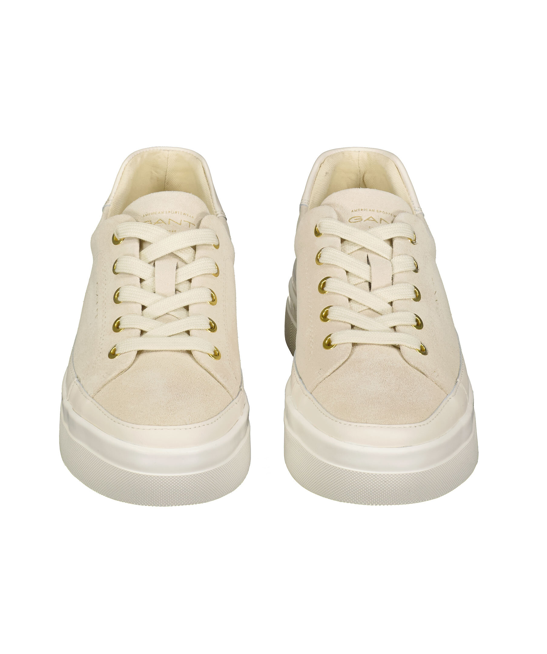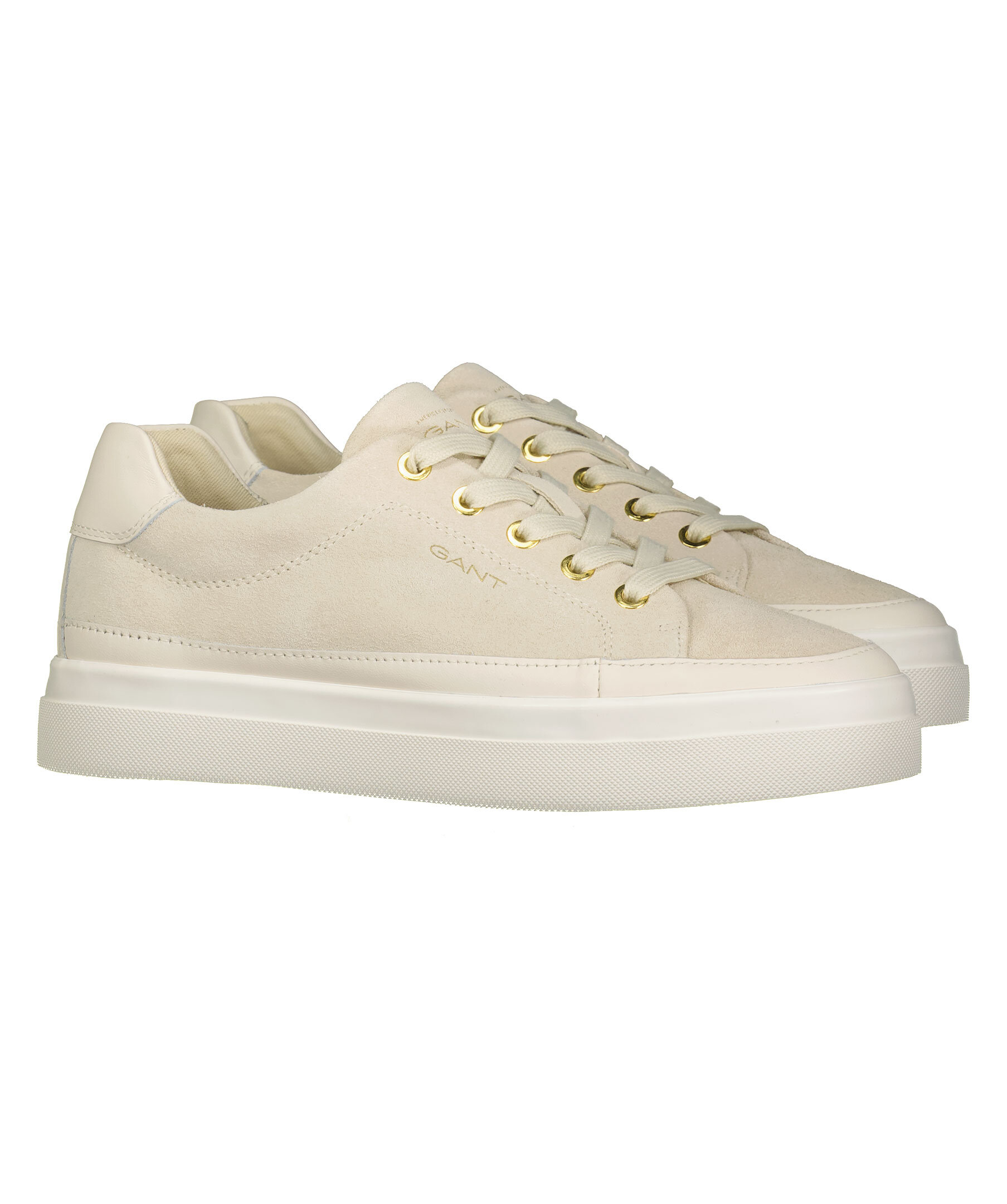 Beigea sneakers i mocka från Gant Footwear. Guldfärgade öglor i metall för snörning. Guldfärgade embossade logotyper på plösen, hälen samt skons yttersida. Detaljer i läder på hälen, runt om skon.