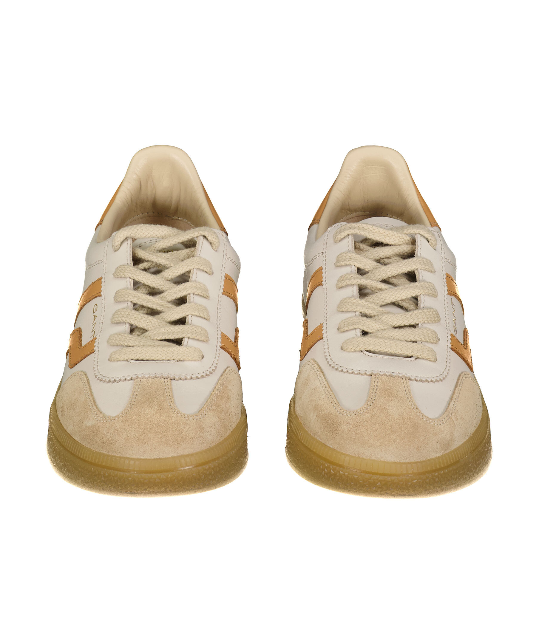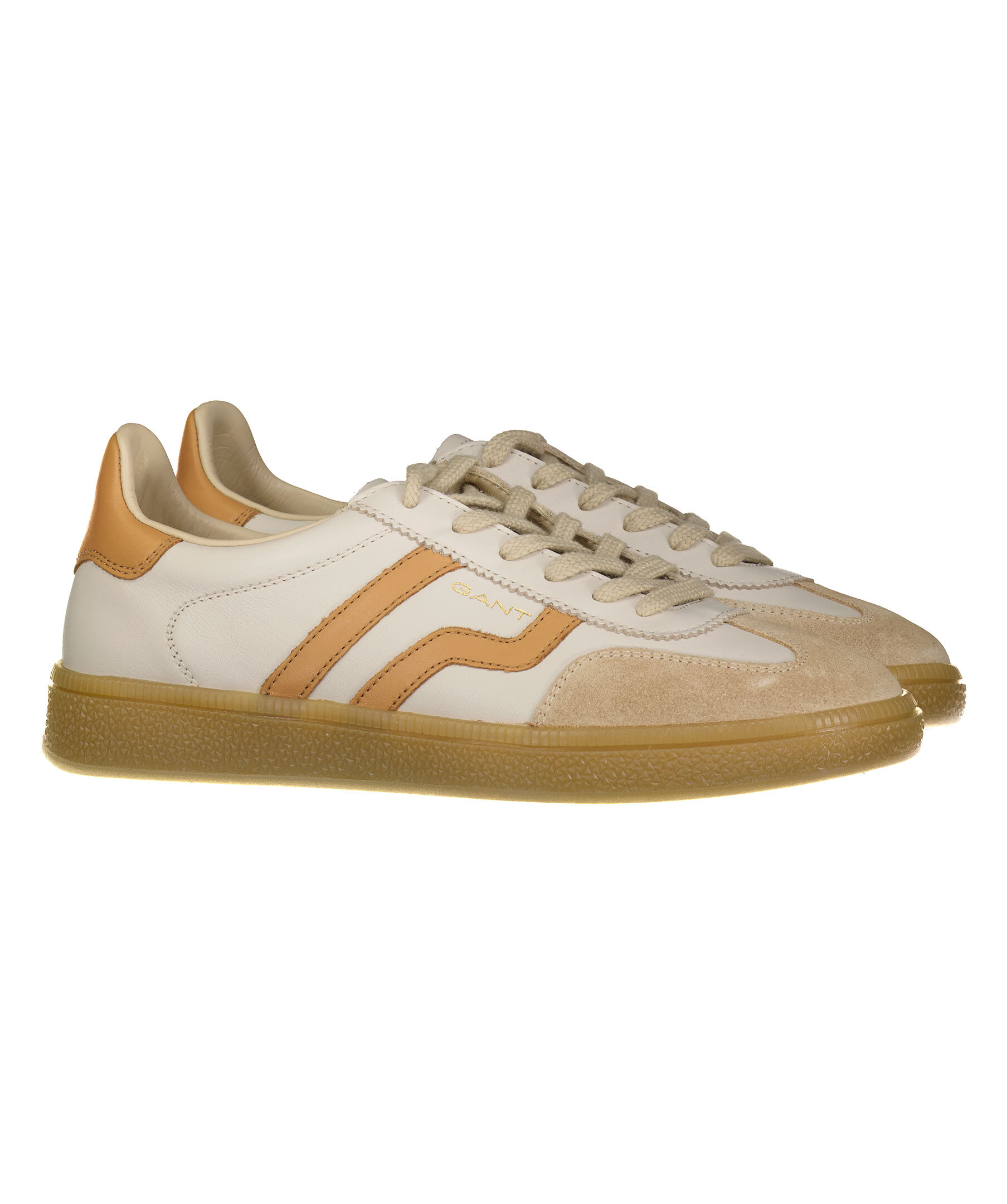 Beigea sneakers i läder från Gant. Detalj i mocka framtill på tån. Kamelfärgade deilajer i läder på skons sidor samt på hälen. Platta skosnören. Embossad, guldfärgad logotyp på skons yttersida. Sula i gummi. Insidan av skon i läder och bomull. Vintage inspirerad design.